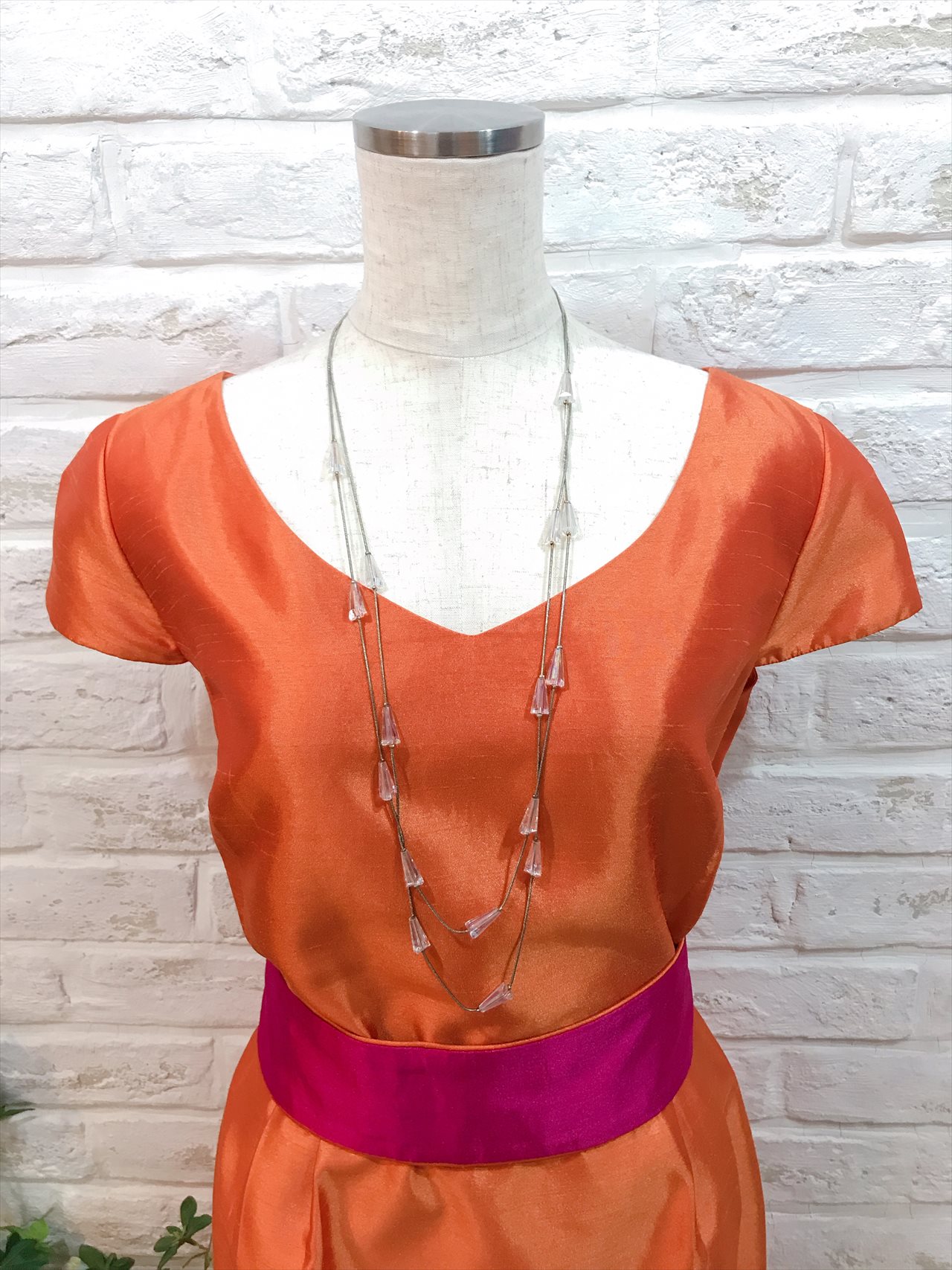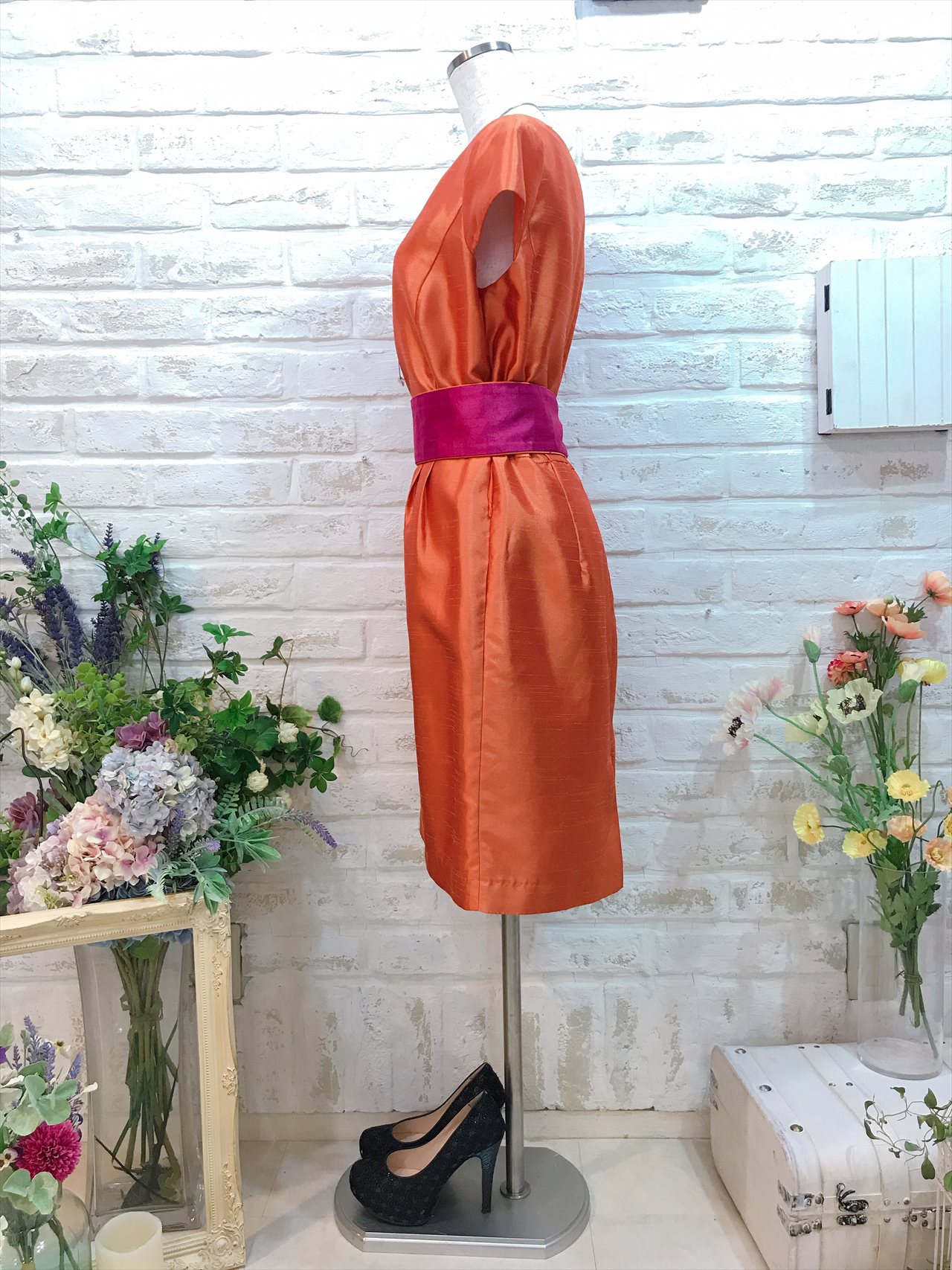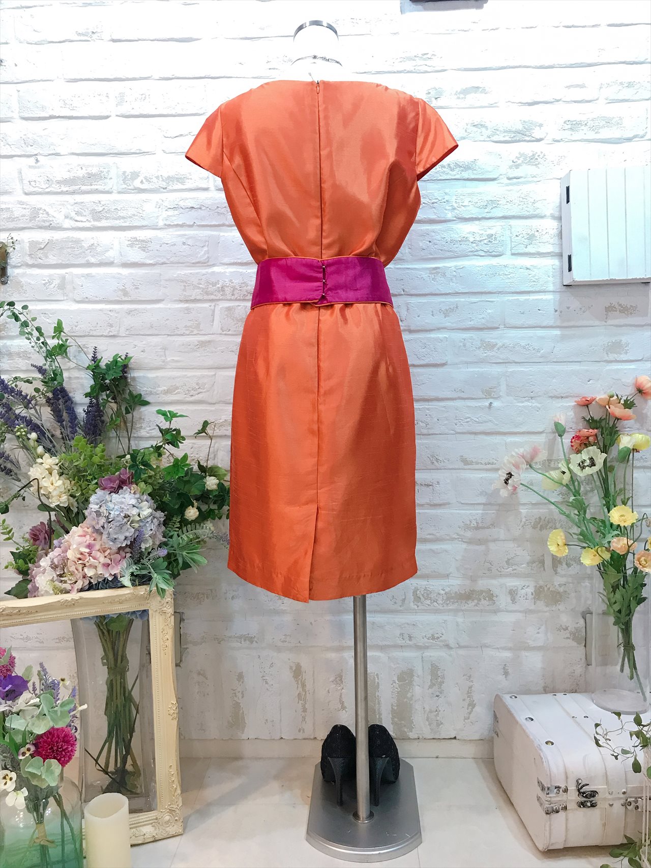 シャリ感のある光沢素材がエレガントなドレス。袖ありで安心なデザインと、胸元の大きめのVカットがすっきりと着こなすことができます。ウエストの鮮やかなピンクのベルトが印象的で、タイトラインのスカートもエレガントな一着。ベルトはリバーシブルでオレンジ色で合わせることも可能です。