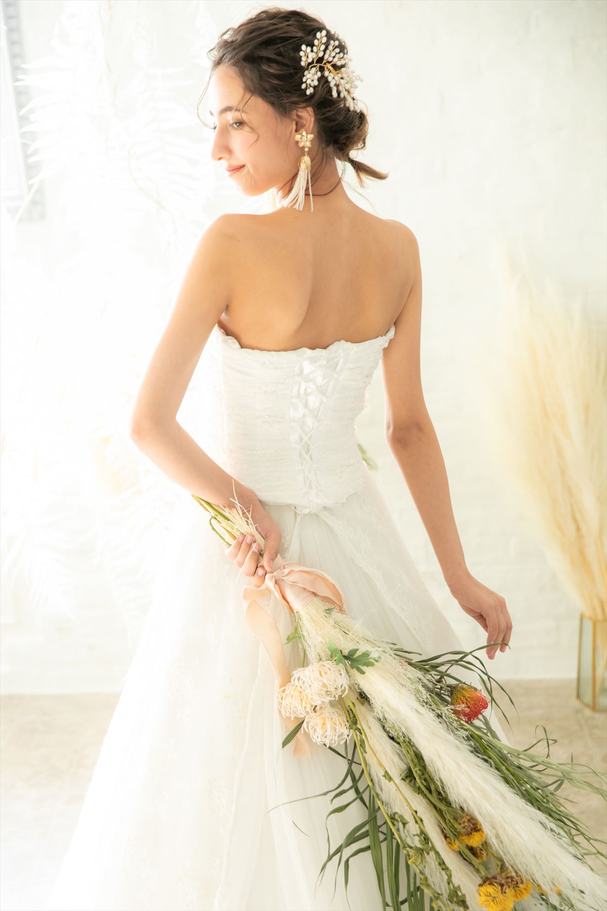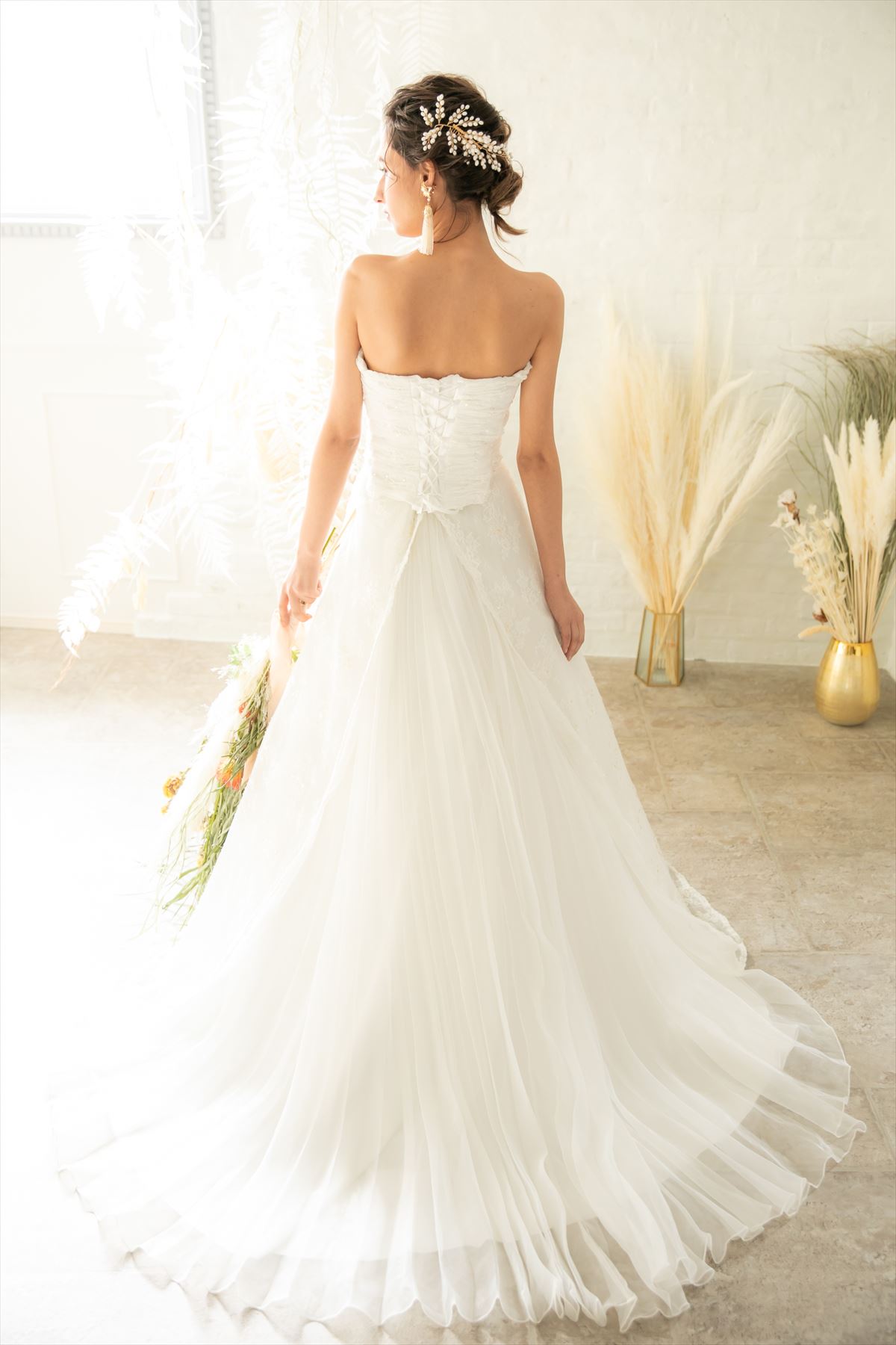 白の後ろにレーンのあるウェディングドレス。1.5次会・2次会花嫁様にお勧めなドレスです。全体にビーズやスパンコールが上品に装飾されております。チュールレースにレーンはプリーツになっており後ろから見てもとても華やかなウェディングドレスです。また編み上げになっており、中生地にもゴムがついているためお客様のおサイズに合わせてウエストやバストの微調整が可能なドレスになっております。L~XXXLサイズまで調整が可能です。