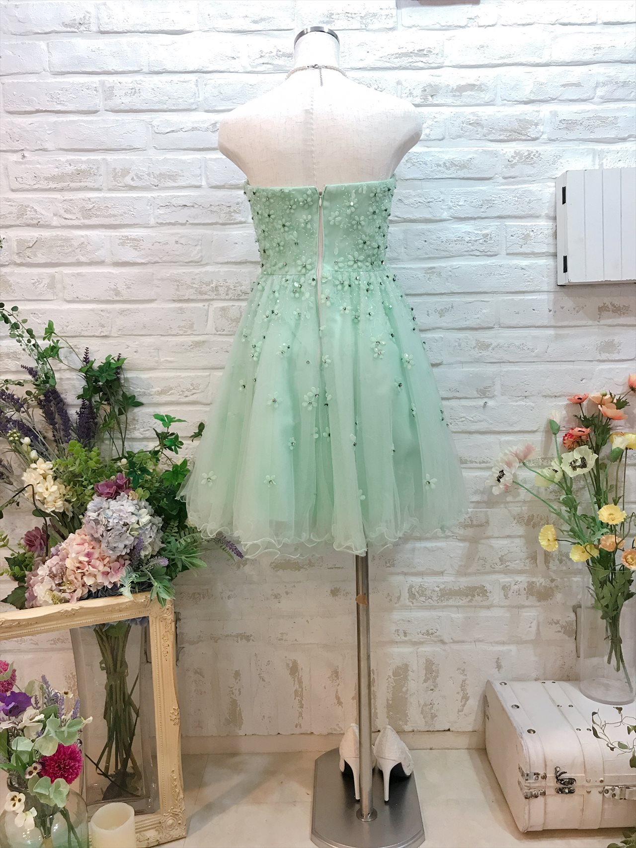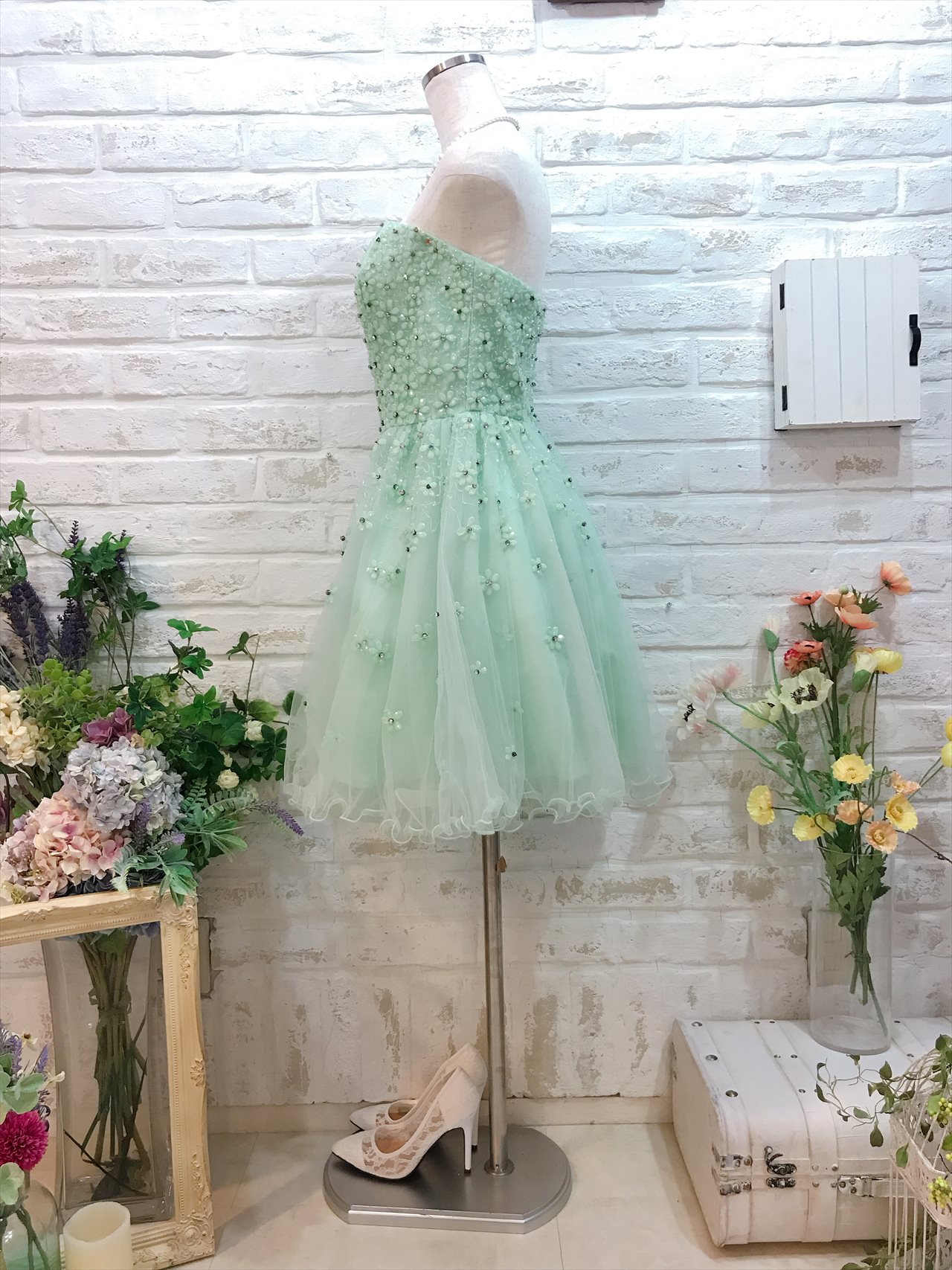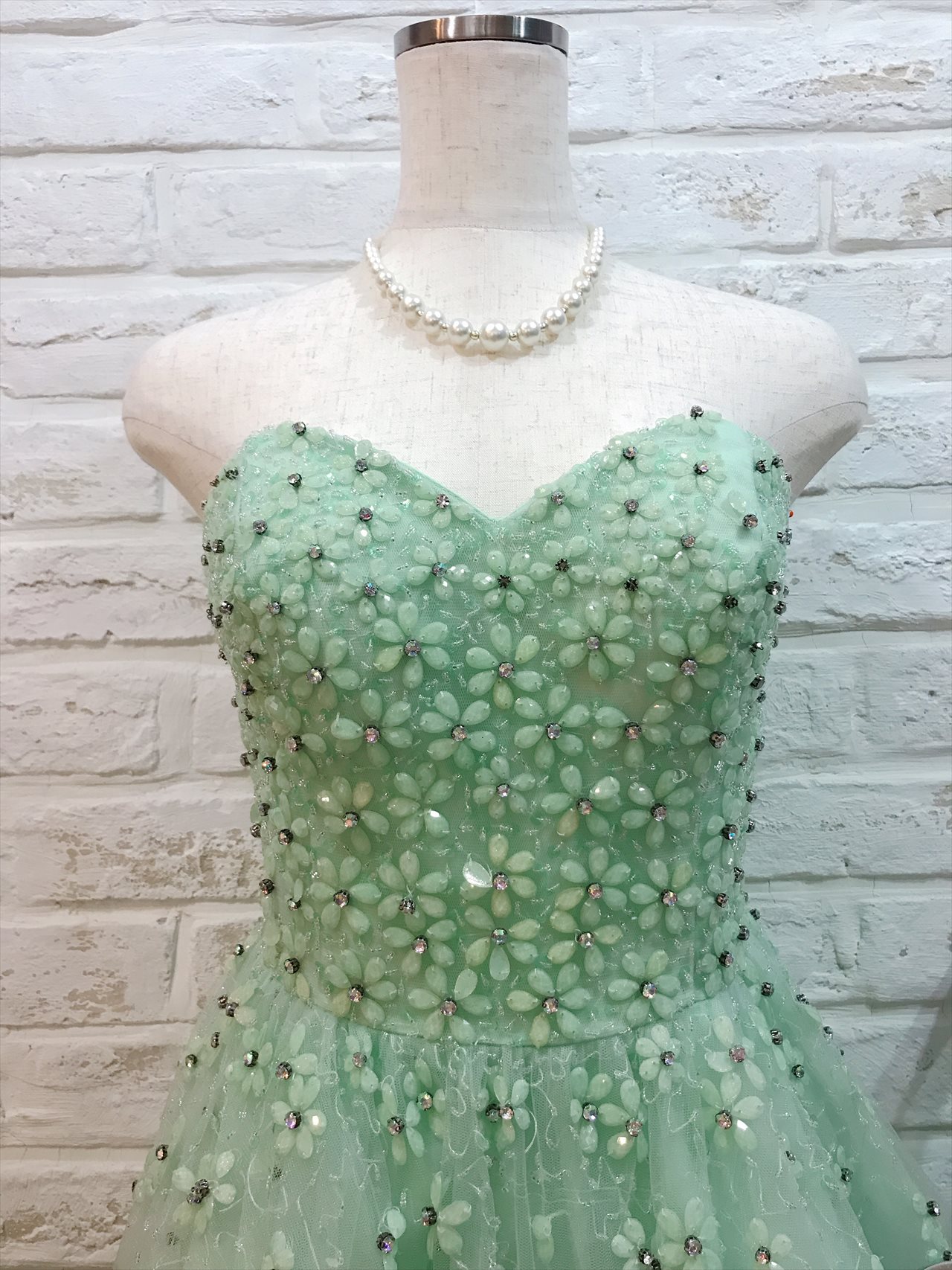 鮮やかなミントグリーンが印象的なミニ丈ベアドレス。ドレス全体にビジューでお花模様が施されていて女子会やパーティーでは華やかに着こなせること間違いなしです!パステルカラーなので可愛いらしく、優しく柔らかいカラーなので女性らしい雰囲気が演出できます。