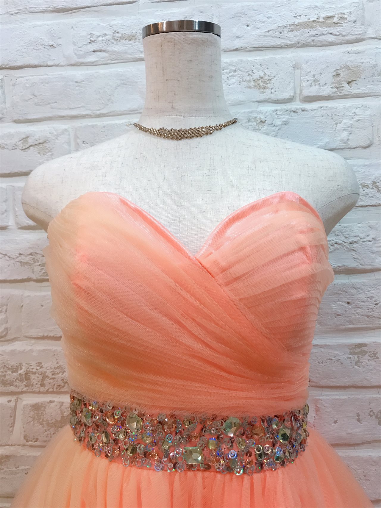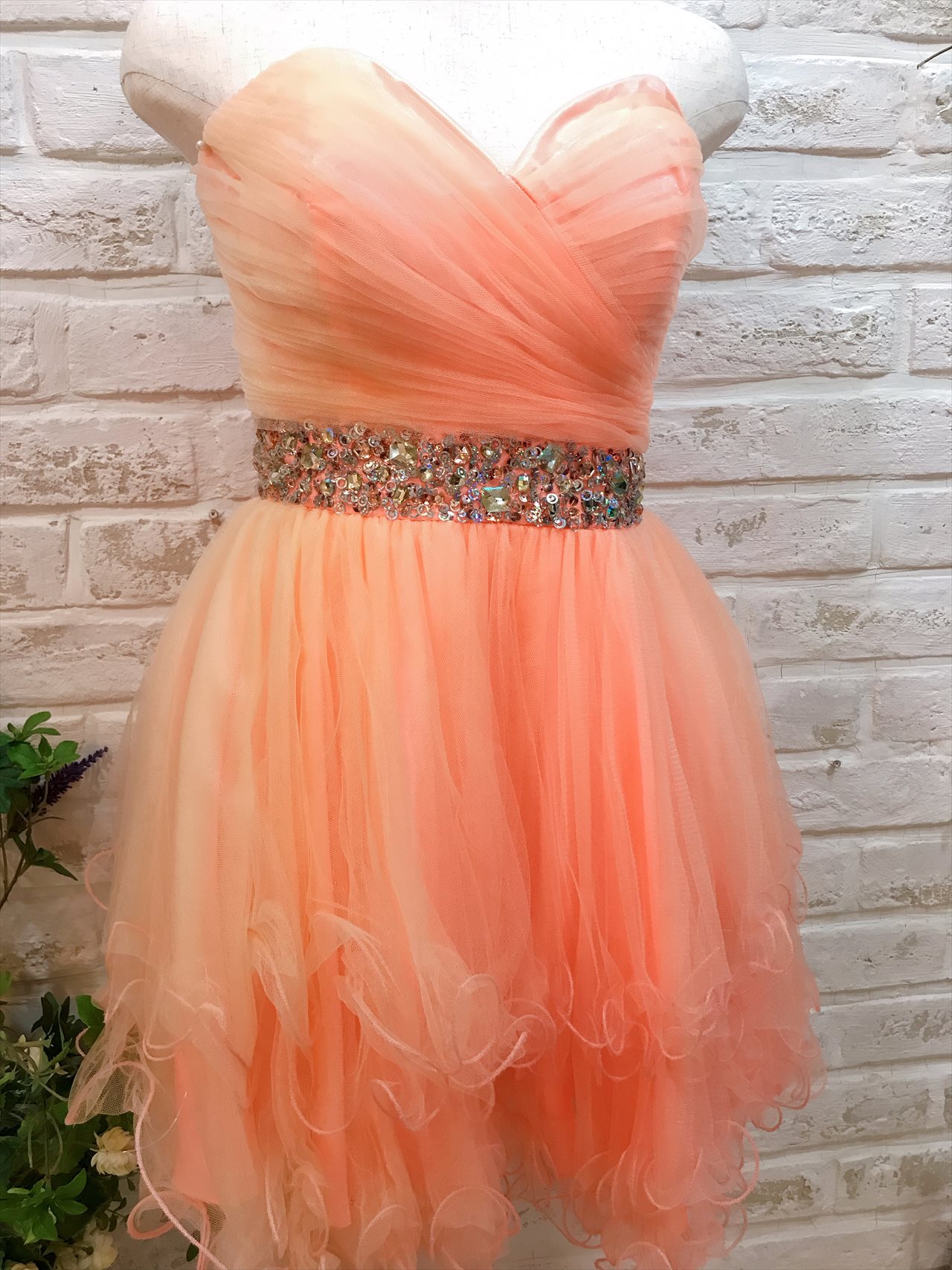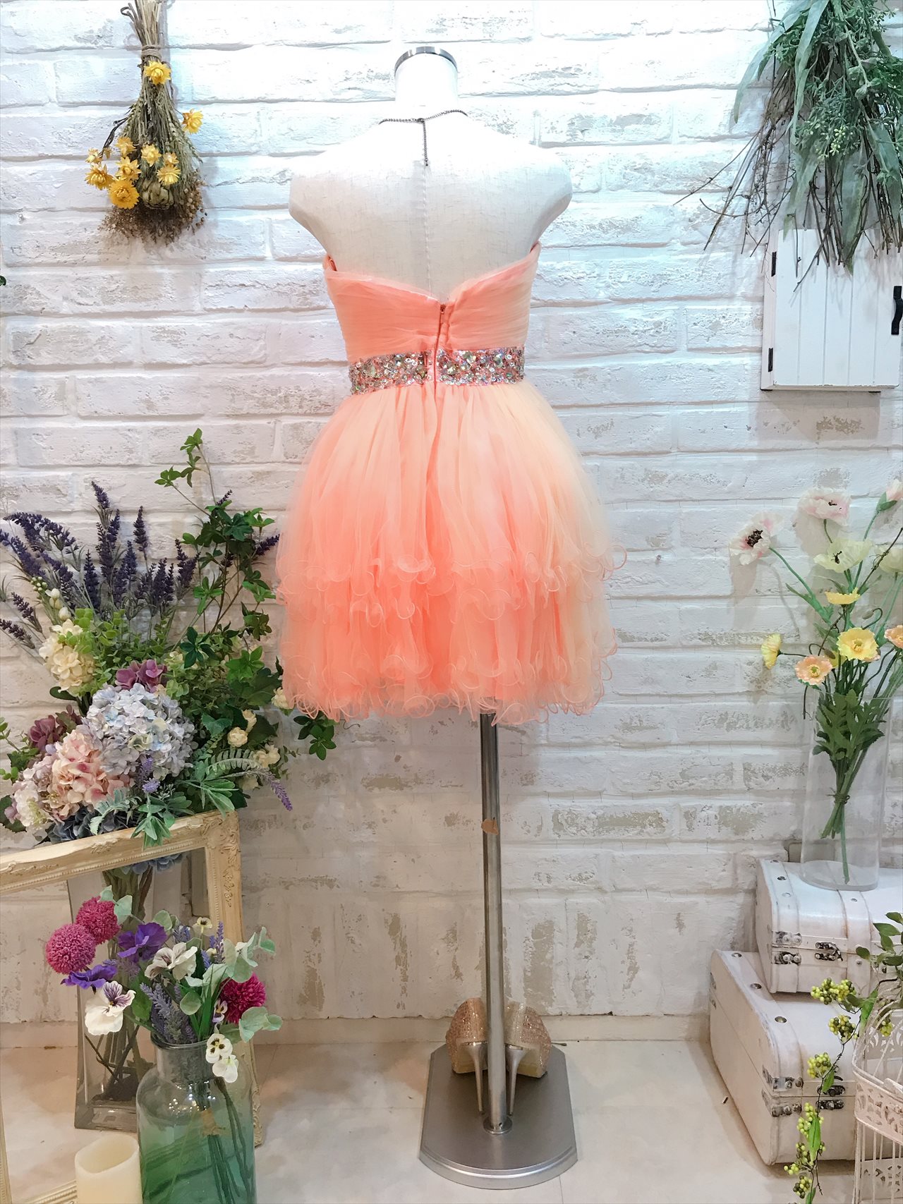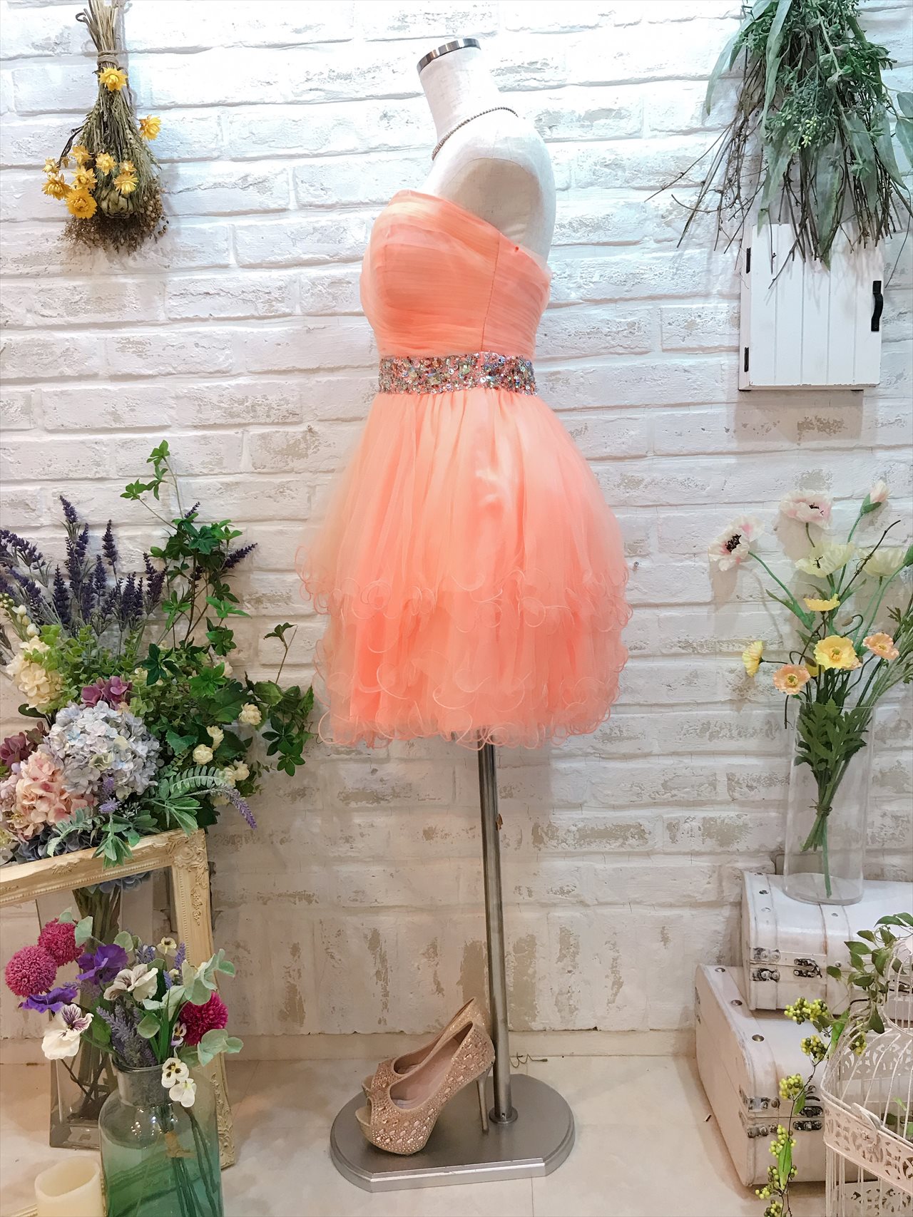 元気なコーラルピンクがヘルシーで可愛いミニ丈ドレス。謝恩会などにもおすすめです。オレンジと好相性のゴールドを合わせてゴージャスな雰囲気も楽しめる20代の方にオススメなコーディネイトです。チュール素材が何層にもなっているためパニエなしでも綺麗なプリンセスラインがでます。ウエストはしっかりしまったデザインなため大変綺麗なラインのドレスです。