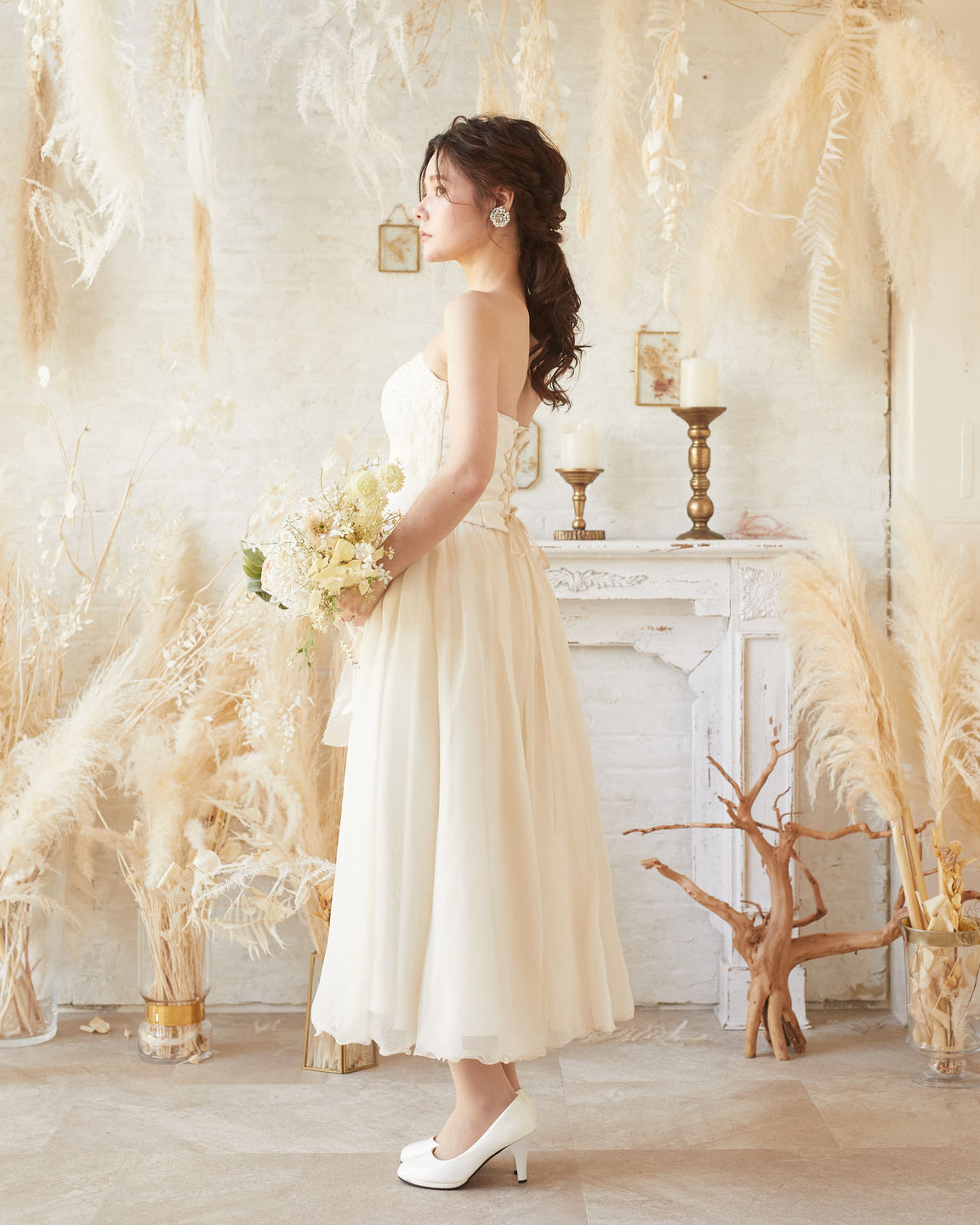 オフホワイトのミモレ丈ウェディングドレス。ミモレ丈~アンクル丈なので動き易く、1.5次会・2次会花嫁さんにお勧めなドレスです。胸元のパールが上品に装飾されております。後ろは編み上げになっており、中生地にもゴムがついているためお客様のおサイズに合わせてウエストやバストの微調整が可能なドレスになっております。XS~XXLサイズまで調整が可能です。