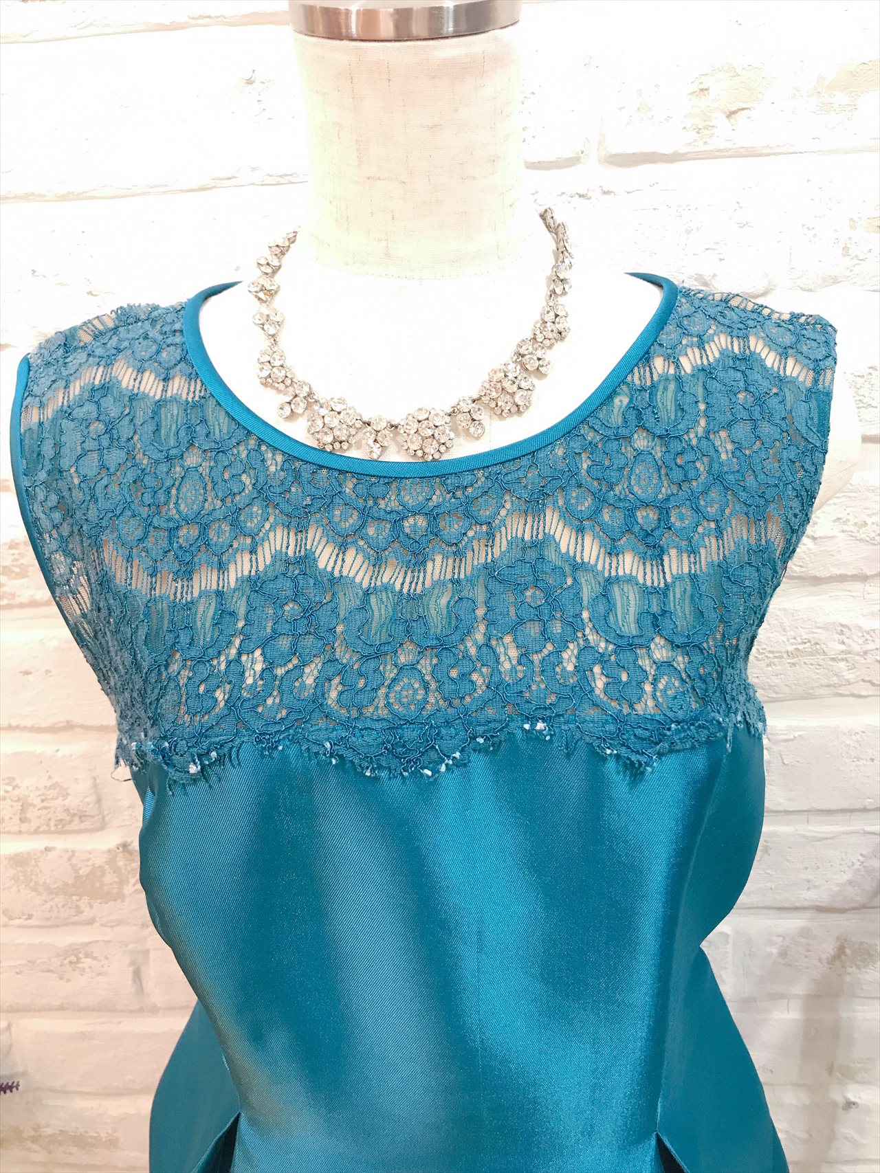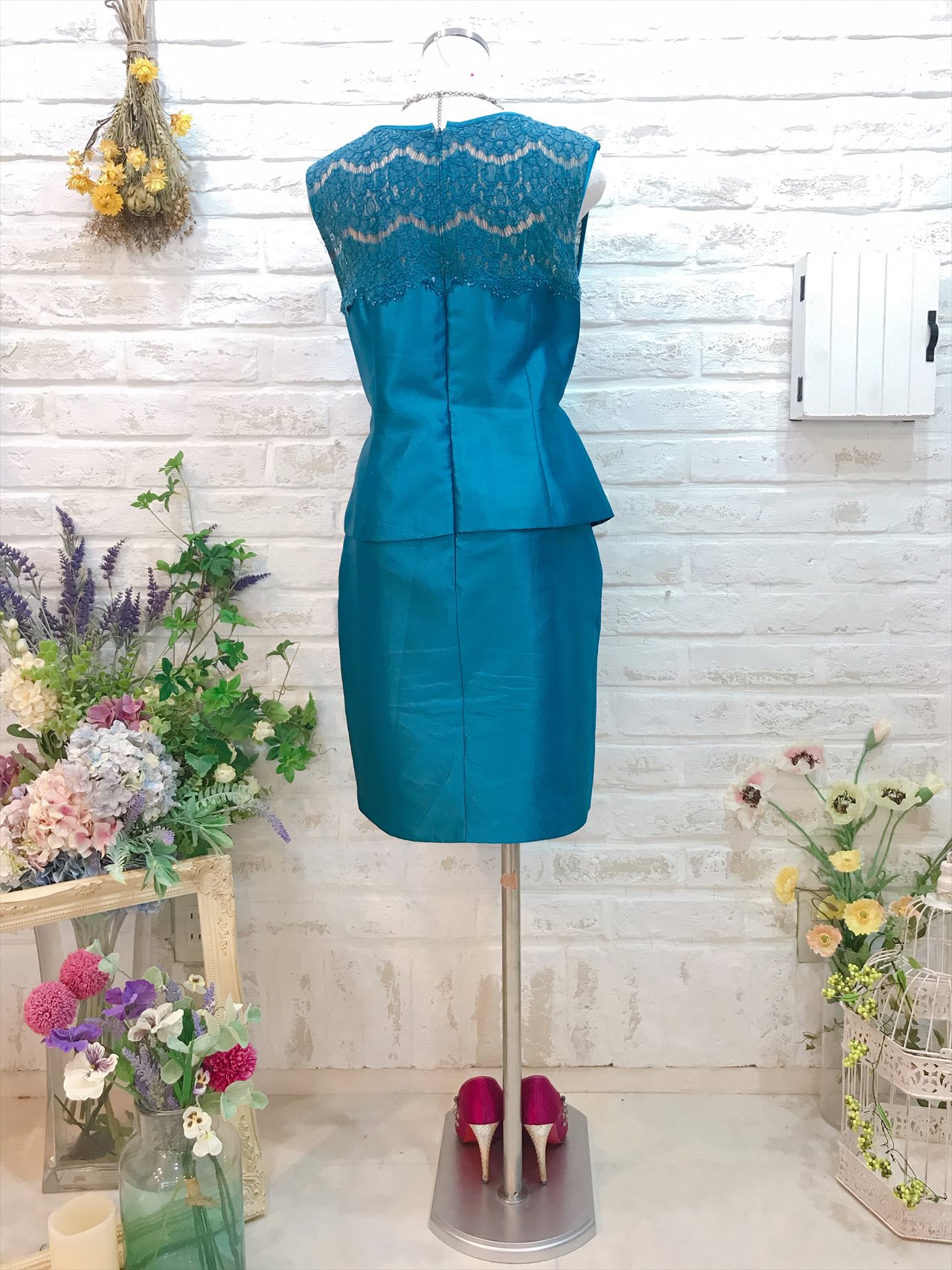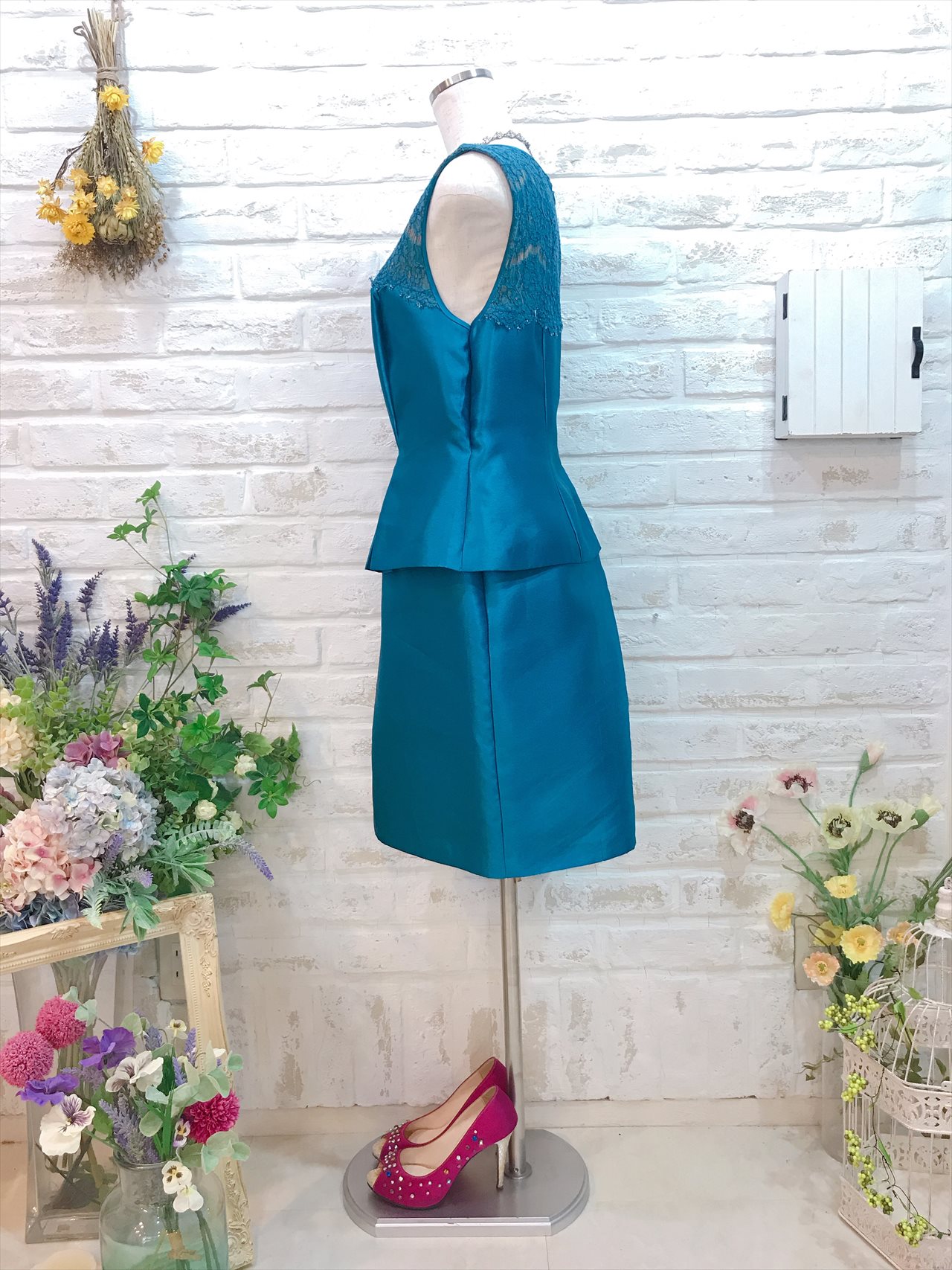 光沢のあるターコイズブルーのペプラムスカート肩ありドレス