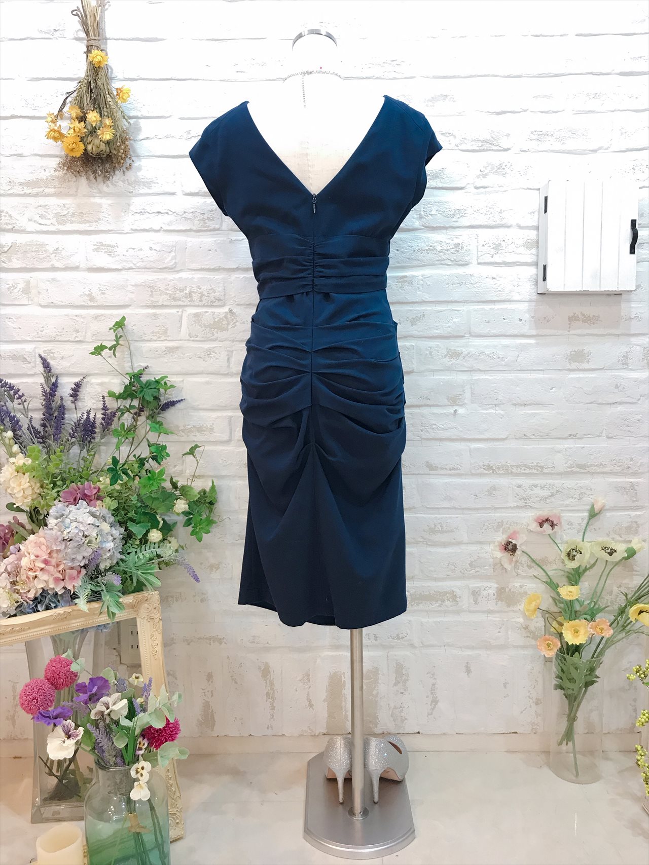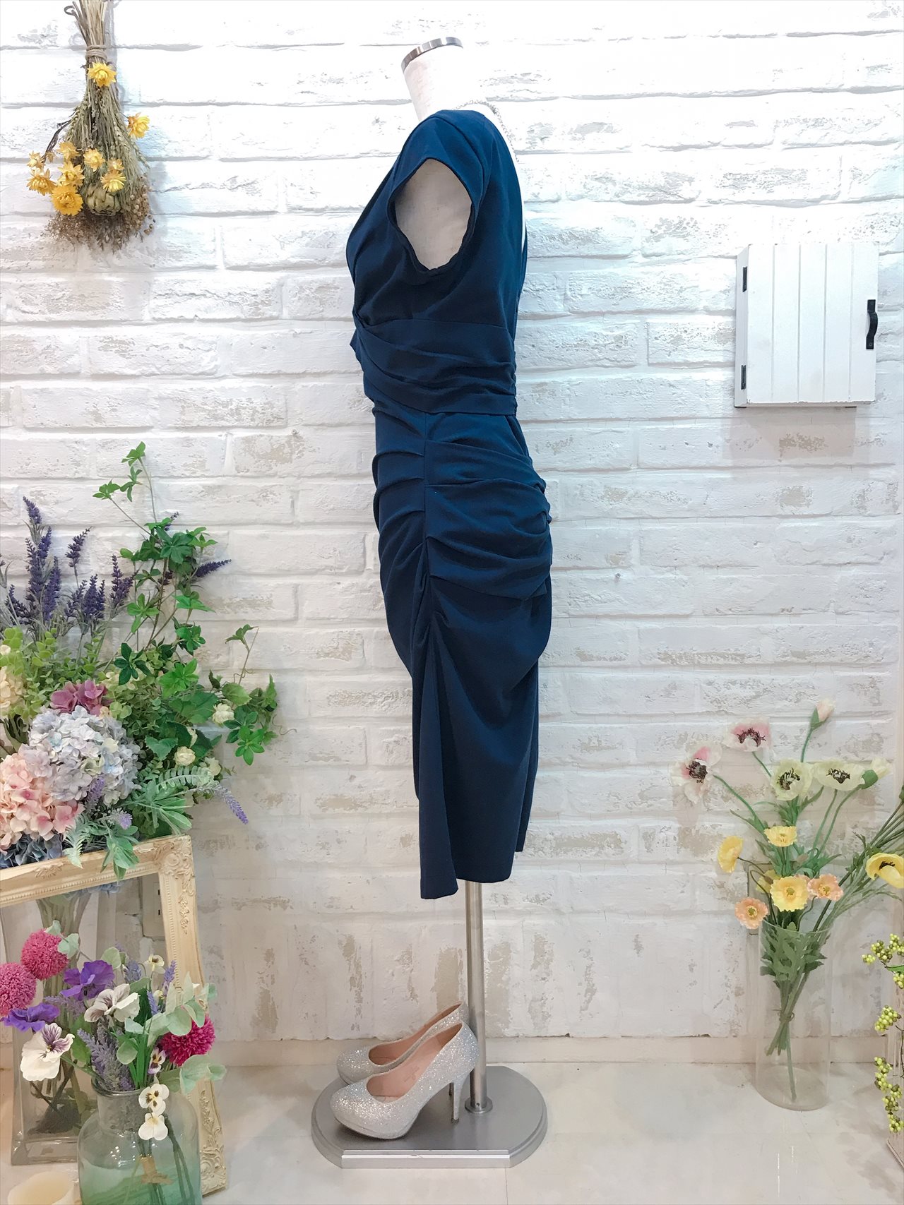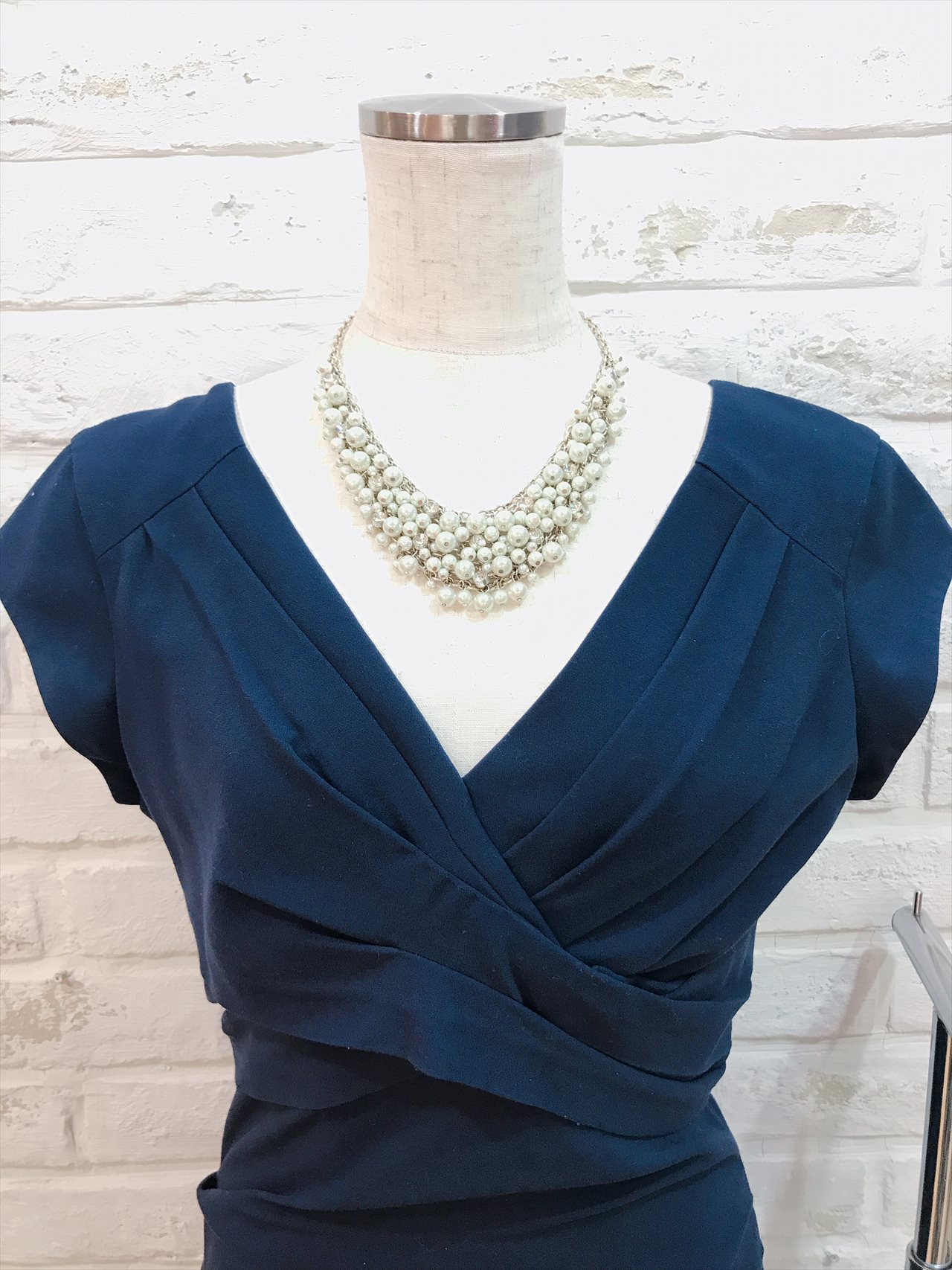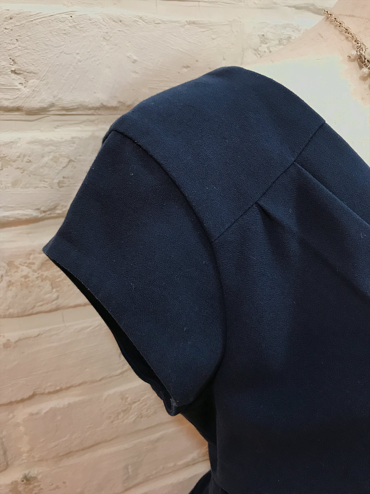 ネイビーの袖ありワンピースです。デザインはタイトシルエットとなっていて、体のラインにフィットするようなイメージで着用いただくドレスとなっています。生地はストレッチのある生地で大変着心地のいい素材となっています。カジュアルな印象のドレスなのでこなれた感じのお洒落な雰囲気に見せたいときにおすすめです。お小物は差し色に明るいお色をあわせていただくとドレスが引き立ちおすすめです。