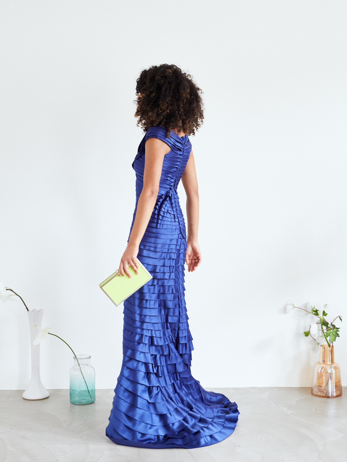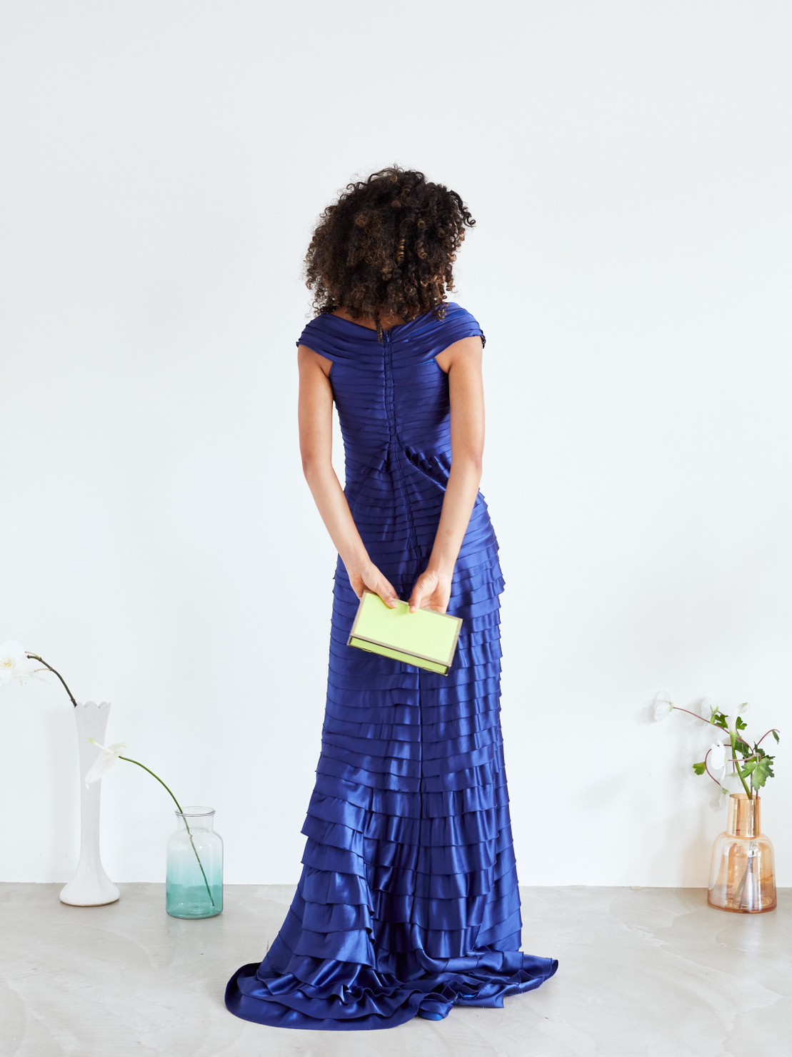 光沢ネイビーの段々胸元すっきりV字後ろレーンありロングドレス
