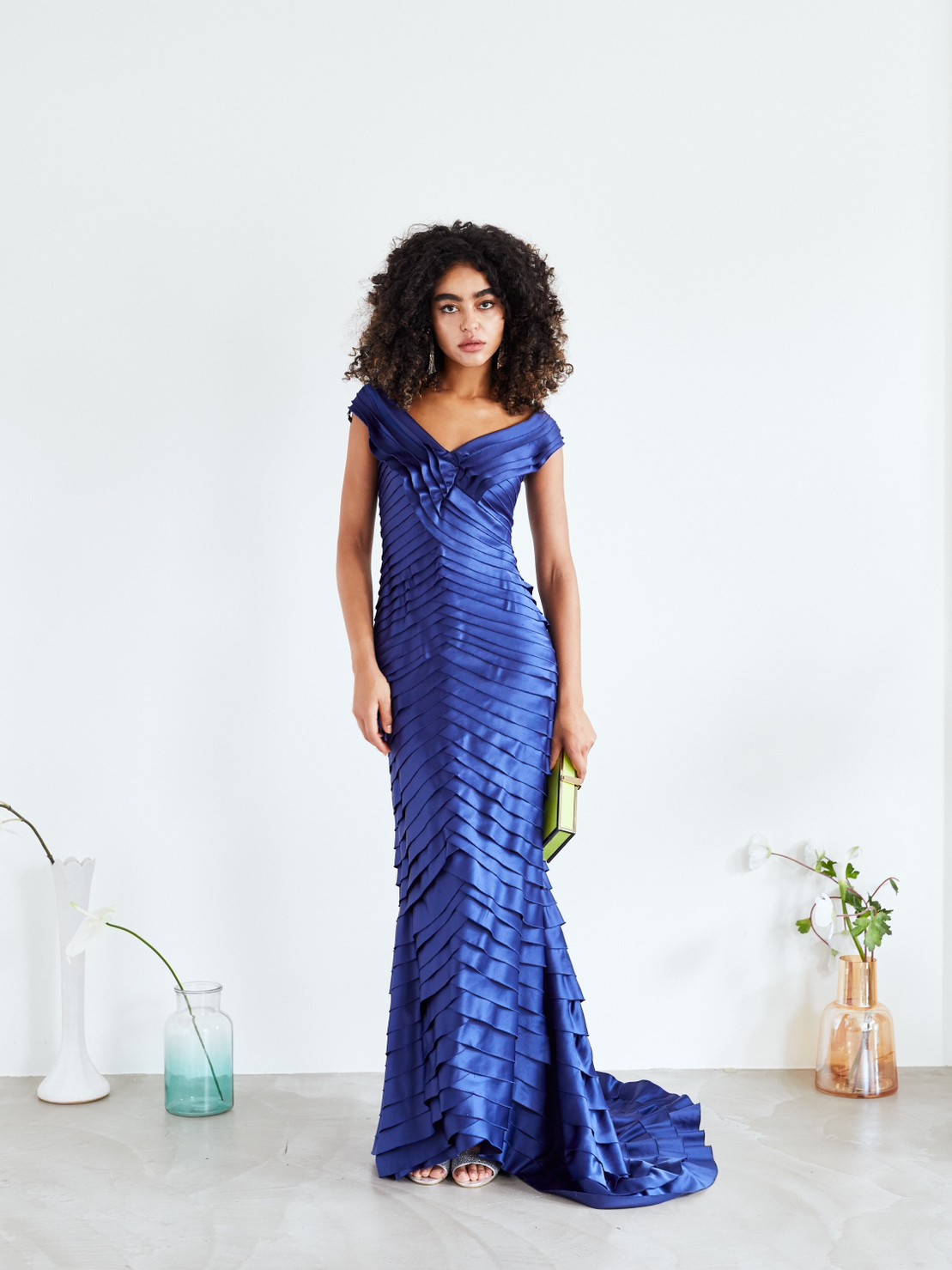 TADASHISHOJI ネイビー段々Vネックレーン長め肩ありロングドレス