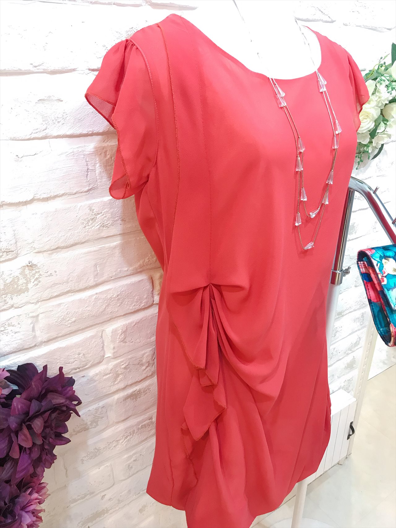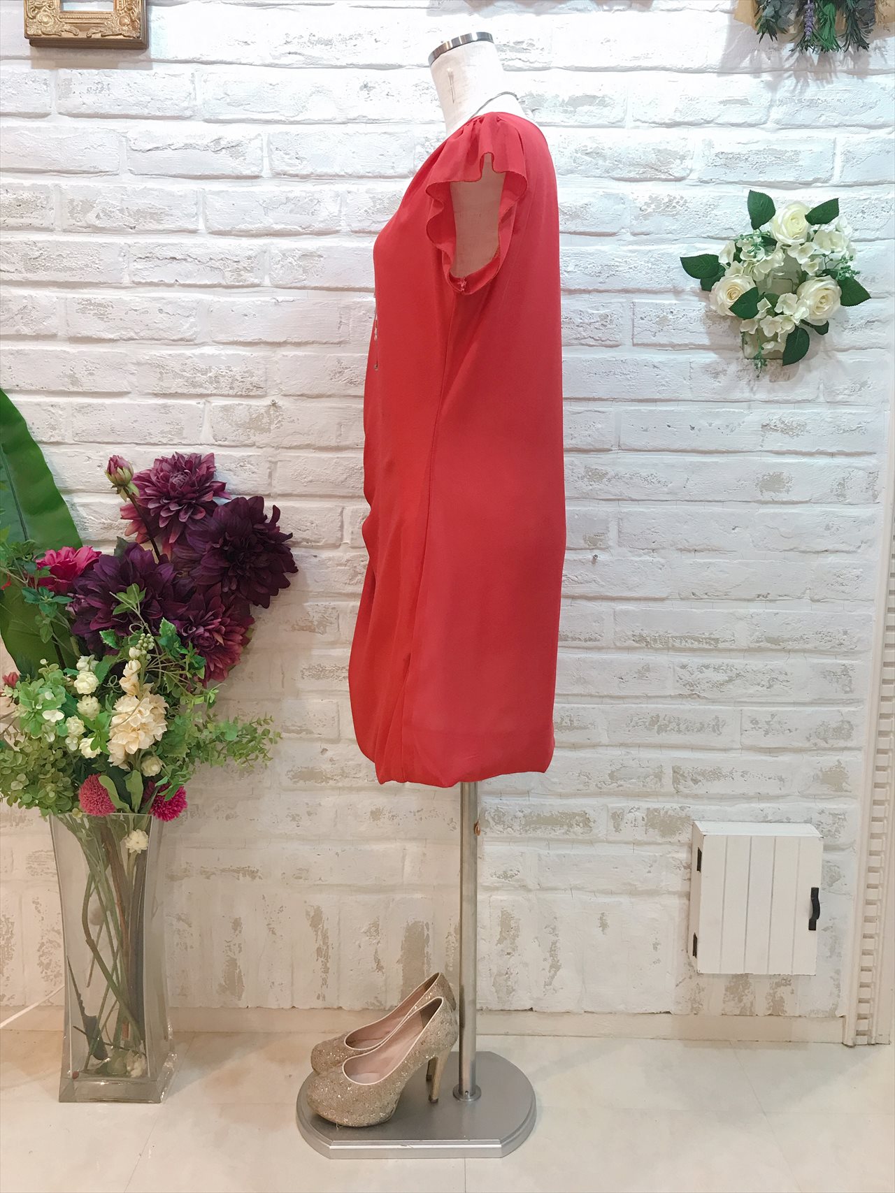 オレンジの袖ありドレス。くしゅっとしていて可愛いドレスです。アシンメトリーにドレープがありデザイン性のあるドレス。袖ありドレスなため結婚式やパーティーでも1枚で着て頂けます。ドレス自体はシンプルなためネックレスに大振りなものを合わせ頂くとより華やかに。バックには差し色で青などいれるとオシャレなコーディネートに仕上がります。袖は少し短めなのでストールなどを合わせて頂いてもいいと思います。