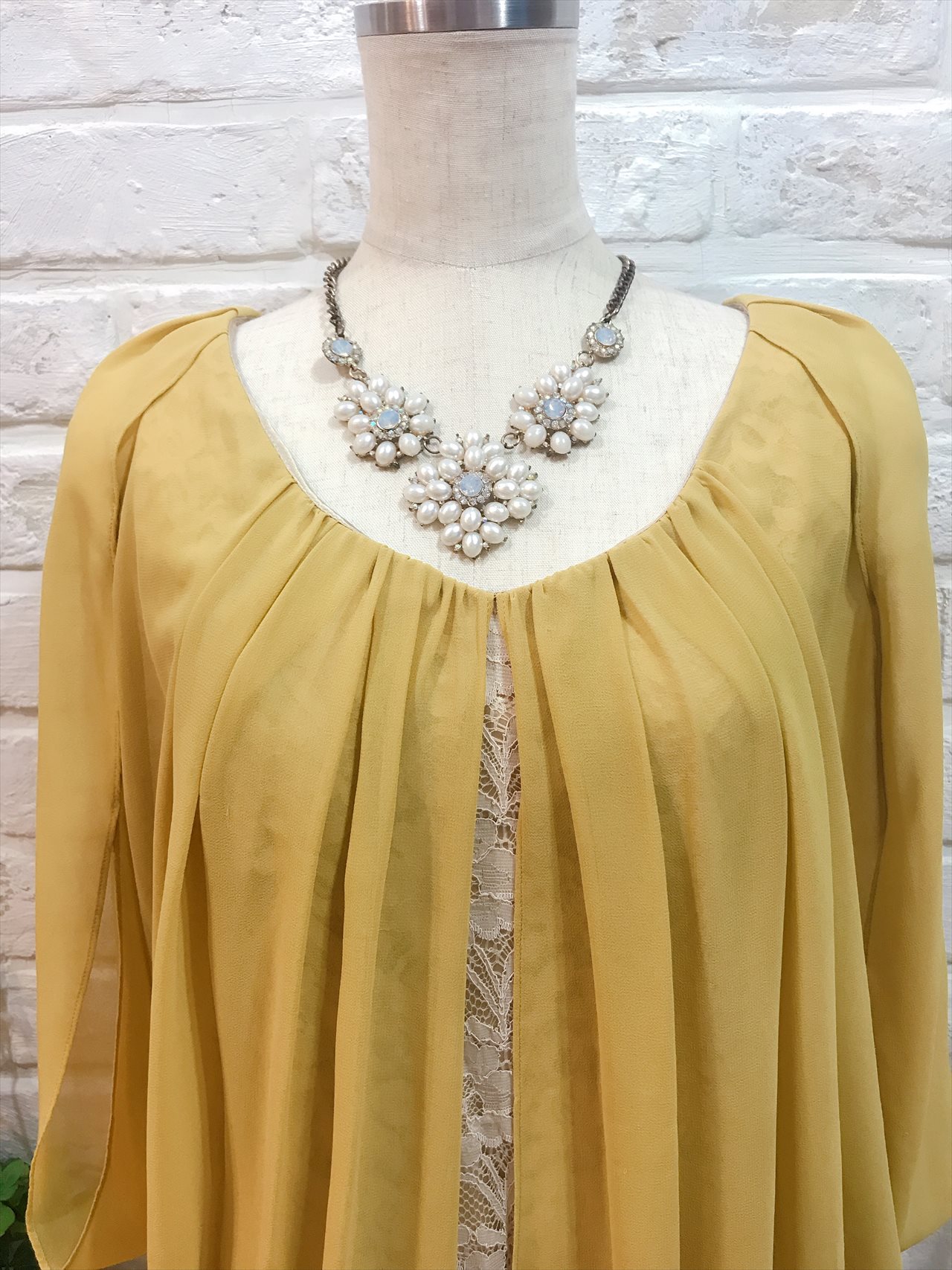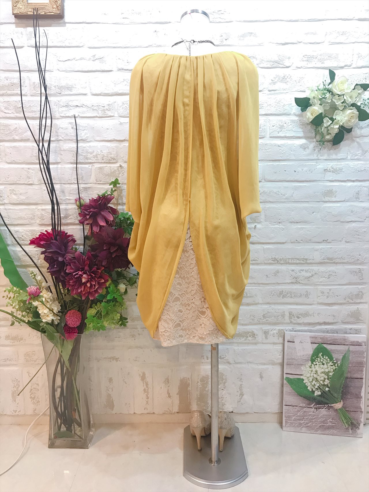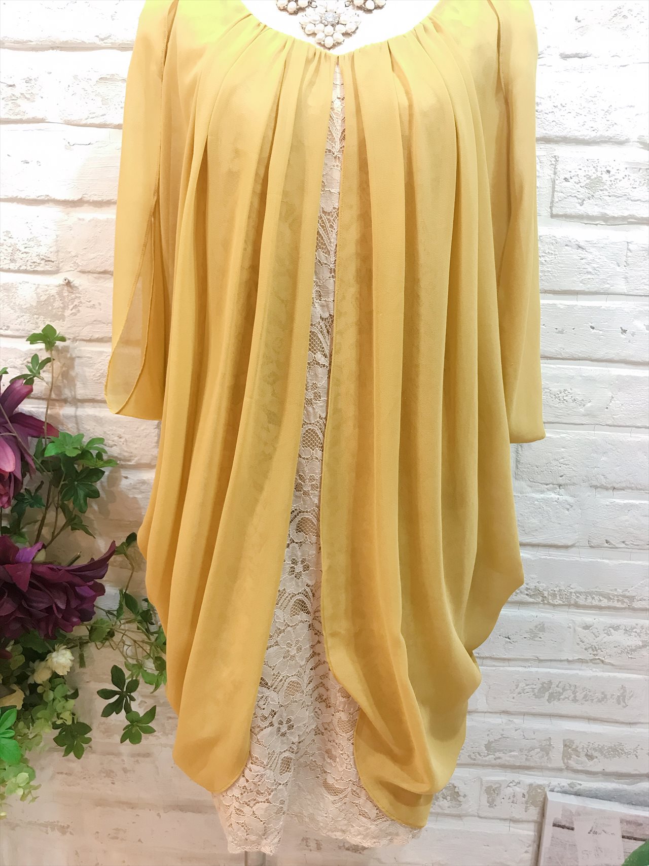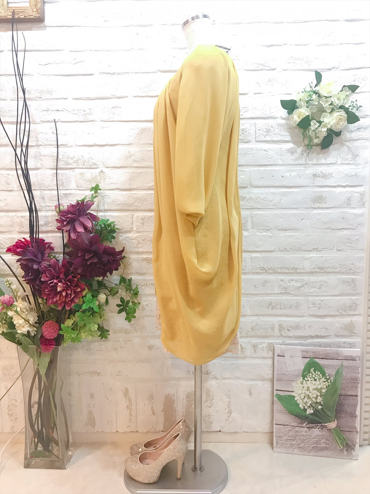 マスタードイエロー袖ありドレス。中の生地がレース素材で大人可愛いドレス。同じ素材のベルトは取り外し可能です。結婚式でも1枚でさらっと着て頂けますし、お食事会やパーティーにもお勧めです。上品な印象です。バックにカラーをさしてもオシャレなコーディネートに仕上がります。シフォン素材とレースが軽やかで着心地も良いドレスです。