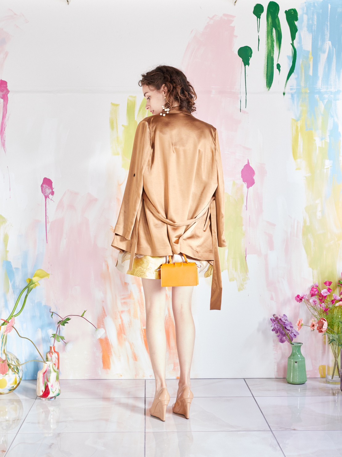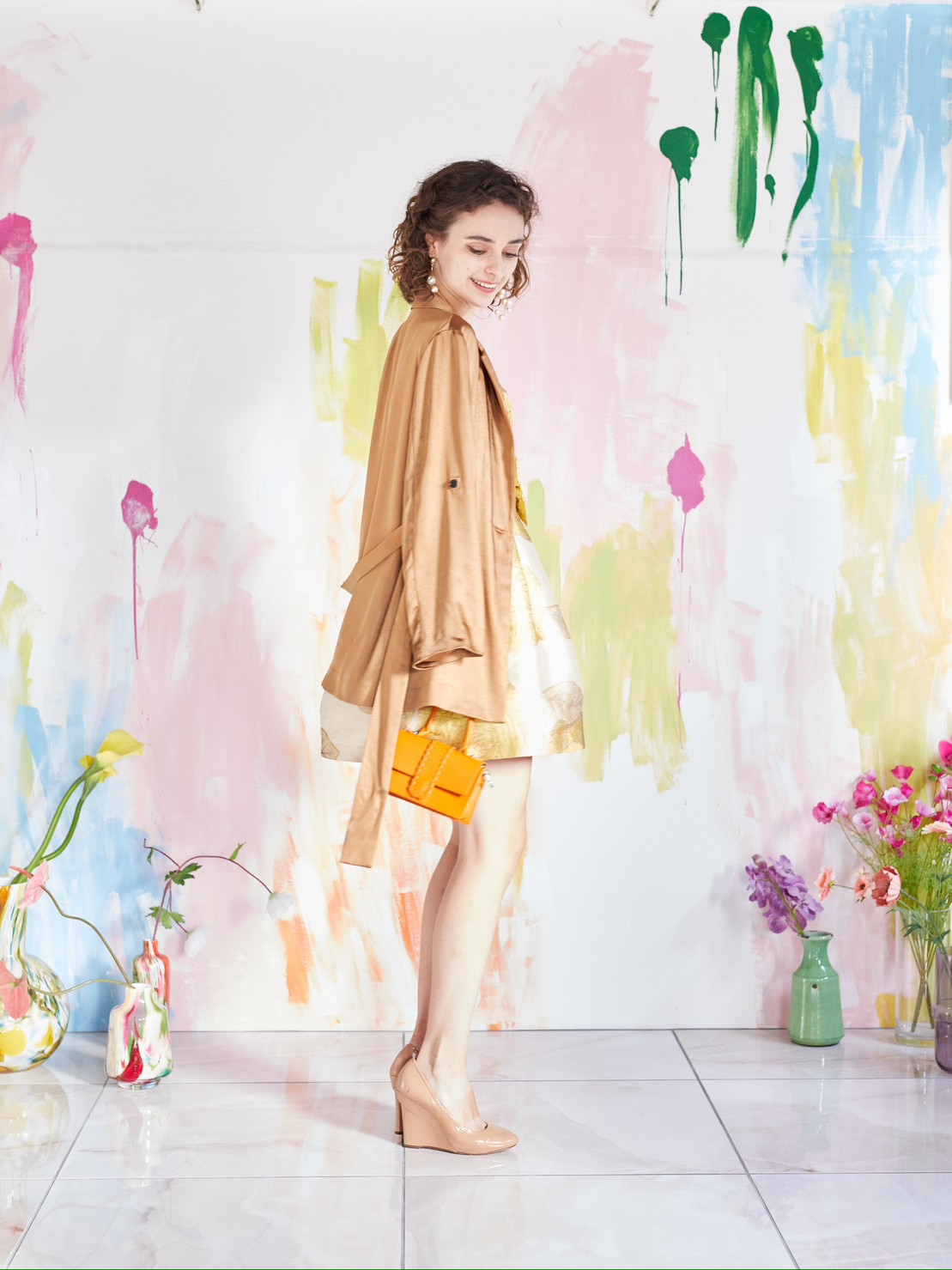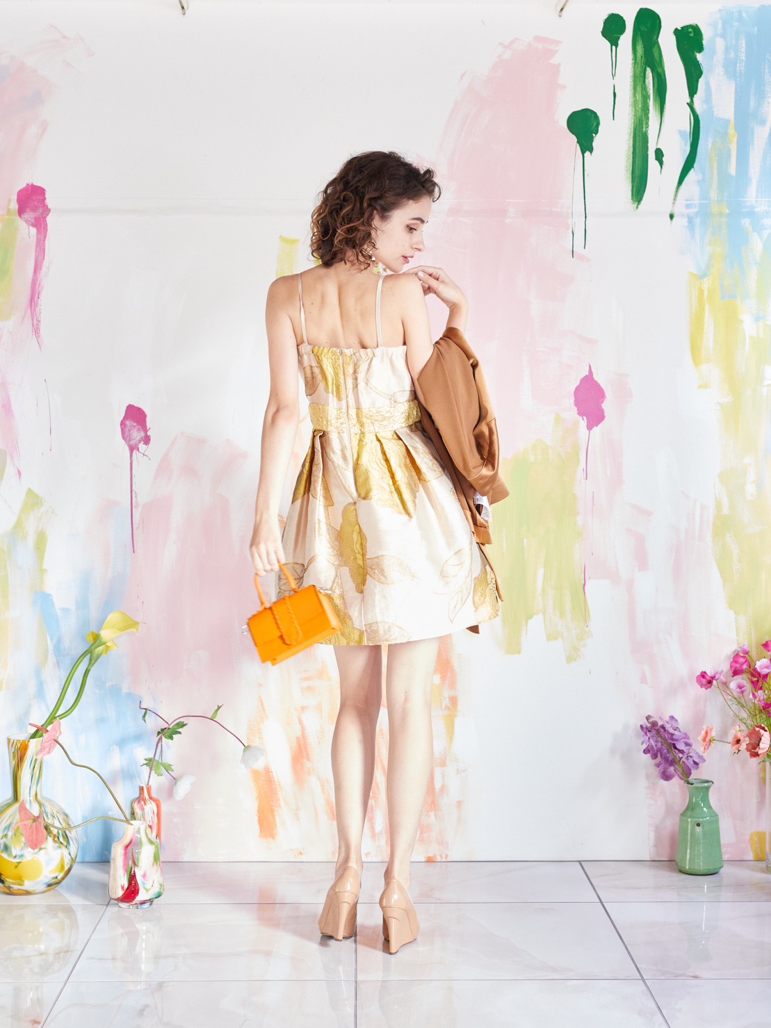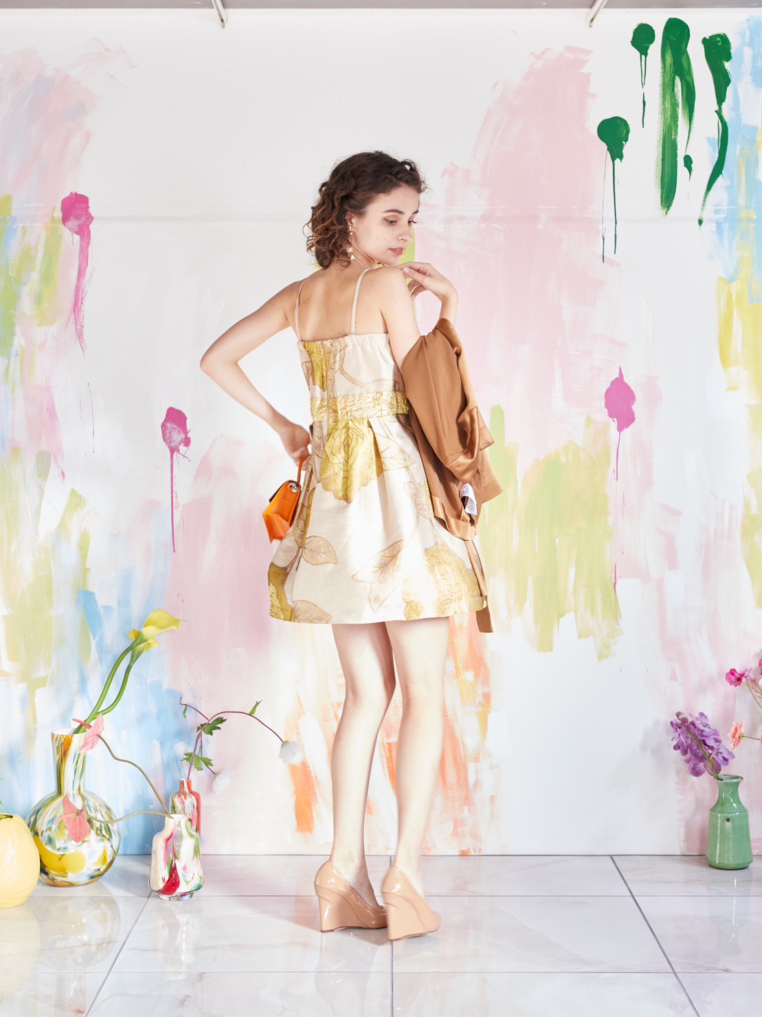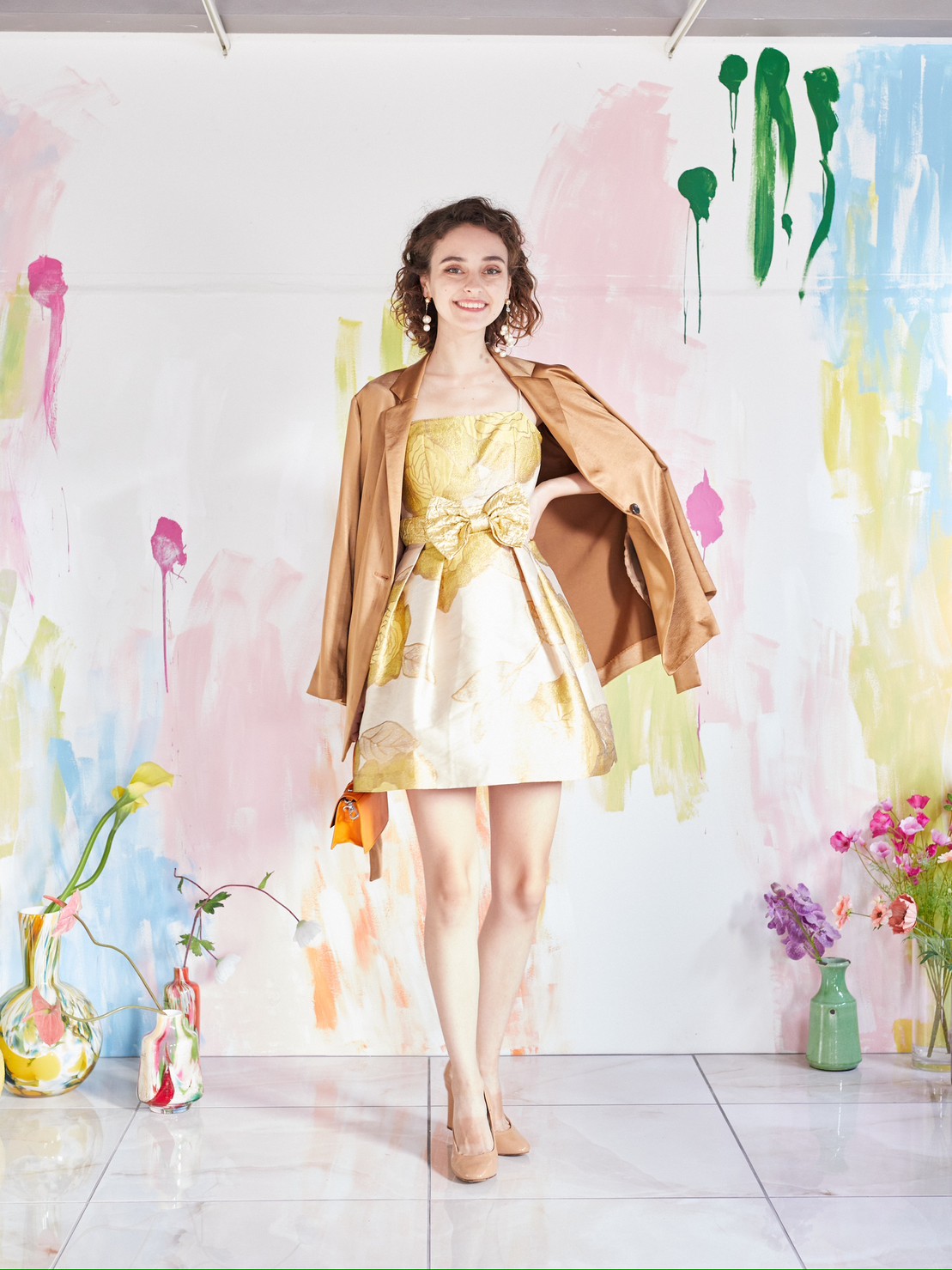 イエローカラーに大きめバラ柄がポイントのミニ丈ベアドレス。和柄のようなテイストでパリッとした生地感が印象で珍しいドレスです。ウエストに大きめのリボンがアクセントになっていてとっても可愛いです。ウエストにリボンがあることでウェストラインをスッキリとみせてくれます。小物を黒系でまとめてるとメリハリのあるコーディネートになり、ゴールド系でまとめるとゴージャスさを演出出来ます。ボレロやストールを合わせて結婚式のゲストドレスとしてもご利用頂けます。パーティーや謝恩会にもお勧めのドレスです。