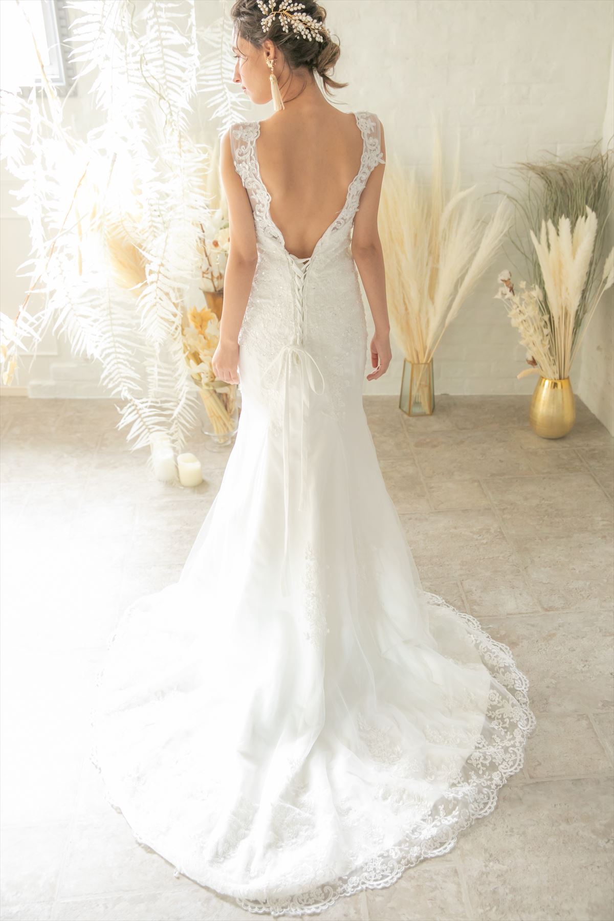 マーメイドラインのウェディングドレスを着られたい花嫁さんにお勧めな1着。レースとビジューが上品で後ろは編み上げになっているためサイズ調整も可能です。ヒールを履いて頂ければ床に少しつくぐらいで着て頂けるので1.5次会や2次会の花嫁さんに大変お勧め。