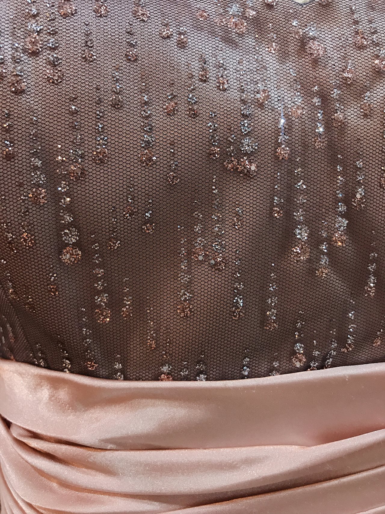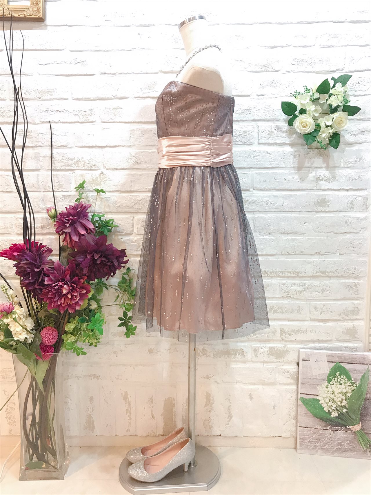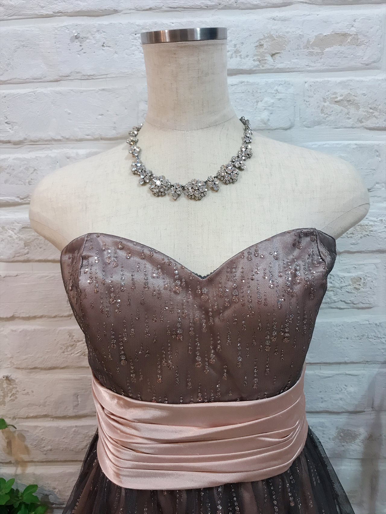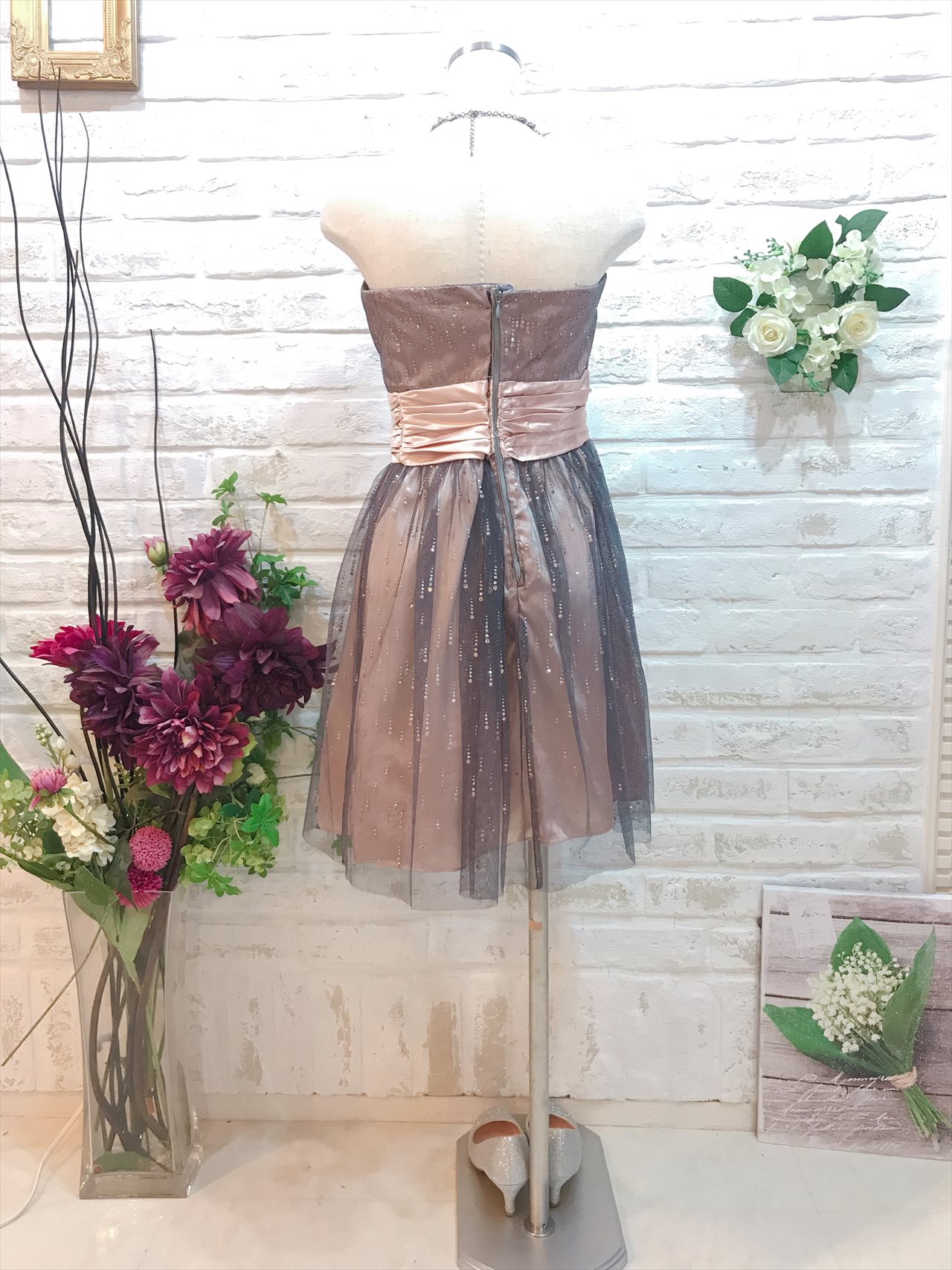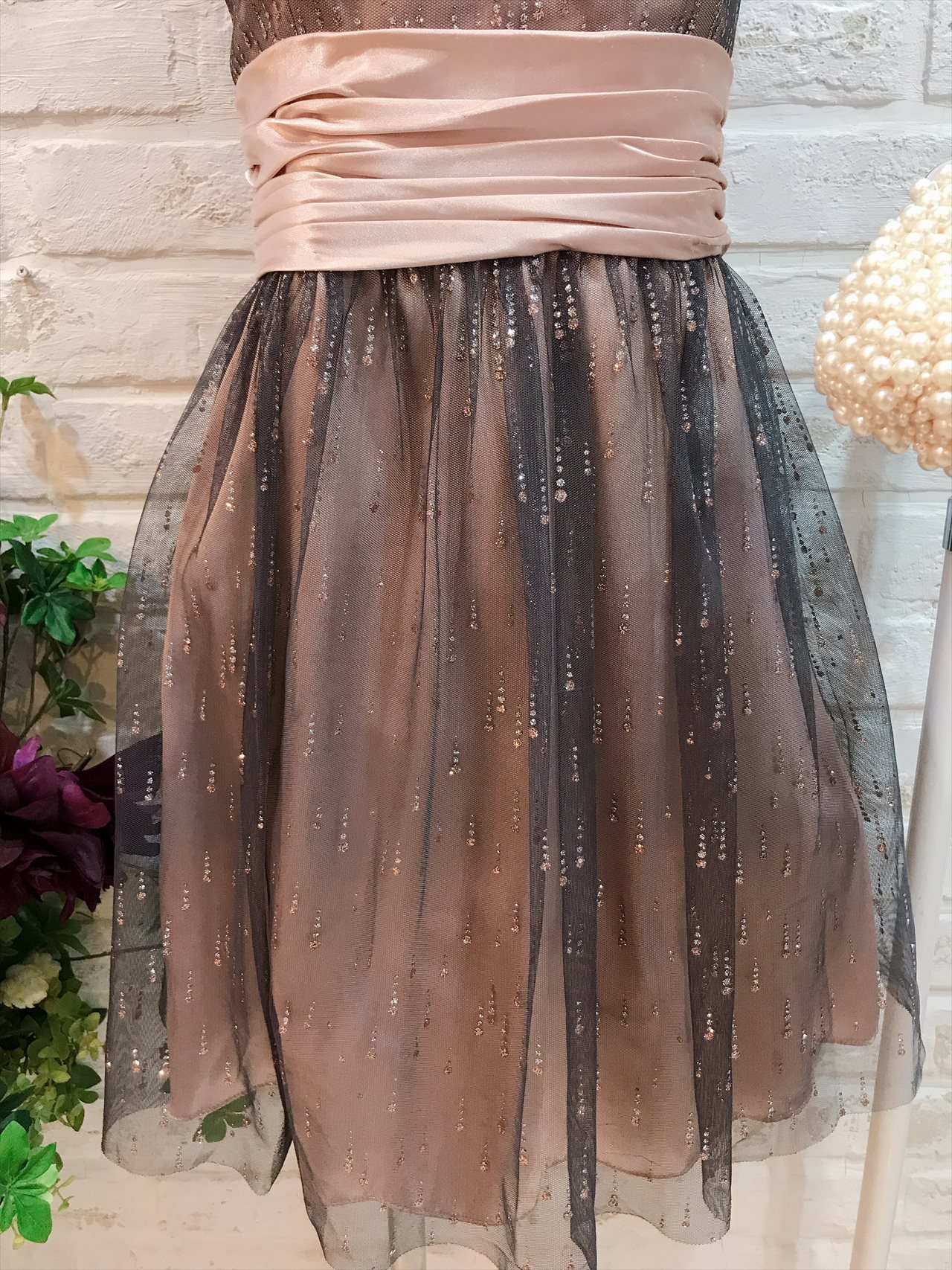 シャンパンピンク×グレーのキラキラベアドレス。動く度キラキラして華やかな1着。ウエストに切り返しがありボディーラインを大変綺麗にみせてくれます。羽織ものはウエスト部分がキレイに見えるようにボレロをお勧めします。お友達の結婚式や謝恩会などのシーンで着て頂きたいドレス。ウエストのサーモンピンクリボンに合わせて羽織ものを合わせられてもいいですがベージュ系のボレロも合います。デコルテラインがすっきりとしているので大振りなネックレスをお勧めします。
