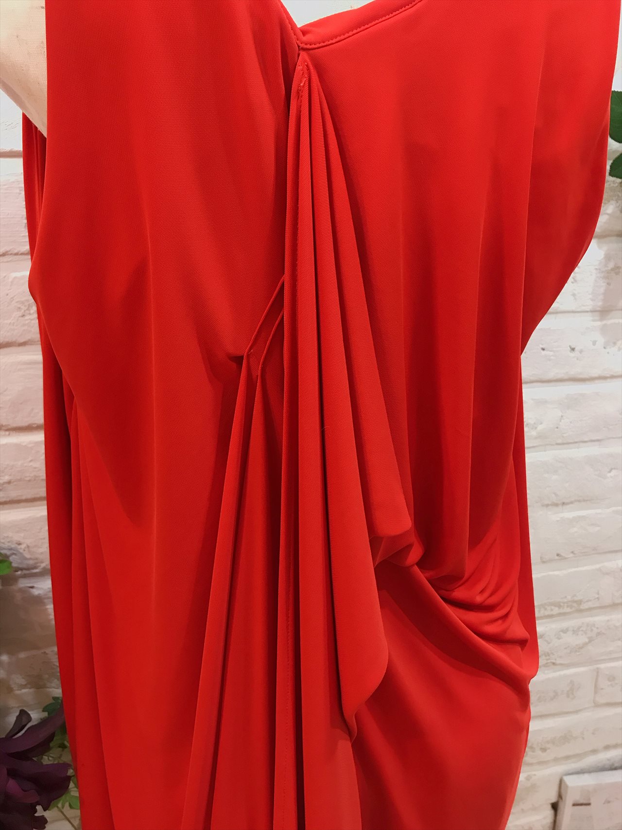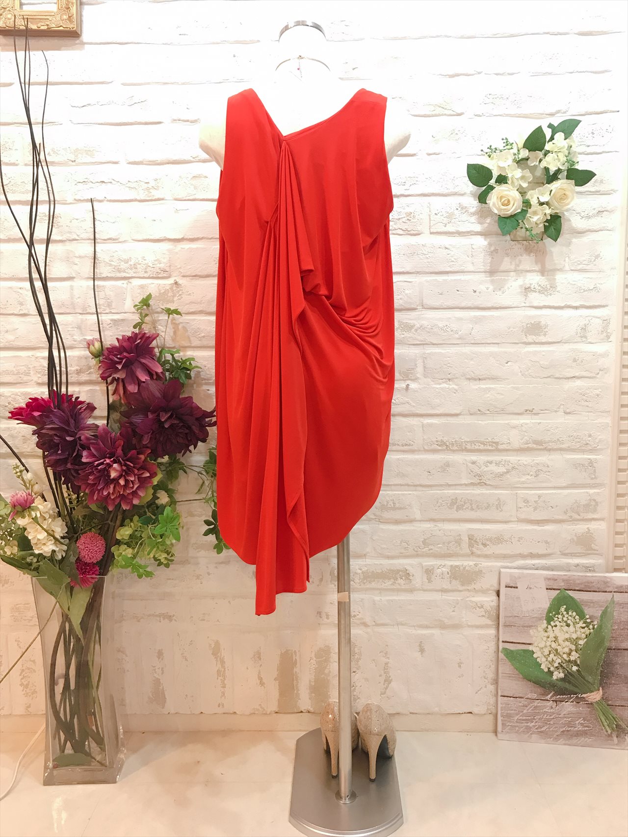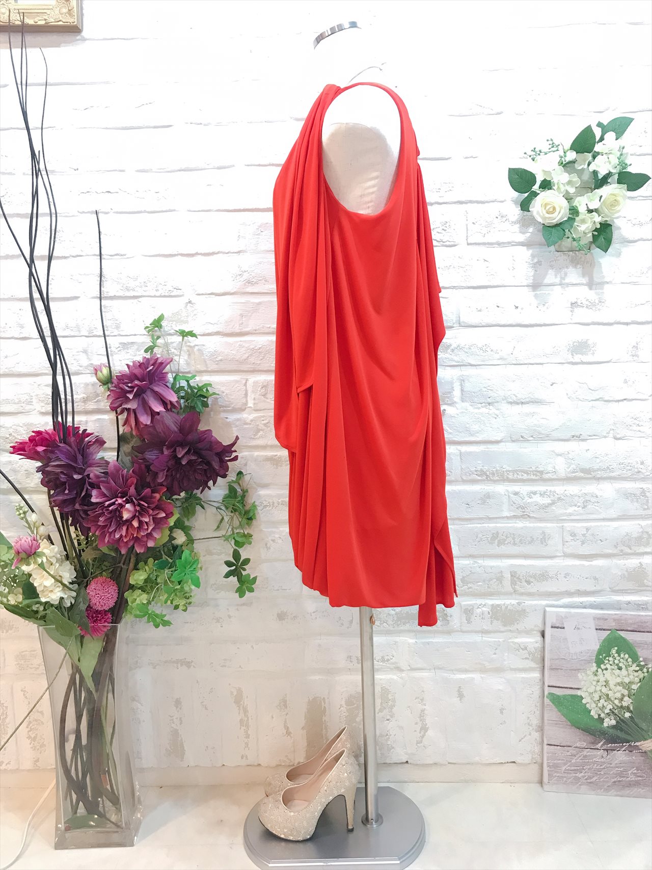 赤オレンジの肩ありドレス。ドレープがあり大人っぽいドレス。伸縮性のある生地なためシワにもならず長時間着て頂いても着心地よくパーティーを楽しんで頂けます。丈は短めなシンプルな縦ラインのドレスでお肌映りのいいお色なので、結婚式やパーティーなどお写真をたくさんの撮られる機会には是非お勧めします。羽織には縦ラインをより綺麗に見せてくれるストールと合わせて頂いて、バックには青などの濃いめの色をもってくるとよりオシャレなコーディネートになります。