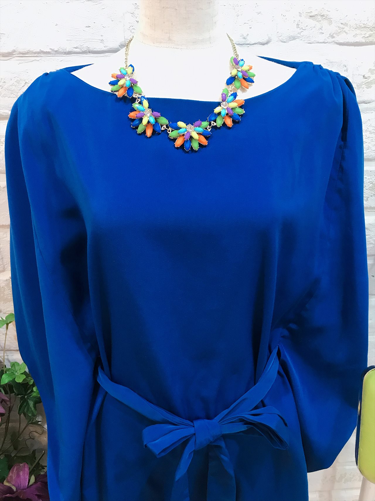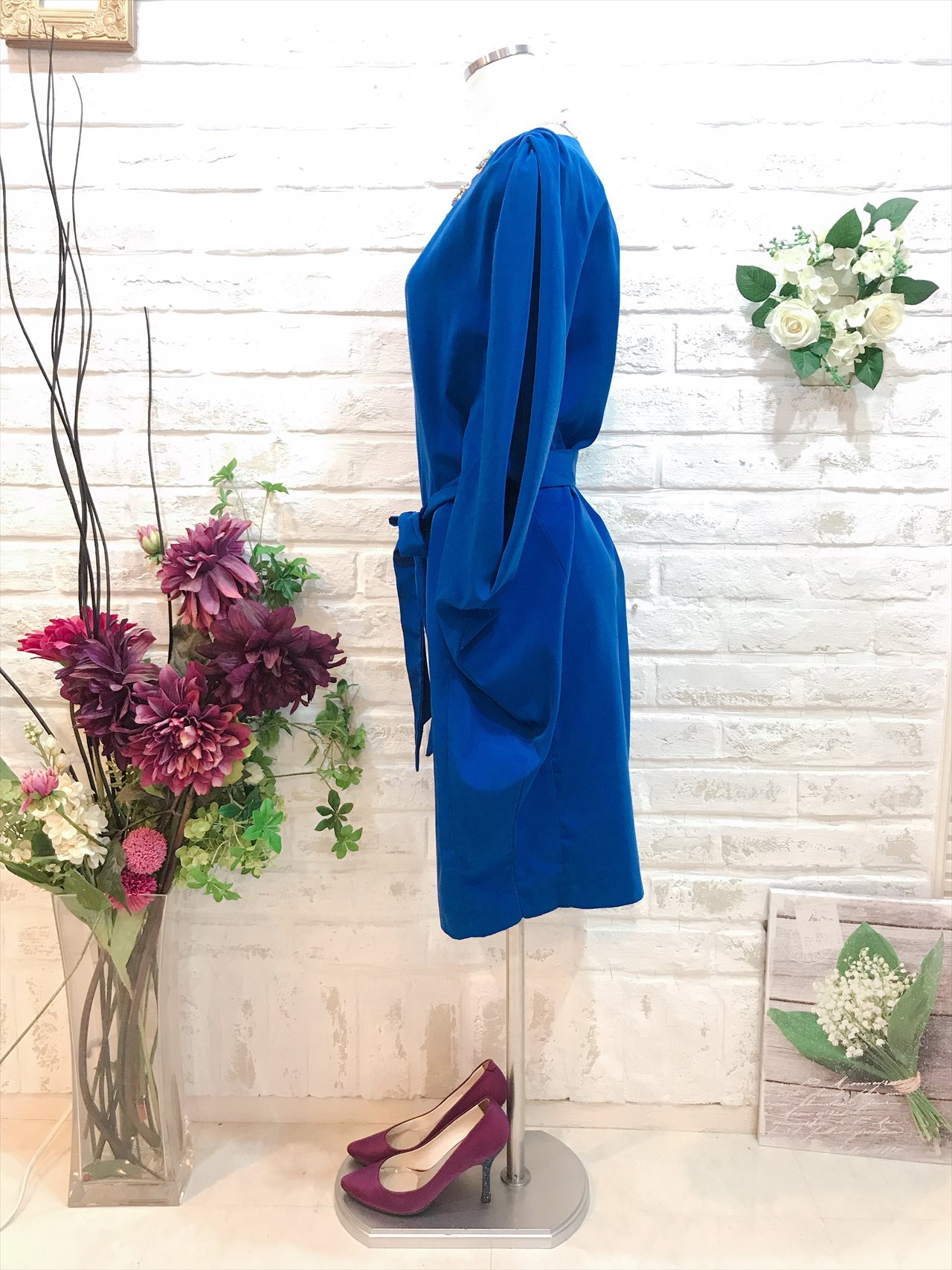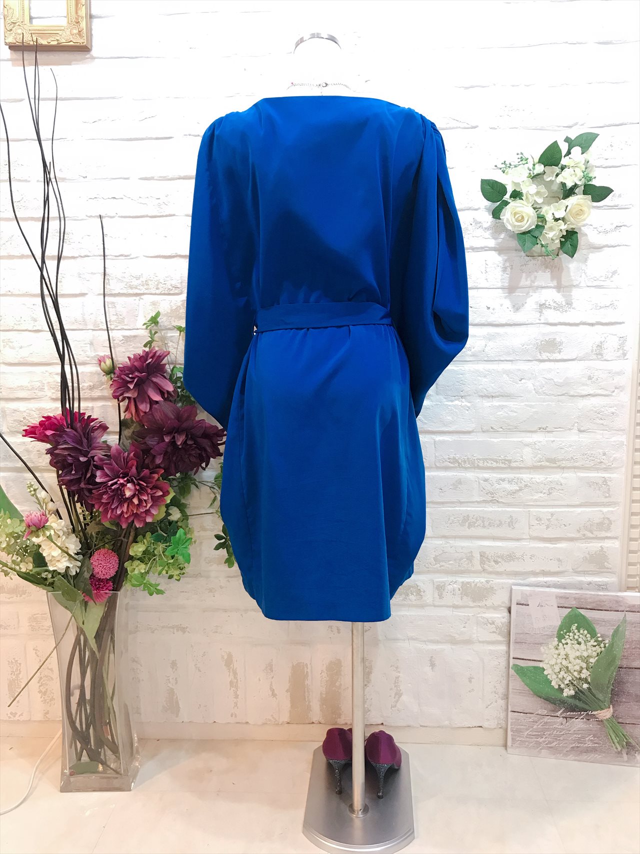 ロイヤルブルーの袖ありドレス。ウエストのリボンでしぼれます。全体的にゆったりとしたシルエットですがウエストを紐で結べるためラインを綺麗に見せてくれます。ドレスに柄や装飾がない分お小物で遊べる一着。バックには柄物やキラキラとしたバックもとても相性が良いです。結婚式や結婚式の2次会など余裕のあるコーディネートに仕上がります。