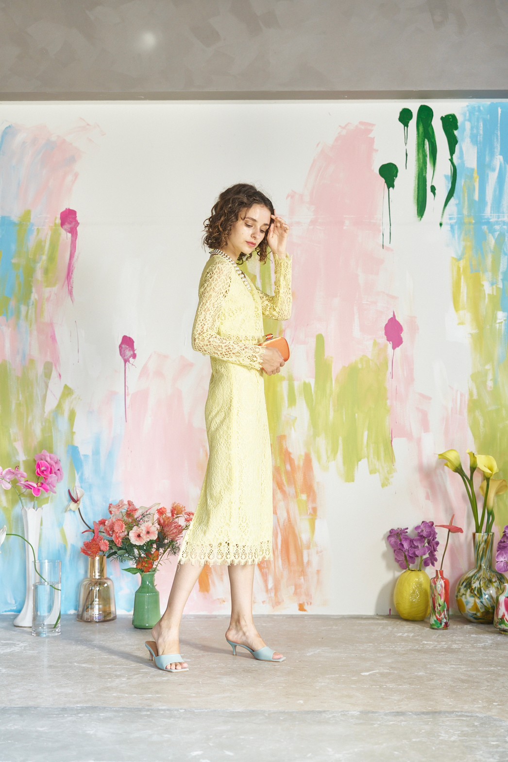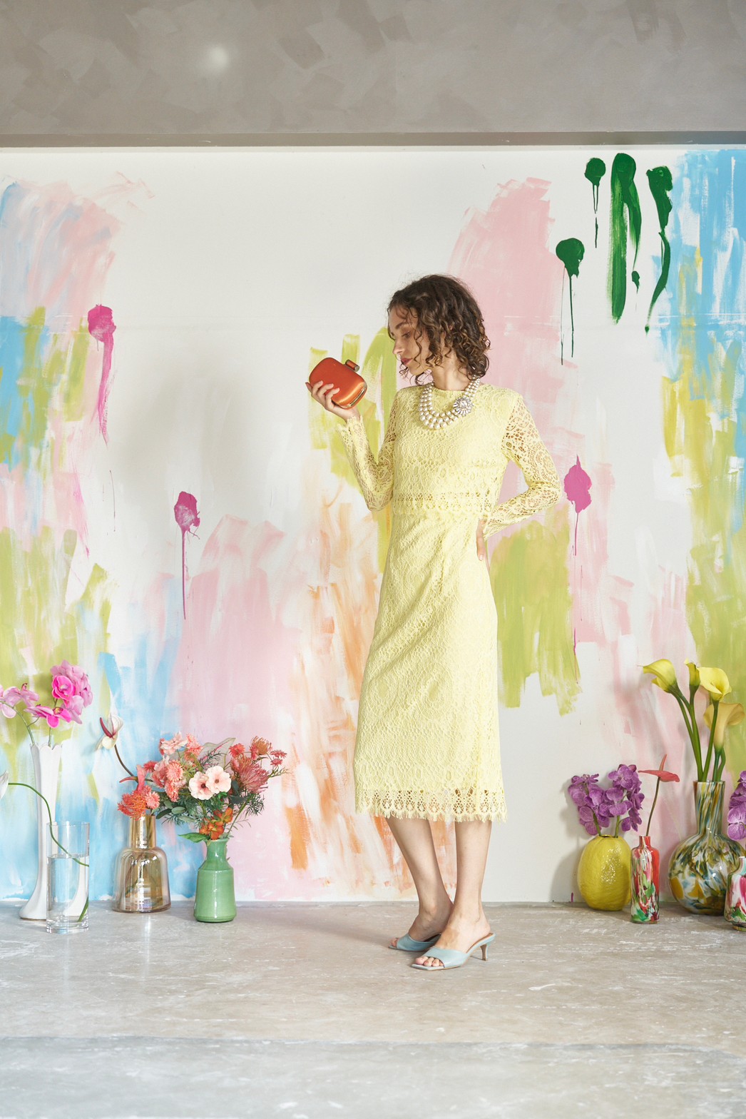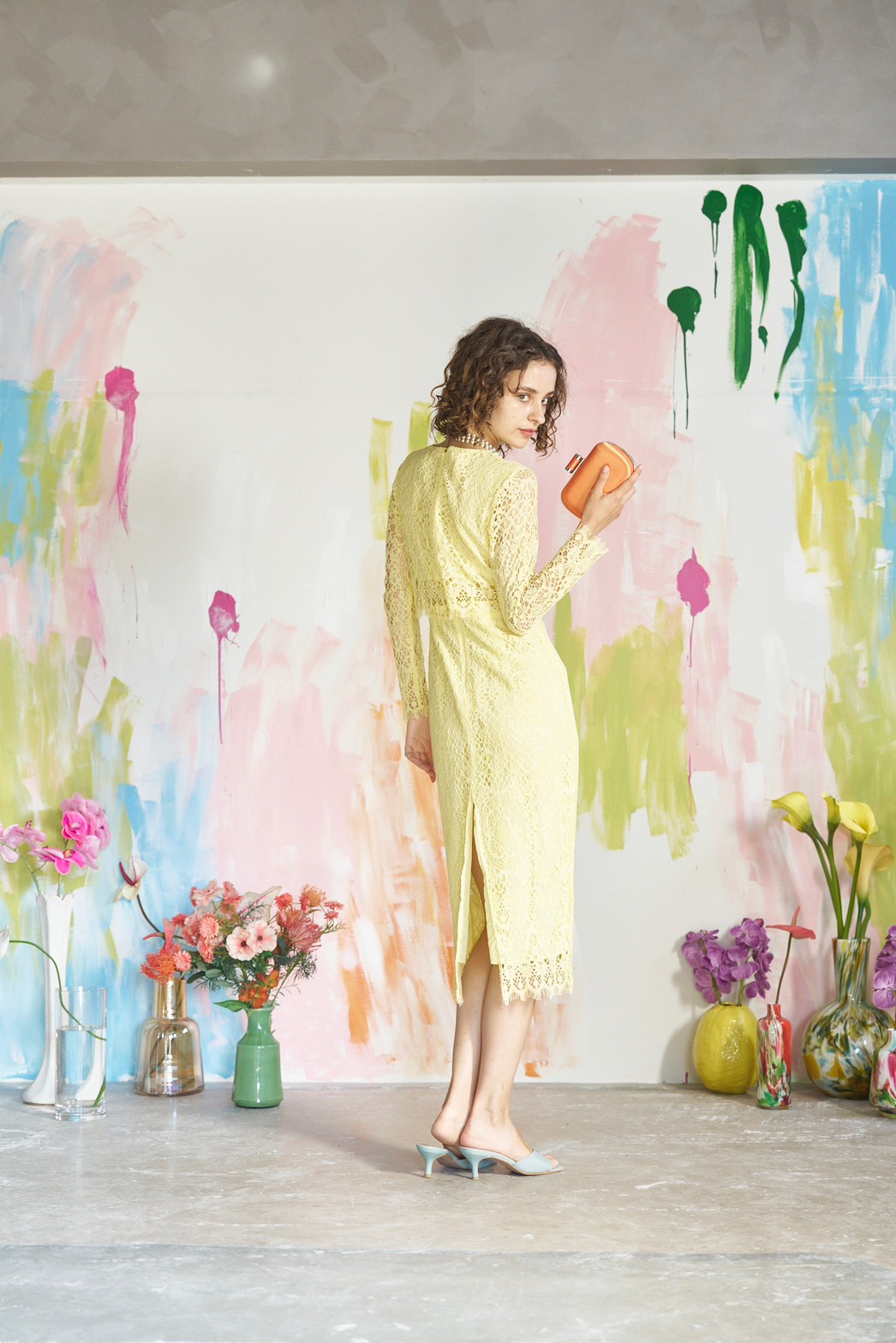総レースレモンカラー ロングスリーブミモレ丈ドレス