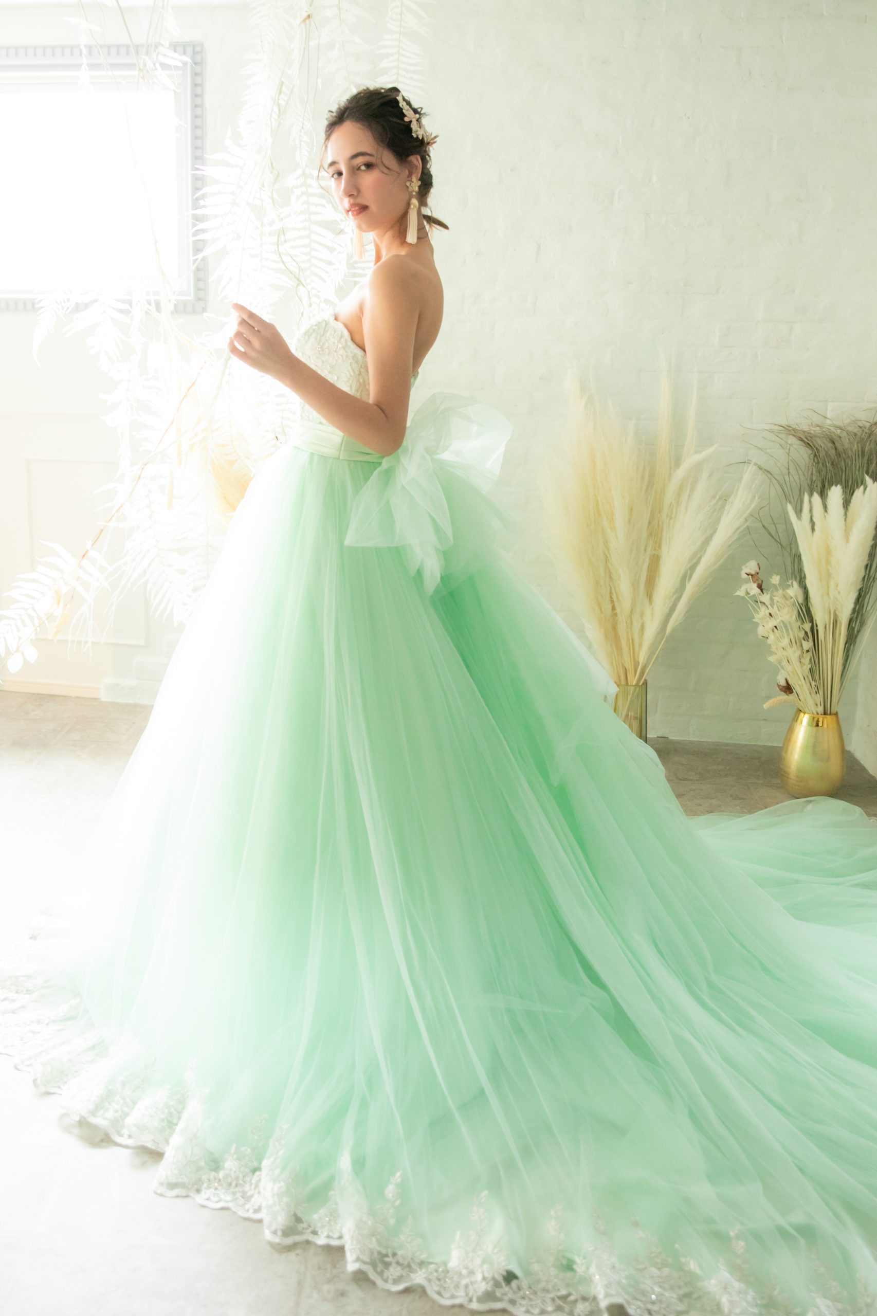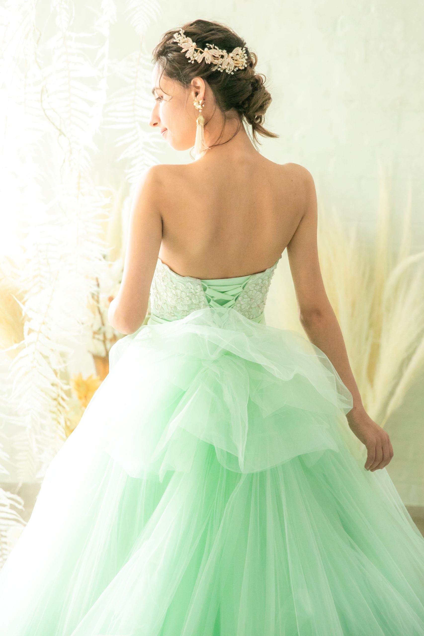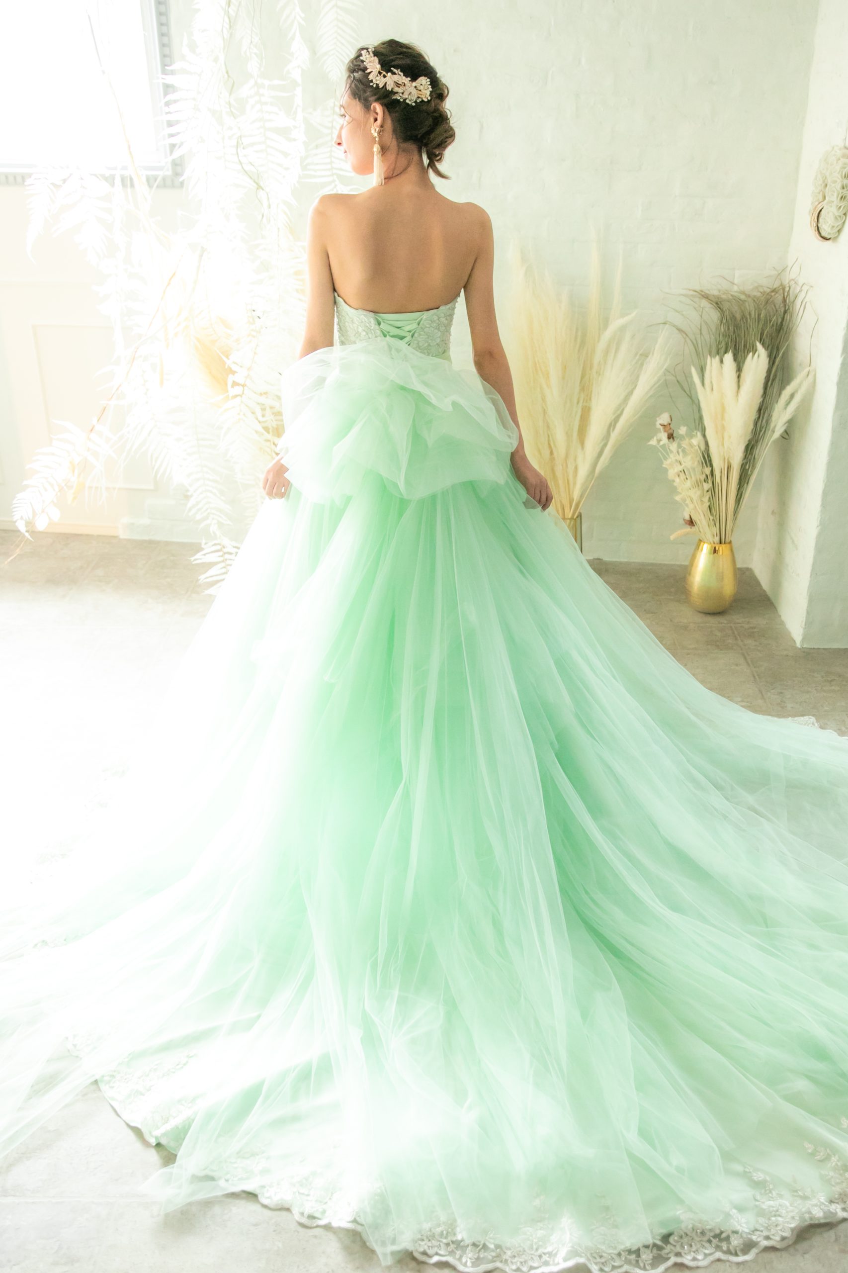 ミントグリーンのボリュームカラードレス。胸元のゴールド刺繍がとっても華やかなカラードレス。スカートのチュールはボリュームがありより一層華やかな印象。編み上げタイプの為にお客様のサイズに合わせる事が可能。ウェデングの2次会や1.5次会やパーティーなどにおすすめめドレスです。