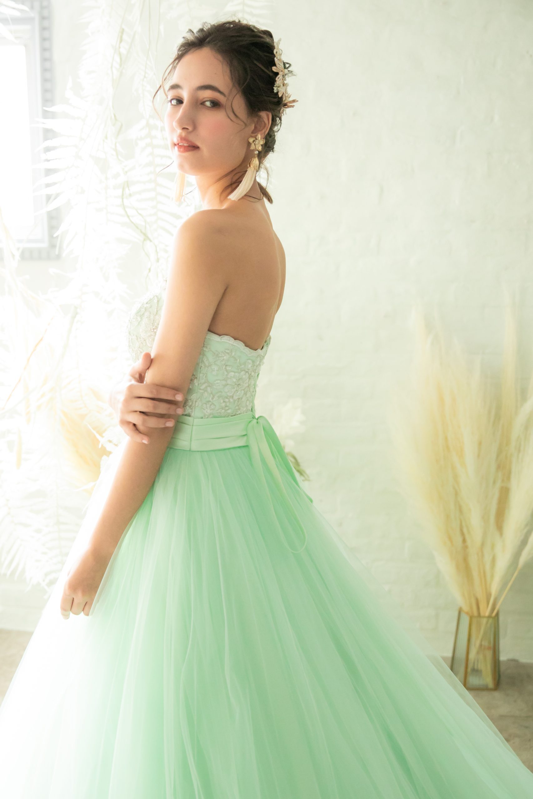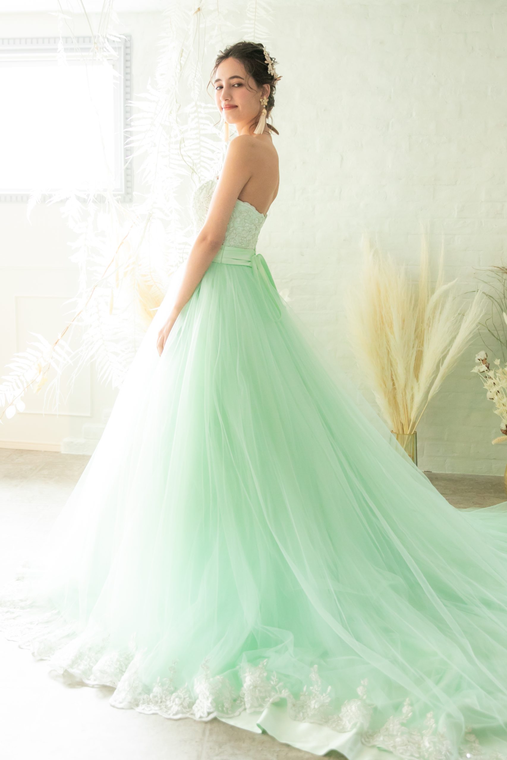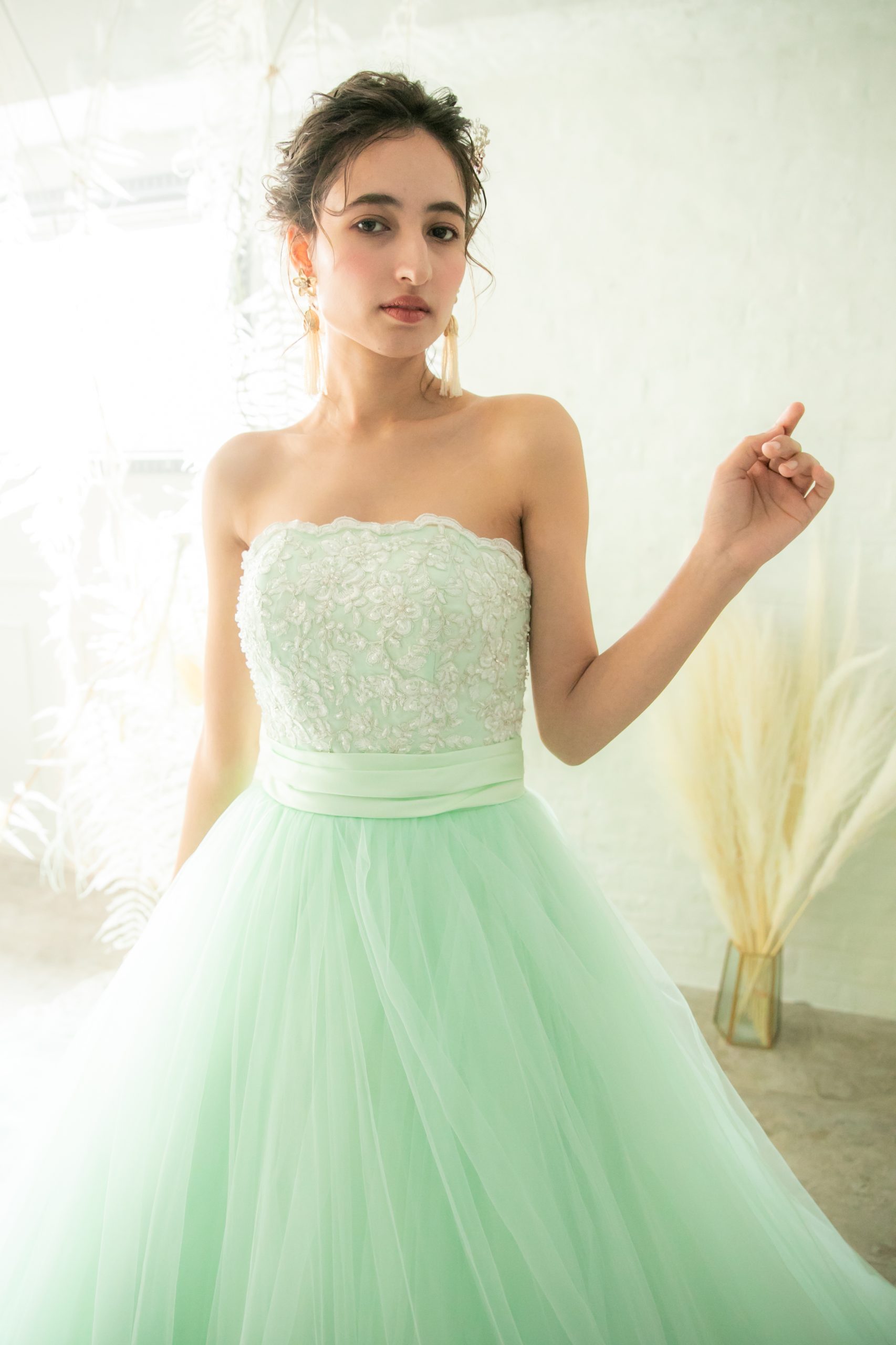 ミントグリーンのボリュームカラードレス。胸元のゴールド刺繍がとっても華やかなカラードレス。スカートのチュールはボリュームがありより一層華やかな印象。編み上げタイプの為にお客様のサイズに合わせる事が可能。ウェデングの2次会や1.5次会やパーティーなどにおすすめめドレスです。