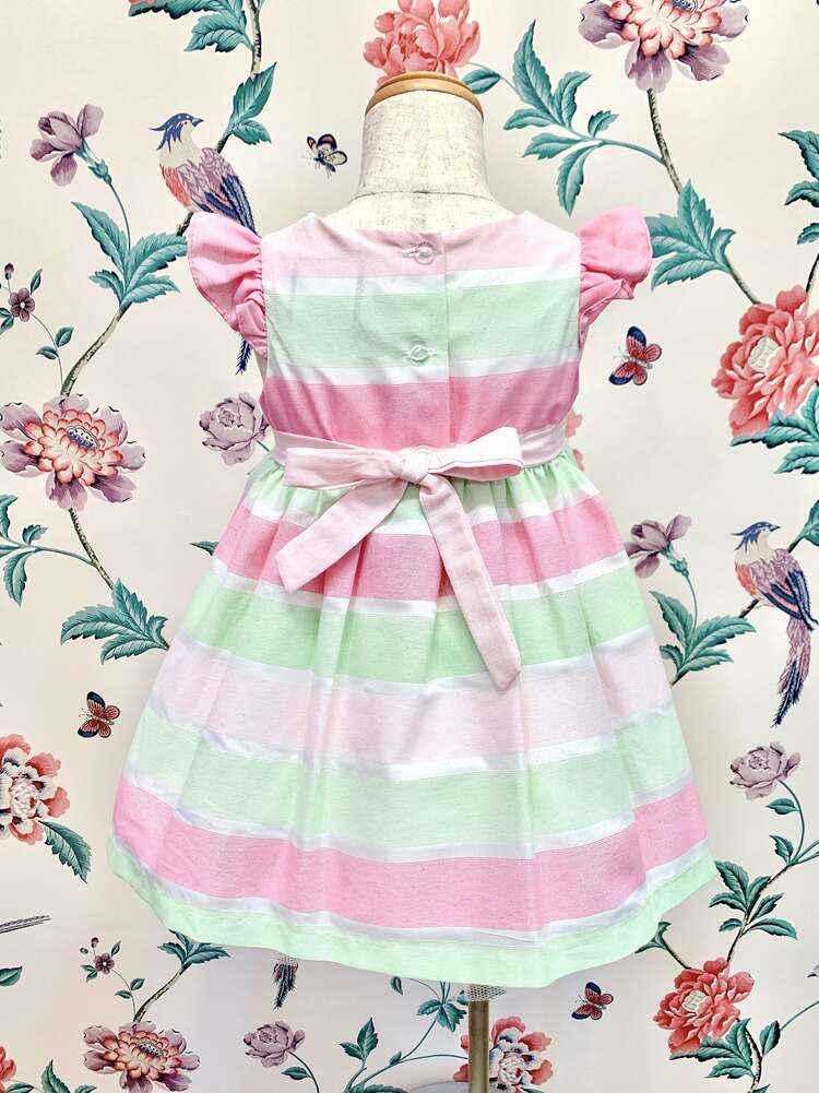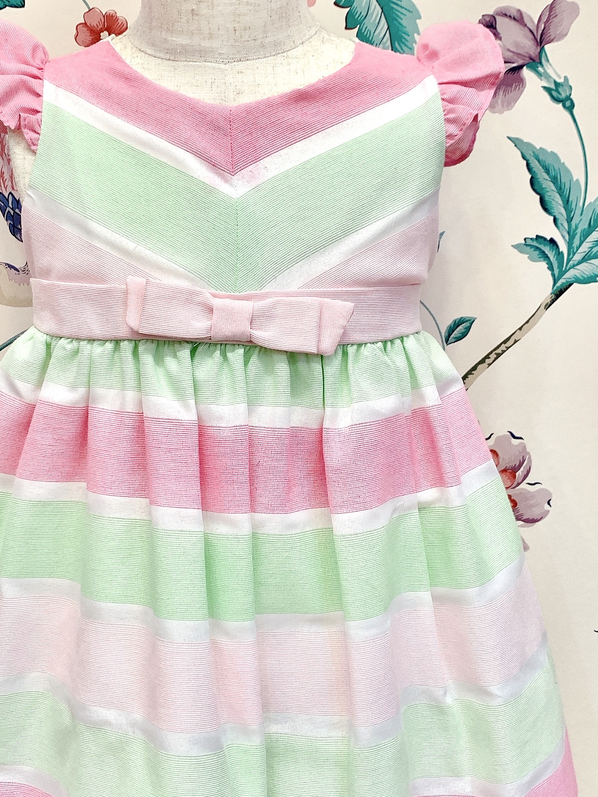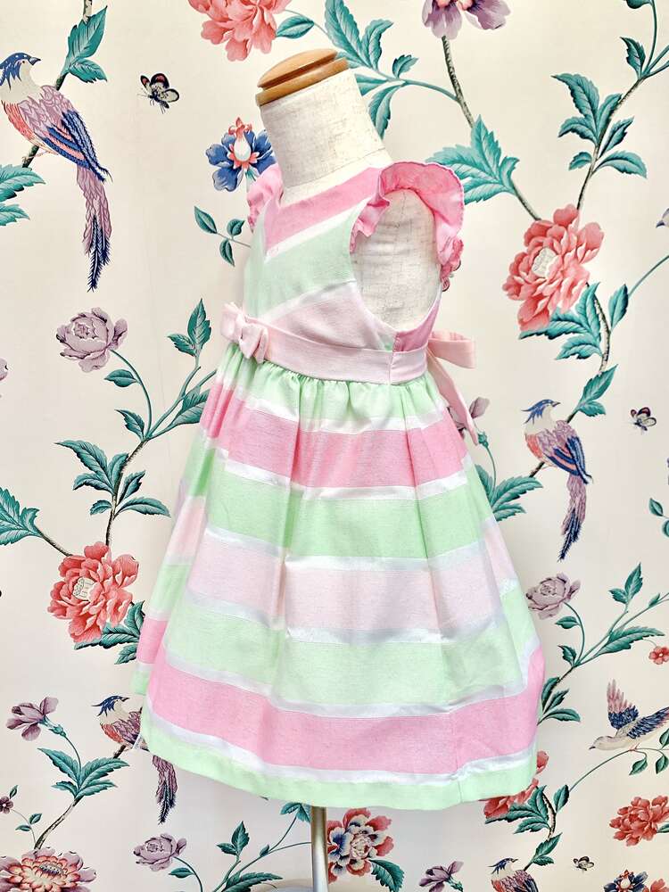 淡いピンクとグリーンのパステルカラーが爽やかなストライプ模様のワンピースドレス。爽やかな中にもウエストリボンやフリル付きスリーブデザインが女の子らしさもプラス!!コットン素材ですので夏の暑い季節の結婚式やお食事会などでもサラッと着心地抜群です。汗をかきやすいお子様にも安心。ドレスというよりは平服よりのワンピースタイプとなっておりますのでTPOに合わせてお選び下さい。