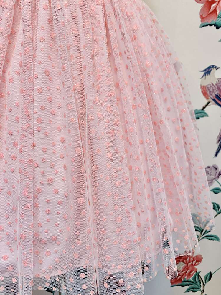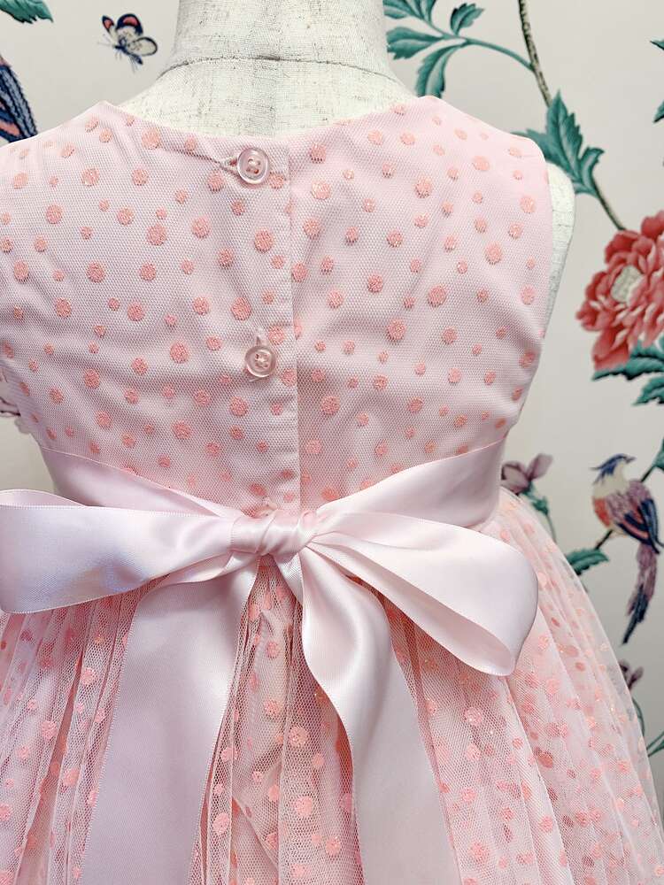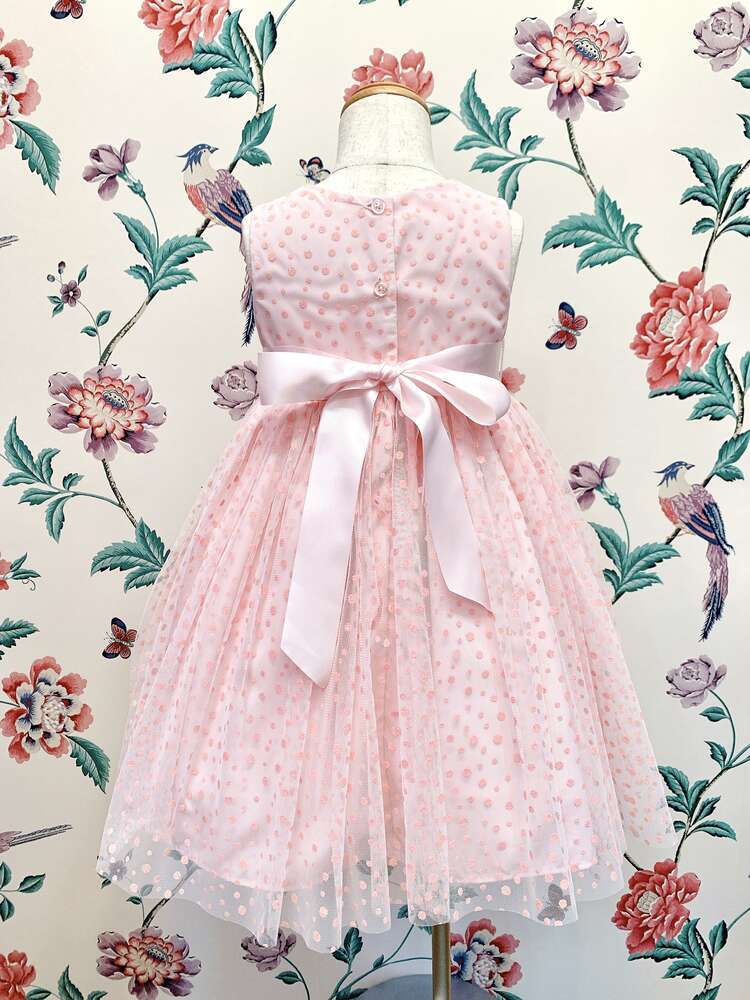 淡いパステルピンクに小さなドット模様が全体に広がるとてもキュートなデザインドレス。 ウエストのサテンリボンは、前でも後ろでも結べるのでお子様の雰囲気に合わせることができます 比較的ボリュームの出るパニエタイプの裏地も付いていますので、ふんわりとしたシルエットで可愛いです!4歳前後のお子様におススメです。全体がチュール素材ですので結婚式などの華やかな場にピッタリ。