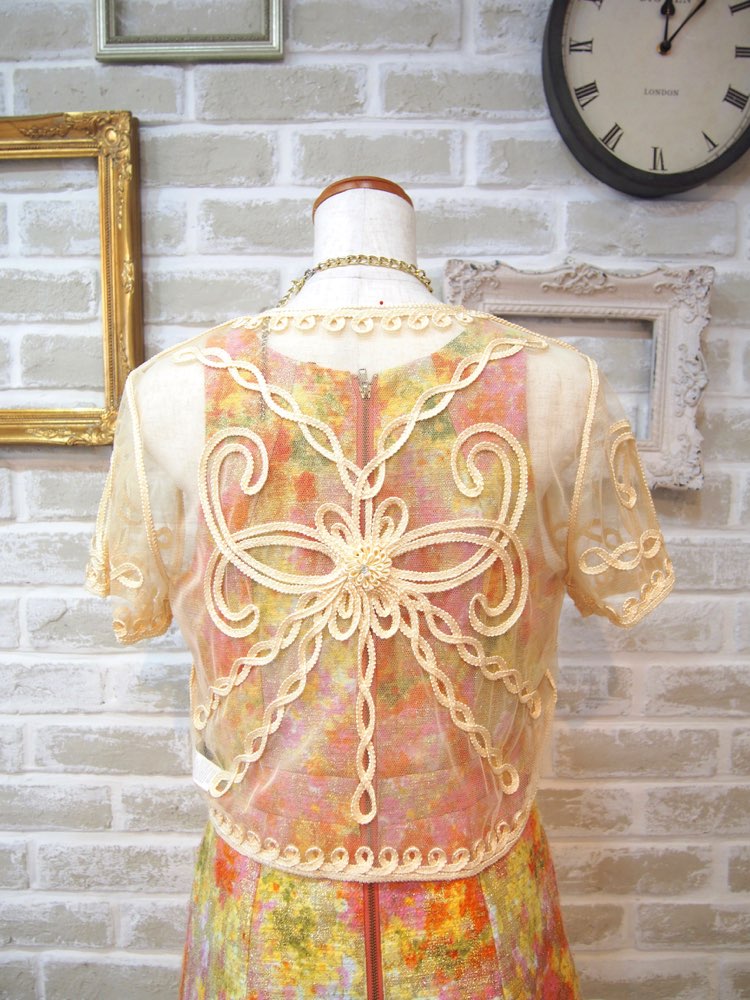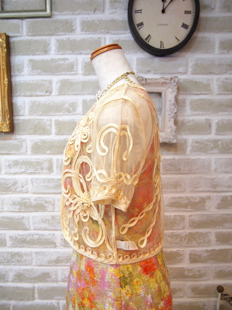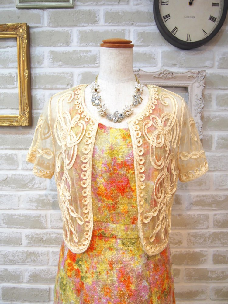 クリームカラーのジャケット風ボレロ。襟にはホックがついており胸元をカバーしてくれます。夏場の着用におすすめな透け感のあるチュール生地に大きな刺繍が個性的で、装飾や刺繍のないシンプルな生地感のドレスにぴったり。また、丈が一般的なボレロに比べて長めの腰上丈なので Iラインシルエットのドレスと相性◎です。ボリュームがあるタイプとは違って甘い雰囲気にならず、幅広い年代の方にご利用いただけます。大柄レースは顔映りがぼやけることもなく、コーディネートの主役として全体にメリハリを与えてくれます。結婚式お呼ばれなど落ち着きのあるドレスアップがふさわしいフォーマルなシーンにおすすめしたいアイテムです。
