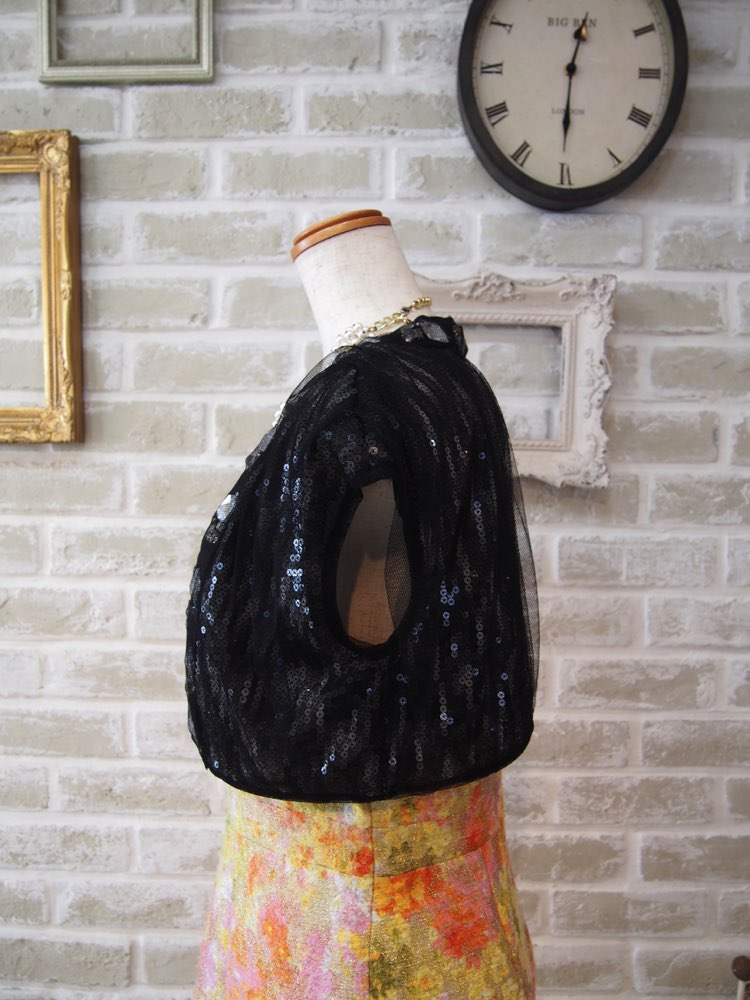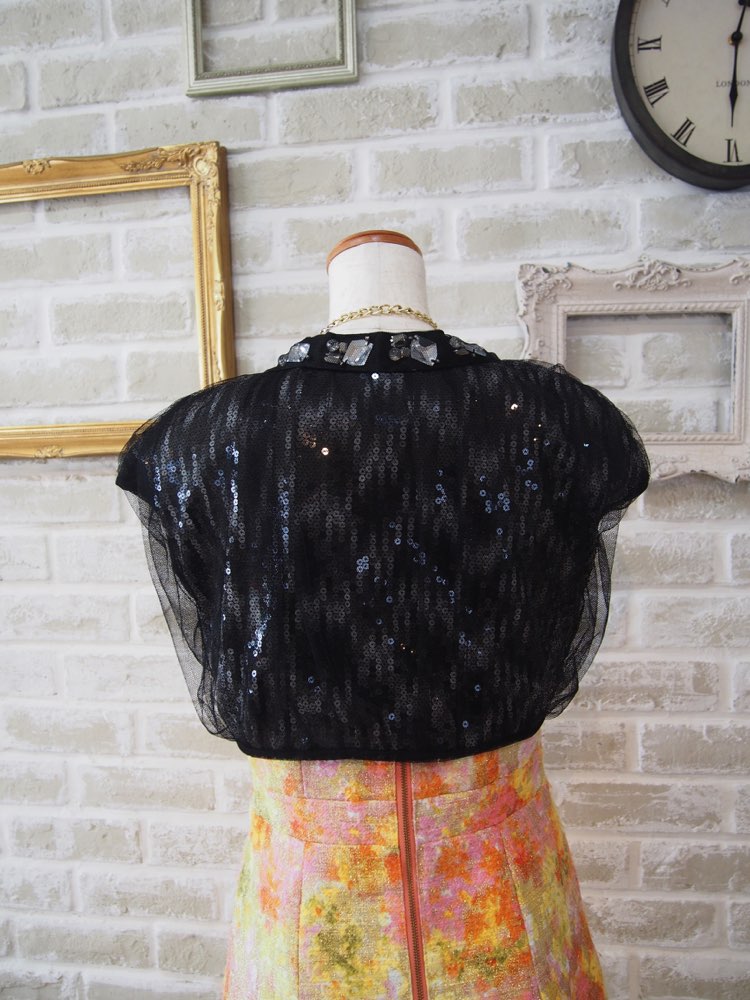 ブラックのスパンコール生地にチュールを重ねた個性的でクールな雰囲気のボレロ。襟からサイドにかけては大き目のビジューをランダムに配した煌びやかなディテールの詰まったデザインです。その華やかさとバランスを取るように、シルエットはコンパクトで袖は腕をスッキリ出すフレンチスリーブ。シンプルなドレスとのコーディネートにアクセサリー感覚で取り入れるのが◎です。結婚式のお呼ばれのイメージが強いボレロですが、こちらはイベントやディナーショーなど華やかなシーンでパーティードレスと組み合わせてご利用いただくのがおすすめです。
