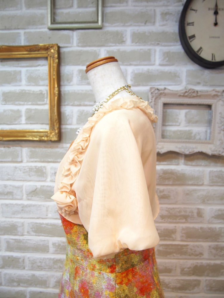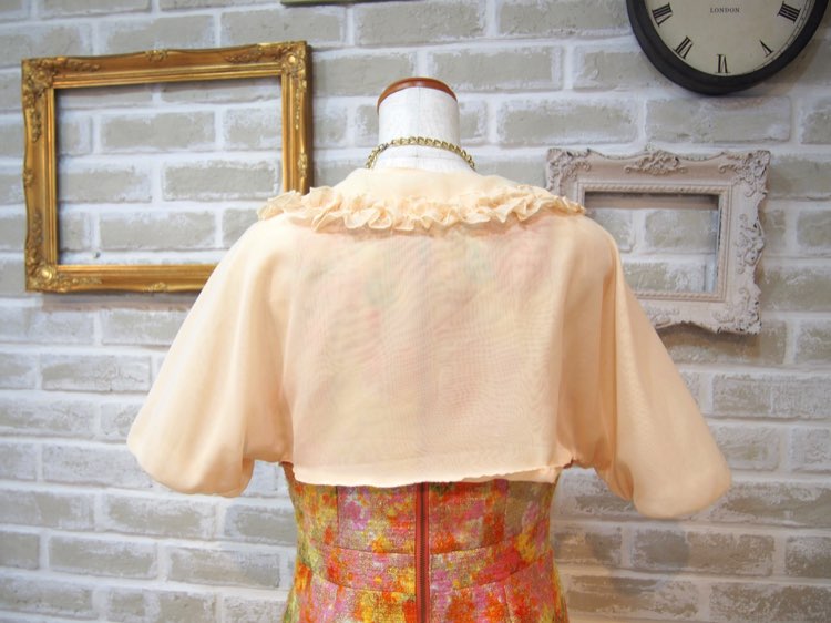クリームカラーのドルマンスリーブボレロ。ふんわりとしたシルエットのドルマンタイプは腕の付け根の締め付けがなく、二の腕をカバーする袖丈です。サイドに入ったフリルが甘く可愛らしい雰囲気で、ガーリーなドレスにぴったり。生地はドレス用ボレロでは一般的はシフォン素材で、重めの生地のドレスにも軽やかさをプラスしてくれます。透け感のある柔らかな生地が、ふんわりとつつまれるような優しげな印象に。存在感のあるサイドのフリルは、羽織るだけでとても華やかなコーディネートへと導いてくれます。結婚式参列から謝恩会、同窓会まであらゆるシーンにおすすめです。