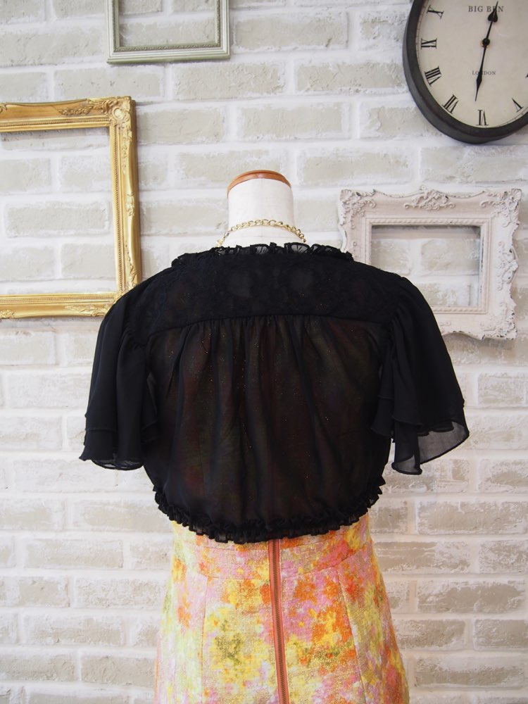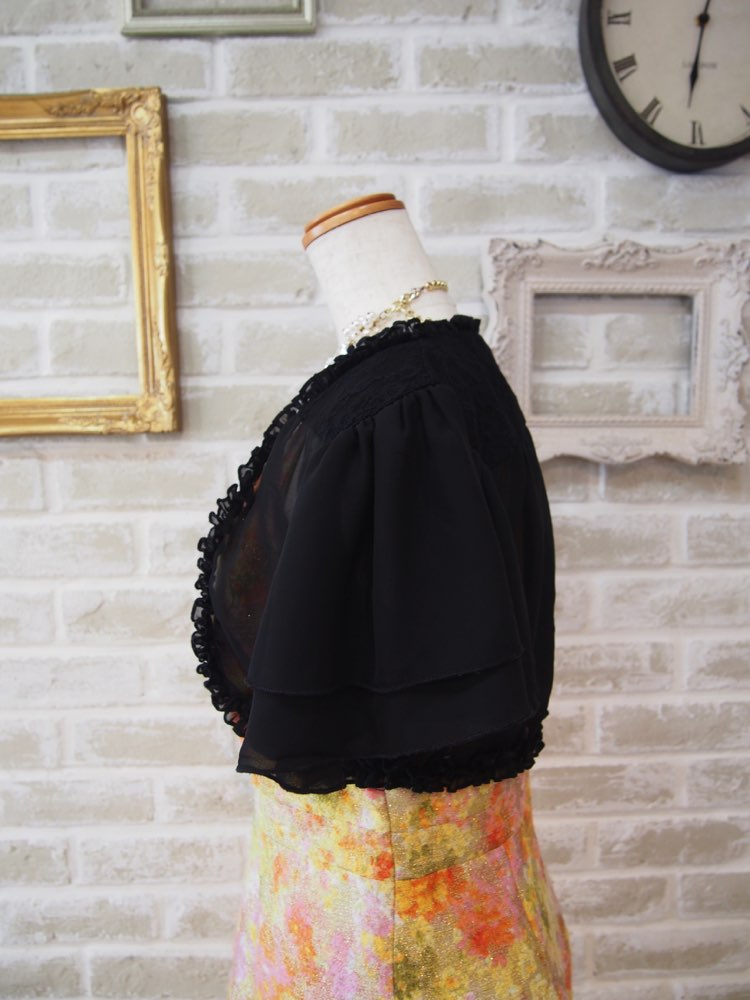 ブラックのティアードスリーブボレロ。重たく見えない短めの袖丈です。首周りから裾にかけて施されたフリルと肩のレース、おまけに段になったフリルの袖が甘く可愛らしい雰囲気で、ガーリーなドレスにぴったり。生地はドレス用ボレロでは一般的はシフォン素材、肩のレースはシフォン生地との二枚重ねです。背中にもフラワーレースを施し、バックスタイルまでぬかりなく華やかさにこだわり、随所に’’カワイイ’’を感じる羽織りものとなっています。結婚式参列から謝恩会、同窓会まであらゆるシーンにおすすめです。
