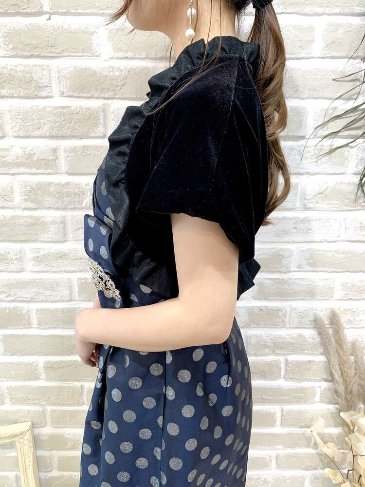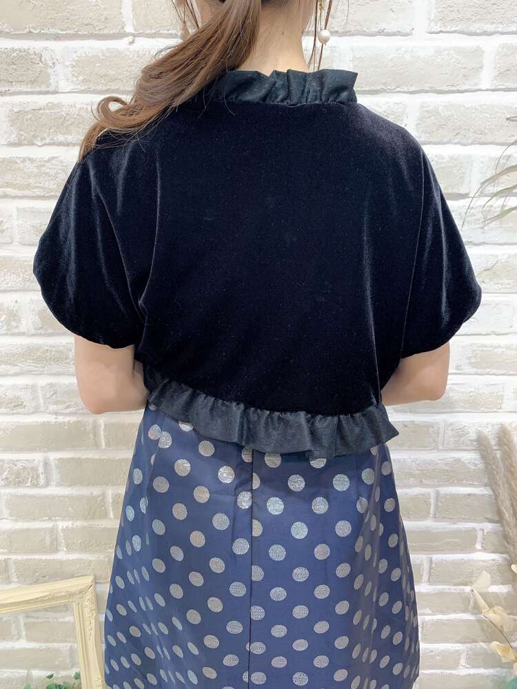 定番カラーブラックのゆったりサイズの秋冬用ボレロ。シンプルなベロア生地をボディに使用し、襟から後ろの裾にかけてはさりげないフリルを上品に配したデザイン。肩の切り替えがない作りなので肩周りをスッキリ見せてくれ、締め付けも少なくストレスのない着心地も兼ね備えています。生地特有のほのかな光沢感も相まって、コーディネートに季節感だけでなく重厚感を与え、華やかでエレガントな雰囲気に。季節物といえばファーの羽織は結婚式ではNGですが、こちらならお呼ばれでも安心して着用できますね。