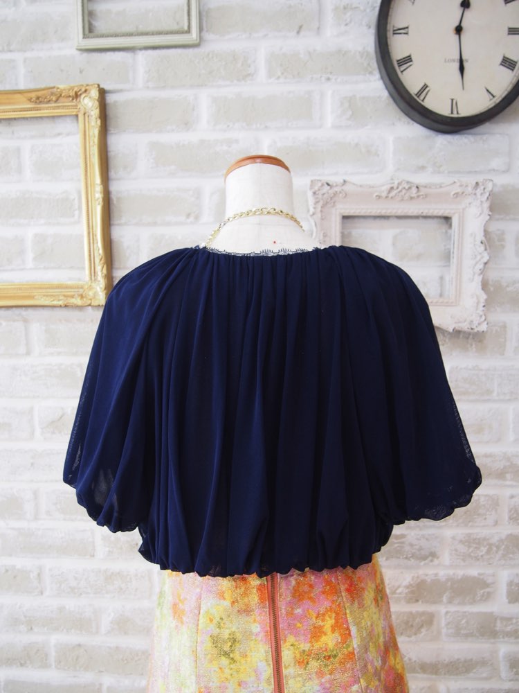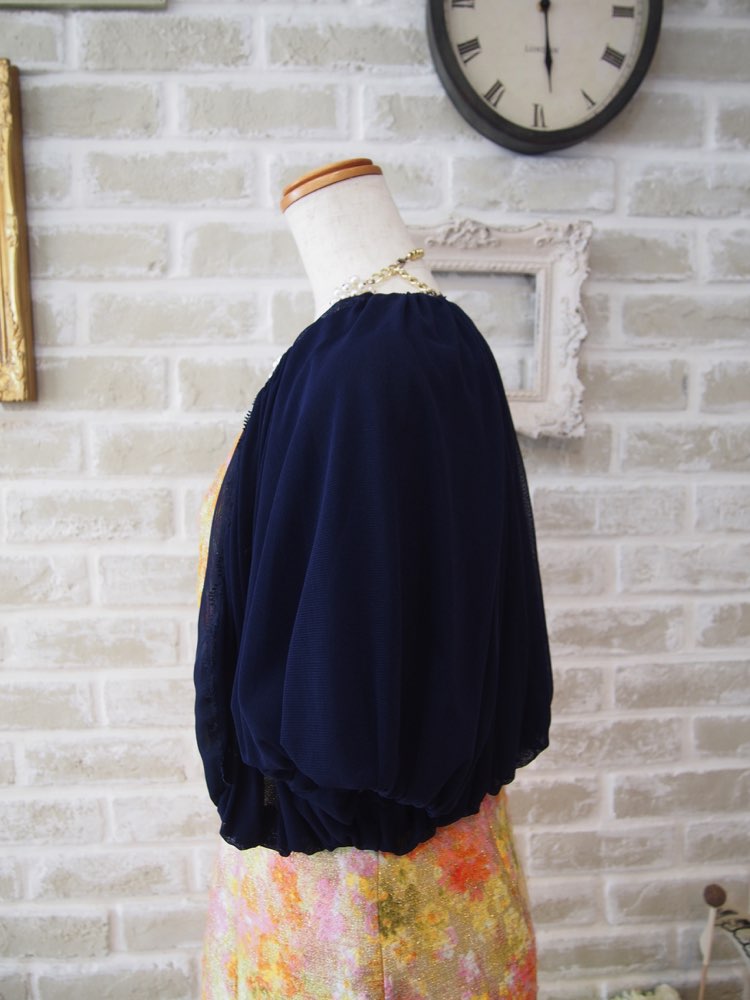 ネイビーのバルーンスリーブボレロ。ゆったりサイズの肘上までの袖で、Lサイズ程度を着用される方におすすめ。非常に柔らかくくたっとした生地はバルーンデザインに多い着膨れの心配もありません。また、さりげなくレースで縁取ったデザインはフェミニンで柔らかさがあります。ドレス自体の雰囲気やデザインを損なうことがなく、あらゆるタイプのドレスとコーディネートが可能。当店でも大人気の万能アイテムです。結婚式お呼ばれなどのフォーマルなシーンや謝恩会や同窓会などの少し華やかなシーンまで、年代を選ばず幅広い用途でおすすめです。