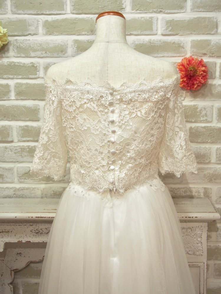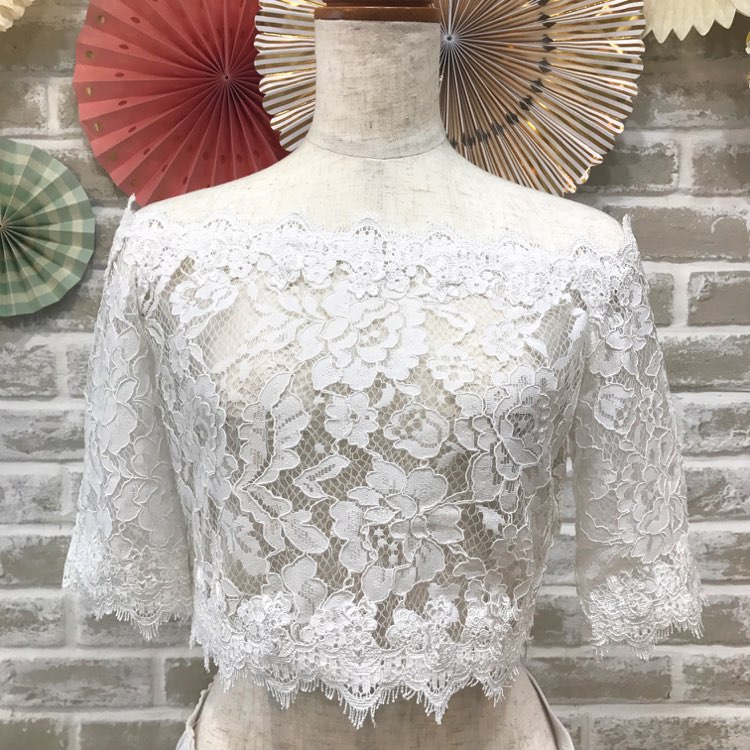 ホワイトカラーのフローラルレースを使用したブライダルボレロ。シンプルなベアドレスと合わせると、オフショルダーの五分袖ドレスに変身します。ツヤを抑えたナチュラルなレースは、ウエディングドレススタイルを上品でピュアなムードで盛り上げてくれます。合わせるドレスの生地感やボリューム・丈感次第で、披露宴・1.5次会・2次会・前撮りまでありとあらゆるシーンでお使いいただけます。飾りのないシンプルなドレスと合わせていただくと、ボレロとドレス両方のイメージを損なうことなく、またアクセサリーはネックレスなしでイヤリングのみで着こなしていただくとナチュラルで洗練されたコーディネートの完成です。