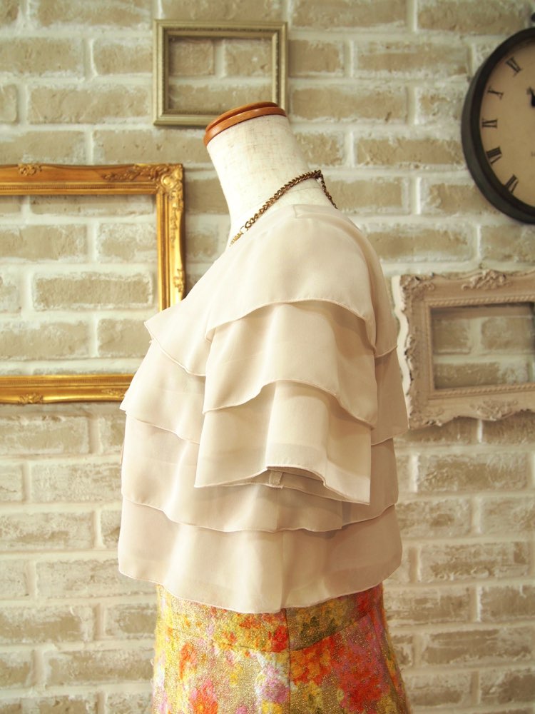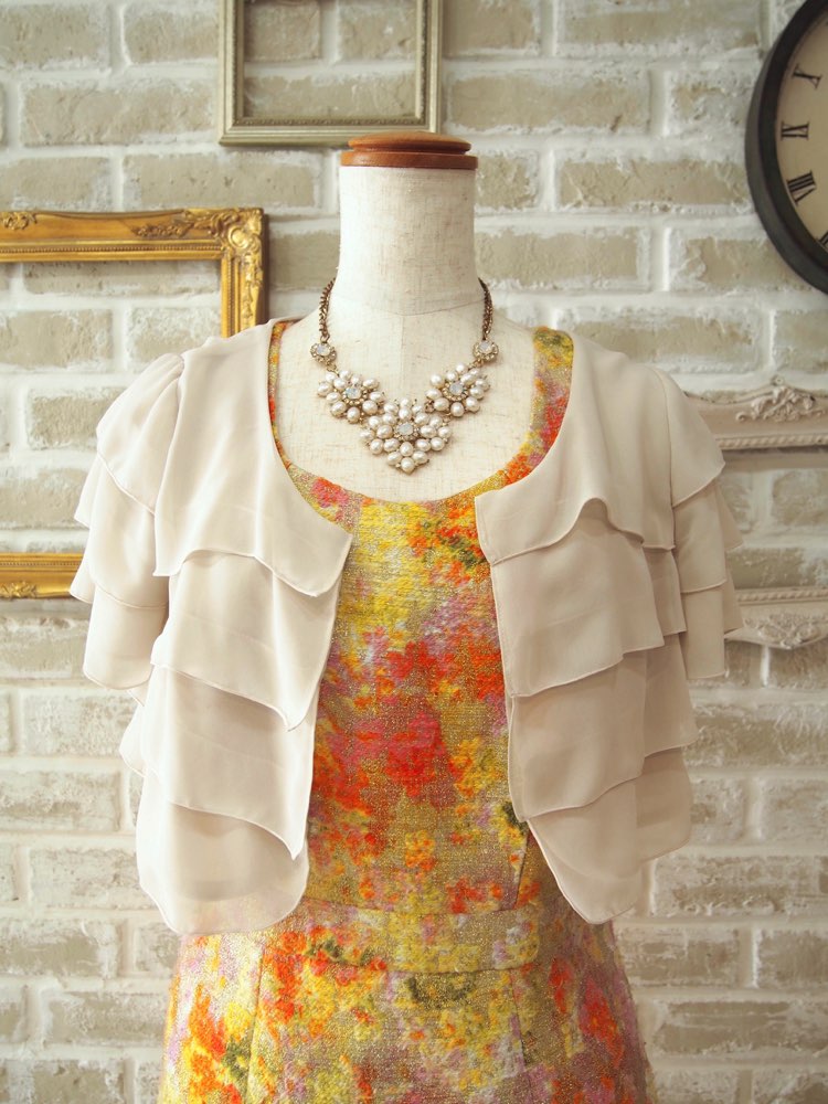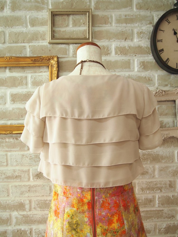 グレージュカラーのシンプルなボレロ。落ち着いたカラーとスッキリと見えるシルエットは上品で落ち着いたイメージに。襟元はホック付きで、胸元を隠したい場合にもおすすめです。柔らかな生地が段になったティアードデザインはヒラヒラと表情が出てフェミニンでエレガントなコーディネートに仕上げてくれます。結婚式お呼ばれなどのフォーマルなシーンにはもちろん、謝恩会やパーティーなどの少し華やかなシーンにもおすすめです。シンプルなデザインはドレスのデザインや雰囲気を選ばず万能で、当店でも人気です。
