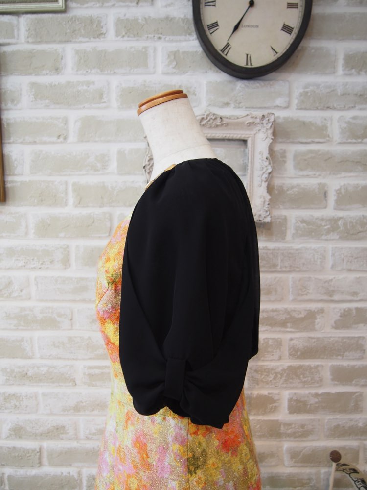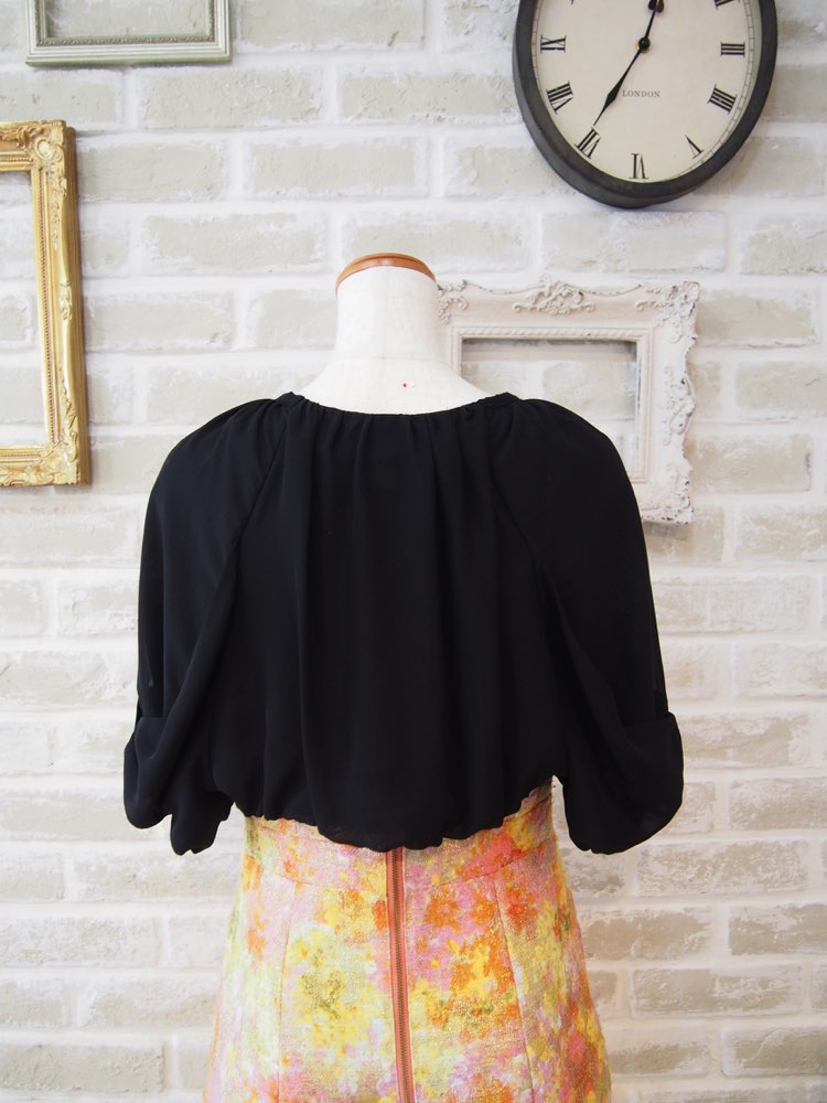 ブラックのリボンデザインバルーンスリーブボレロ。前身頃がなく肩に掛かったような作りで、ドレスのデザインを隠したくない場合におすすめです。袖は肘辺りまである五分袖で、ふんわり包みこむように二の腕をしっかりカバー。生地はドレス用ボレロでは一般的はシフォン素材を使用しています。首元の落ち着いたブロンズカラーのビジューが大人っぽさを漂わせ、明るいカラーのドレスにメリハリを加えるだけでなく、ダークカラーのドレスにもきれいに合わせていただけます。結婚式お呼ばれにはもちろん、パーティーなど華やかなシーンにもおすすめです。