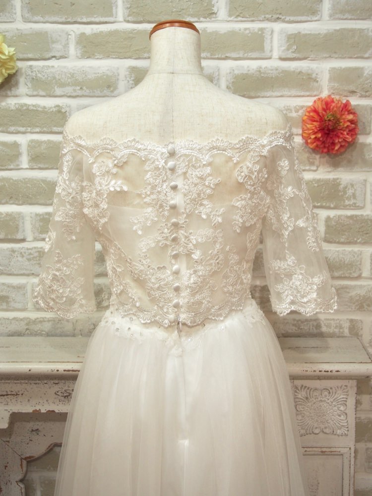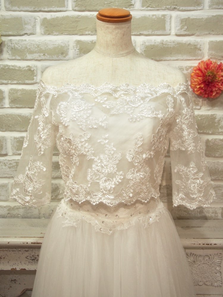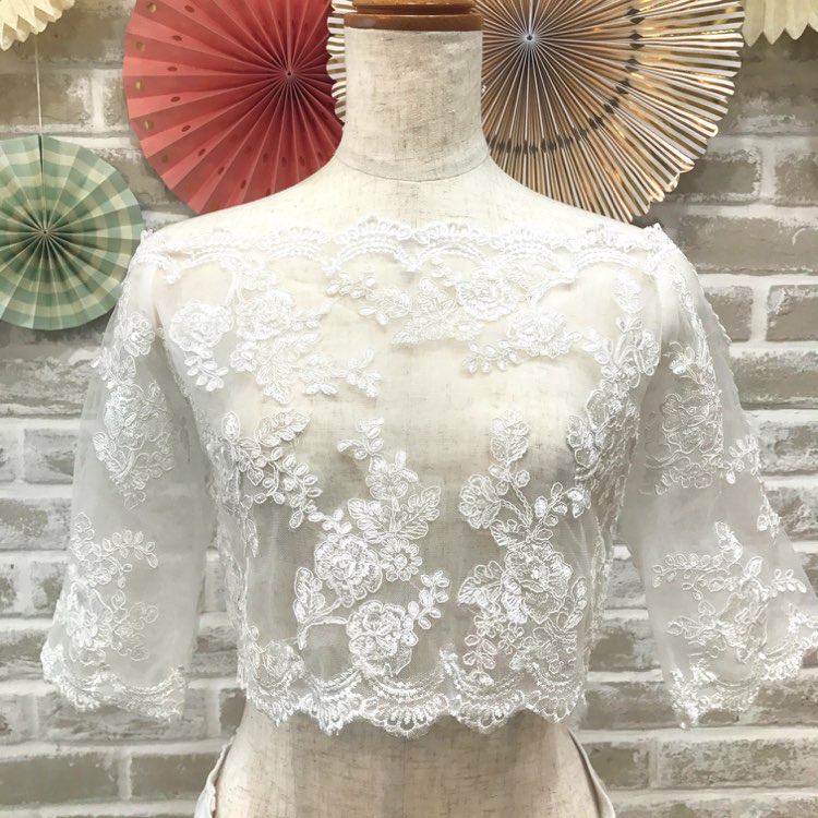 ホワイトカラーのフローラルレースを使用したブライダルボレロ。シンプルなベアドレスと合わせると、オフショルダーの七分袖ドレスに変身します。繊細な刺繍が細部まで施されており、ウエディングドレススタイルを上品でピュアなムードで盛り上げてくれます。合わせるドレスの生地感やボリューム・丈感次第で、披露宴・1.5次会・2次会・前撮りまでありとあらゆるシーンでお使いいただけます。飾りのないシンプルなドレスと合わせていただくと、ボレロとドレス両方のイメージを損なうことなく、またアクセサリーはネックレスなしでイヤリングのみで着こなしていただくとナチュラルで洗練されたコーディネートの完成です。