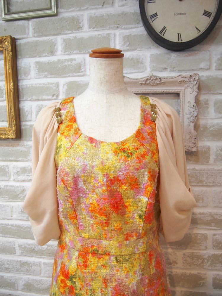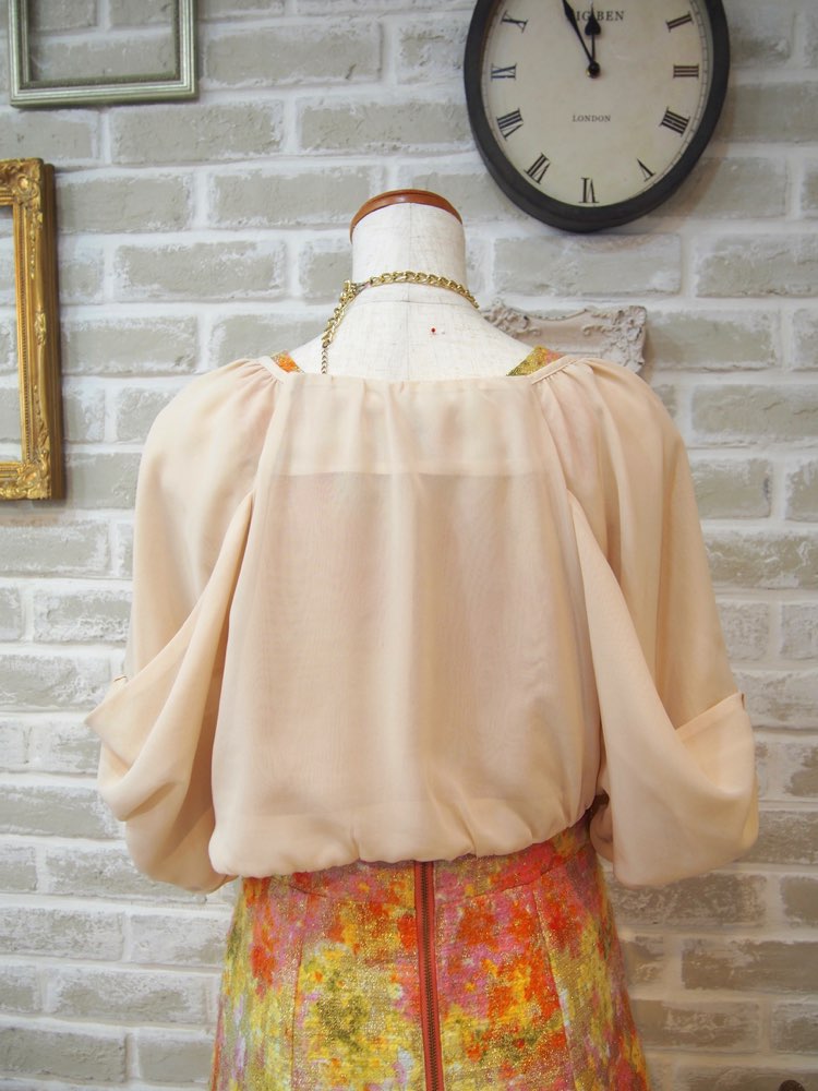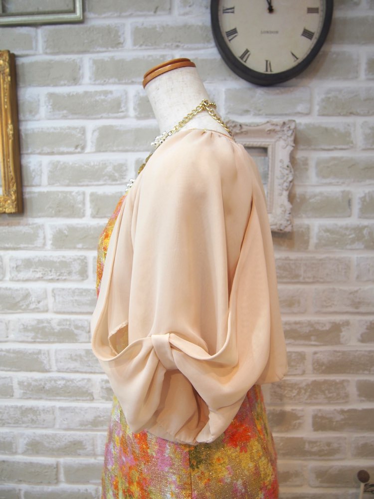 ベージュのリボンデザインバルーンスリーブボレロ。前身頃がなく肩に掛かったような作りで、ドレスのデザインを隠したくない場合におすすめです。袖は肘辺りまである五分袖で、ふんわり包みこむように二の腕をしっかりカバー。生地はドレス用ボレロでは一般的はシフォン素材を使用しています。首元の落ち着いたブロンズカラーのビジューが大人っぽさを漂わせ、スッキリしたシルエットのドレスに合わせると袖とのバランスが良くかっこよく着こなしていただけます。結婚式お呼ばれにはもちろん、謝恩会やパーティーなど華やかなシーンにもおすすめです。