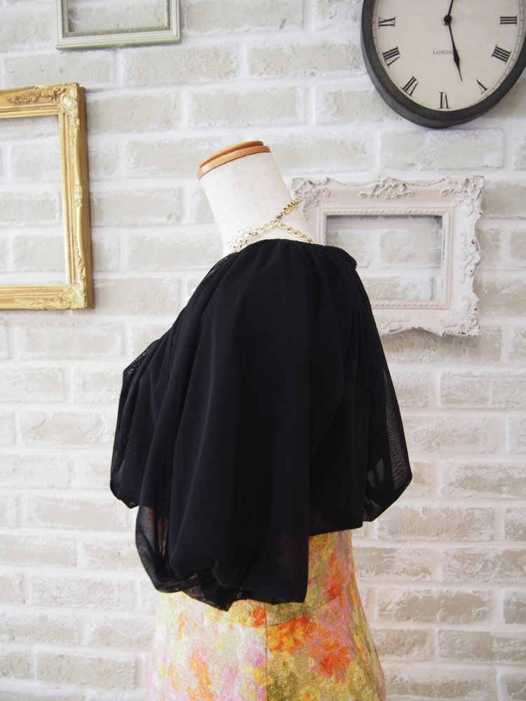 ブラックのシンプルなボレロ。キラッと光る大きなストーンのボタンが一粒付いており、前を留められる仕様です。柔らかな生地が軽さをプラスしてくれ、重い生地感のドレスにもバランスよく組み合わせることができます。また、肩の切り替えが無いデザインは、肩周りをスッキリ見せてくれる効果も。ドレス自体の雰囲気やデザインを損なうことがなく、あらゆるタイプのドレスとコーディネートが可能です。さらに羽織った時の形が綺麗で、当店でも大人気の万能アイテムです。結婚式お呼ばれなどのフォーマルなシーンや謝恩会や同窓会などの少し華やかなシーンまで、年代を選ばず幅広い用途でおすすめです。