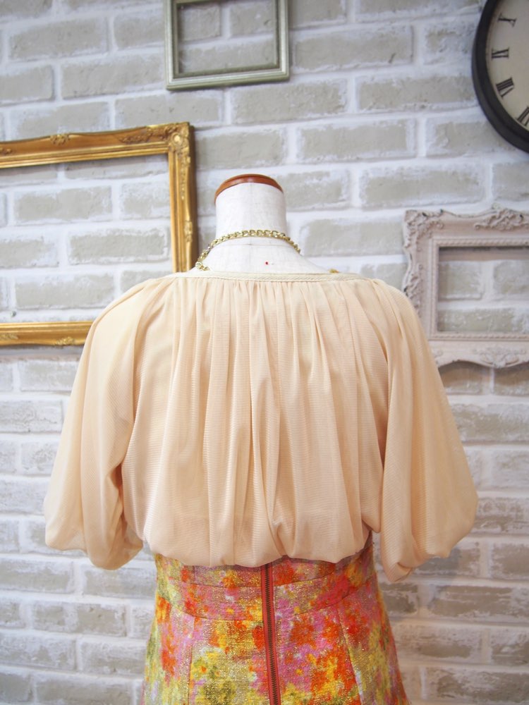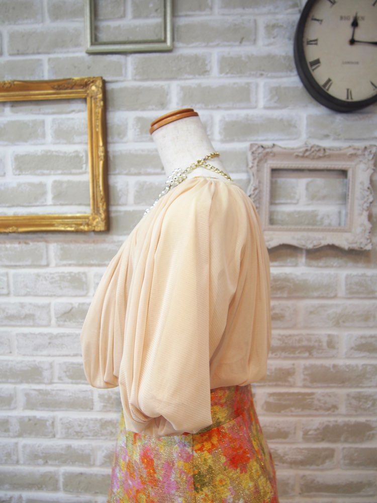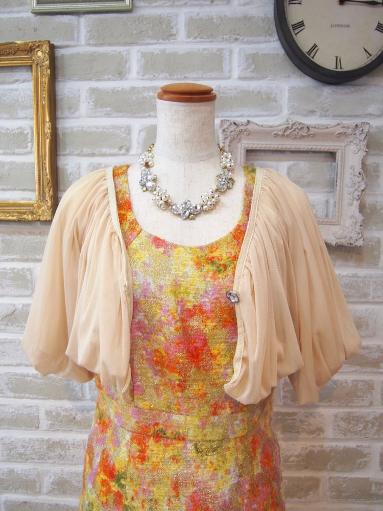 ベージュのシンプルなボレロ。キラッと光る大きなストーンのボタンが一粒付いており、前を留められる仕様です。柔らかな生地が軽さをプラスしてくれ、重い生地感のドレスにもバランスよく組み合わせることができます。また、肩の切り替えが無いデザインは、肩周りをスッキリ見せてくれる効果も。ドレス自体の雰囲気やデザインを損なうことがなく、あらゆるタイプのドレスとコーディネートが可能です。さらに羽織った時の形が綺麗で、当店でも大人気の万能アイテムです。結婚式お呼ばれなどのフォーマルなシーンや謝恩会や同窓会などの少し華やかなシーンまで、年代を選ばず幅広い用途でおすすめです。