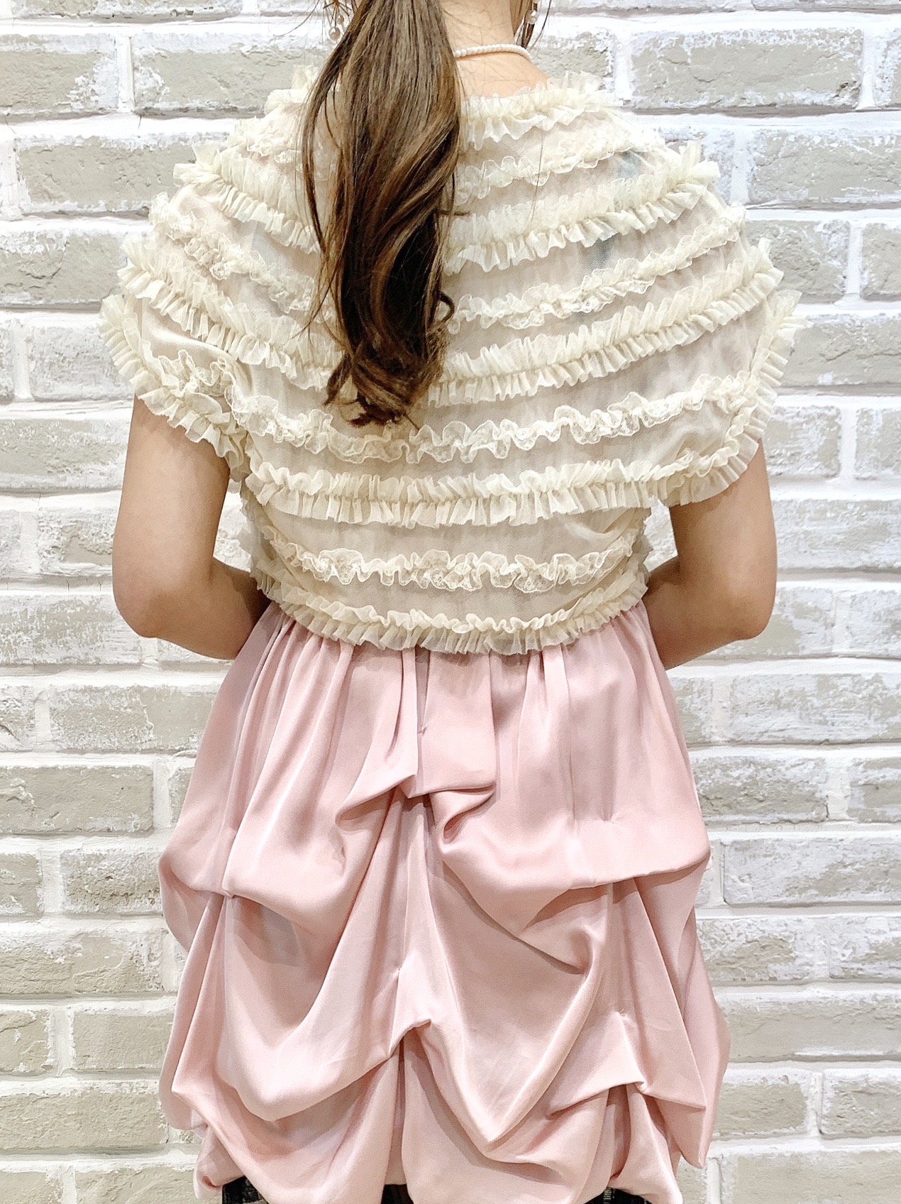 アイボリーのミックスレースボレロ。肩の切り替えが無いタイプは肩周りをスッキリ見せ、肩幅が気になる方にもおすすめです。また、ドルマンタイプは腕の付け根の締め付けもありません。チュールのフリルとレースを交互に並べた贅沢なデザインはスイートな雰囲気で、ガーリーなドレスに組み合わせるとさらに可愛らしさを盛り上げてくれ、シンプルなドレスに合わせた場合にも程よく華やかさを添えてくれます。小技の効いたディテールでありながら、コンパクトなシルエットでコーディネートに使いやすいアイテムです。10~20代の方の結婚式お呼ばれスタイルや、謝恩会・同窓会などのドレスアップスタイルにもお使いいただけます。