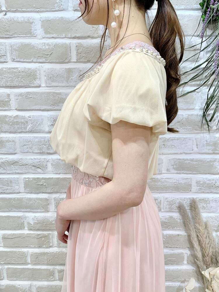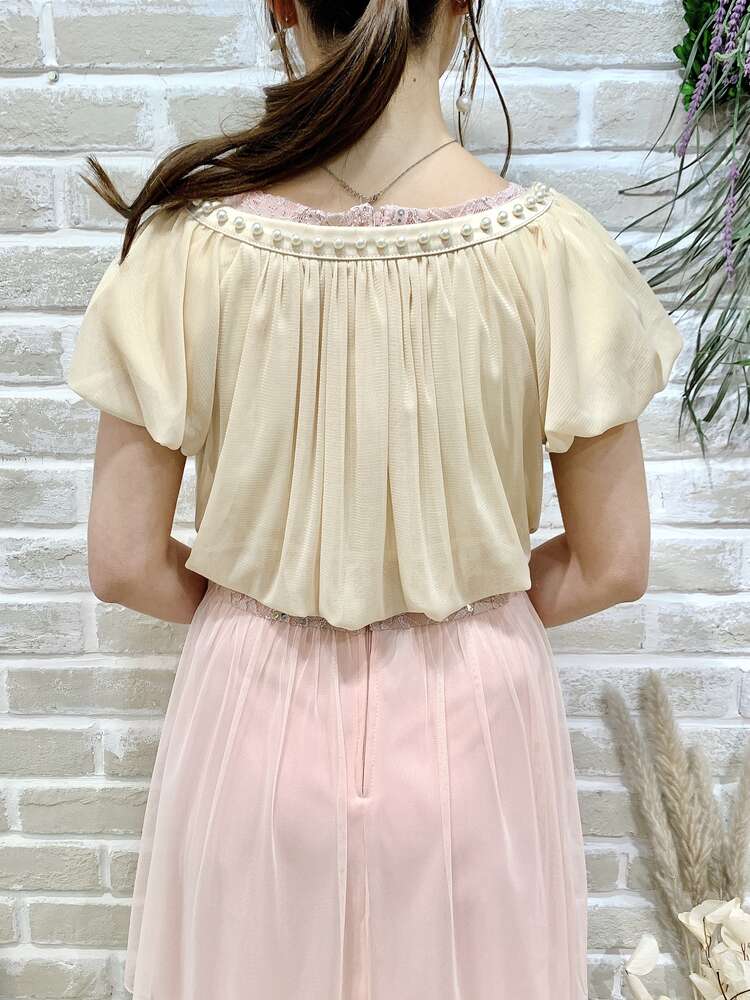 ベージュのパフスリーブボレロ。パールが上品に並んだ襟にはホックがついており胸元をカバーしてくれて、ネックレス要らず。首元のパールが可愛らしい印象で、コーディネートに華やかさを与えてくれますので、普段ネックレスを着け慣れない方や、金属アレルギーでネックレスが着けられない方にもアクセサリー代わりとしてご利用いただけます。生地はドレス用ボレロでは一般的はシフォン素材です。スッキリとしたショート丈のバルーンスリーブは、あらゆるシルエットのドレスもフェミニンでエレガントな雰囲気に仕上げてくれます。結婚式お呼ばれや同窓会にぜひ。