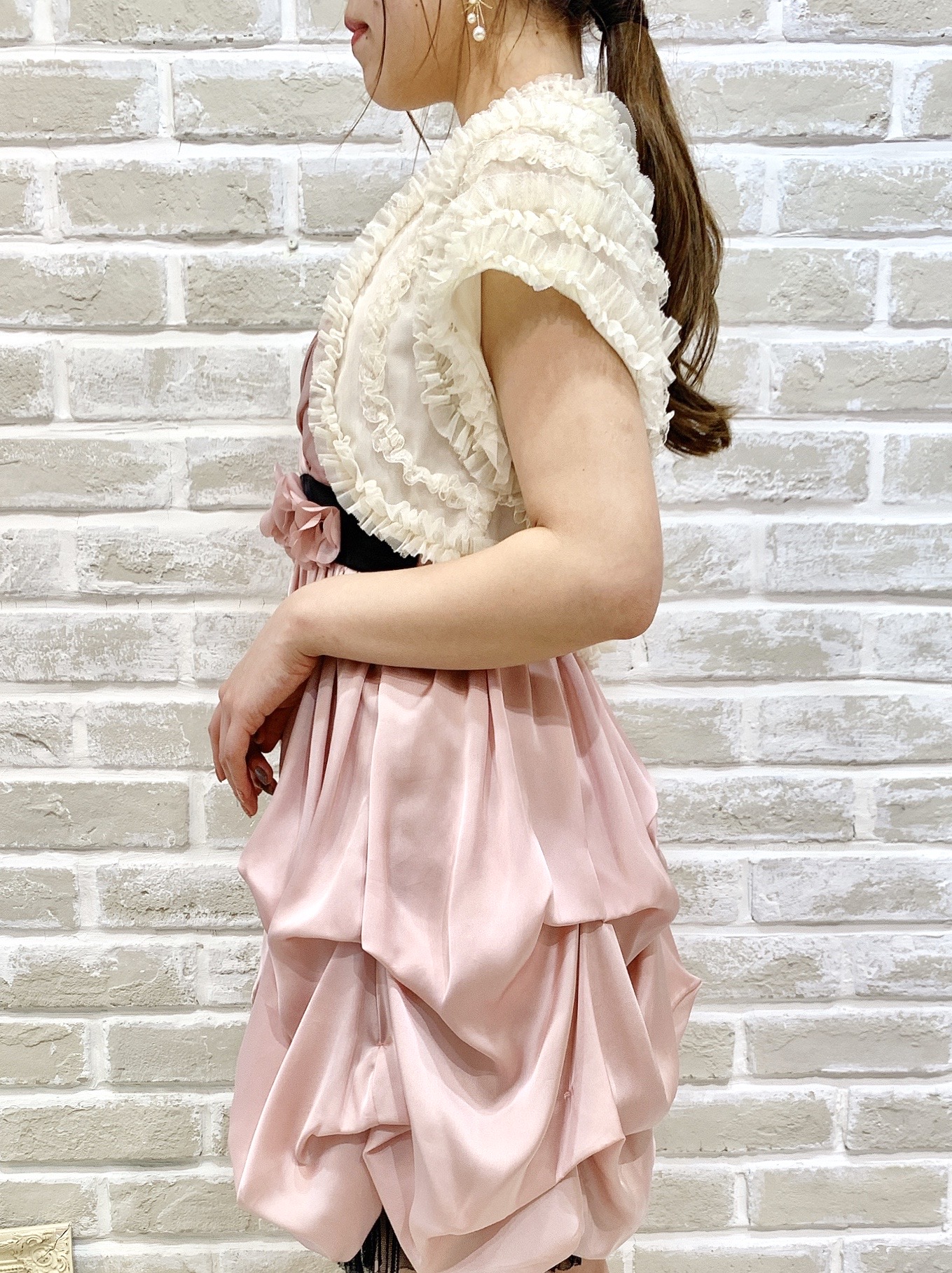 アイボリーのミックスレースボレロ。肩の切り替えが無いタイプは肩周りをスッキリ見せ、肩幅が気になる方にもおすすめです。また、ドルマンタイプは腕の付け根の締め付けもありません。チュールのフリルとレースを交互に並べた贅沢なデザインはスイートな雰囲気で、ガーリーなドレスに組み合わせるとさらに可愛らしさを盛り上げてくれ、シンプルなドレスに合わせた場合にも程よく華やかさを添えてくれます。小技の効いたディテールでありながら、コンパクトなシルエットでコーディネートに使いやすいアイテムです。10~20代の方の結婚式お呼ばれスタイルや、謝恩会・同窓会などのドレスアップスタイルにもお使いいただけます。