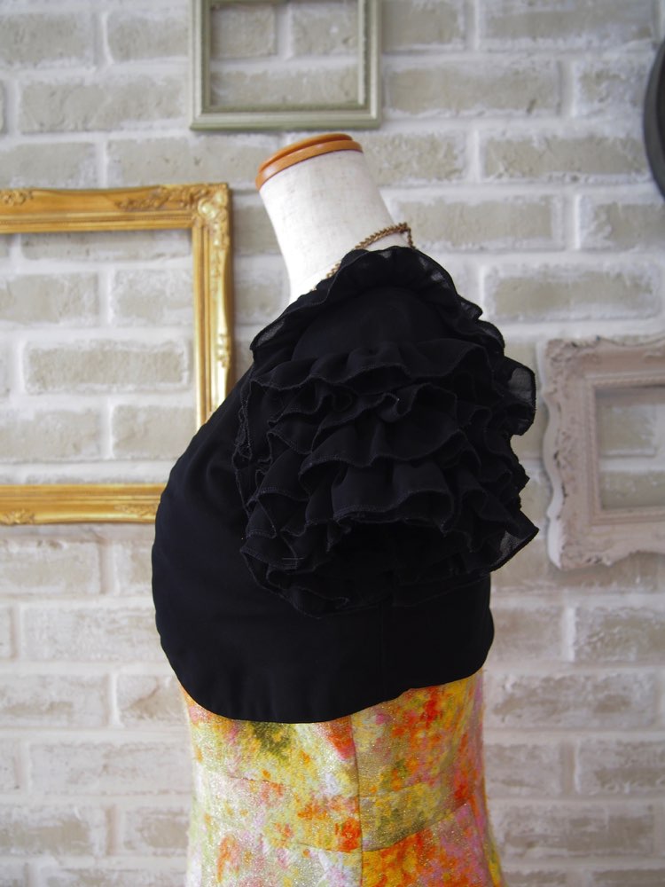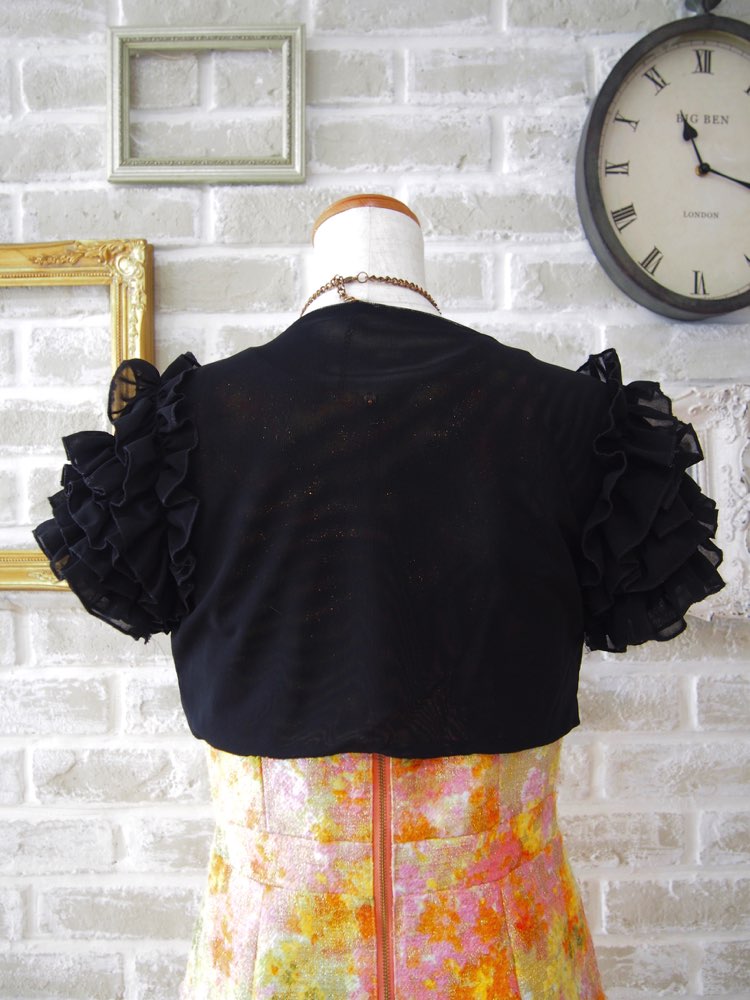 ブラックのティアードフリルボレロ。ボリュームのあるフリルはインパクトがあり甘く可愛らしい印象で、ドレスにガーリーでキュートなテイストを加えてくれます。柔らかく肌触りのいい生地を使用していますので、10~20代の初めてドレスを着るという方にもストレスなく着用していただけます。シンプルなドレスと組み合わせたり、ネックレスを着けないor小さいものにする場合に、コーディネートを盛り上げる一つのアクセントとしていかがでしょうか。謝恩会や女子会、パーティーなど、華やかでエネルギッシュなドレスアップスタイルに挑戦できるシーンにもおすすめです。