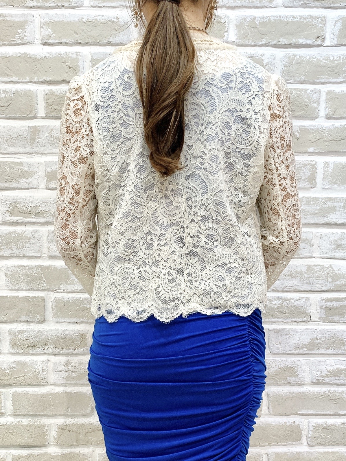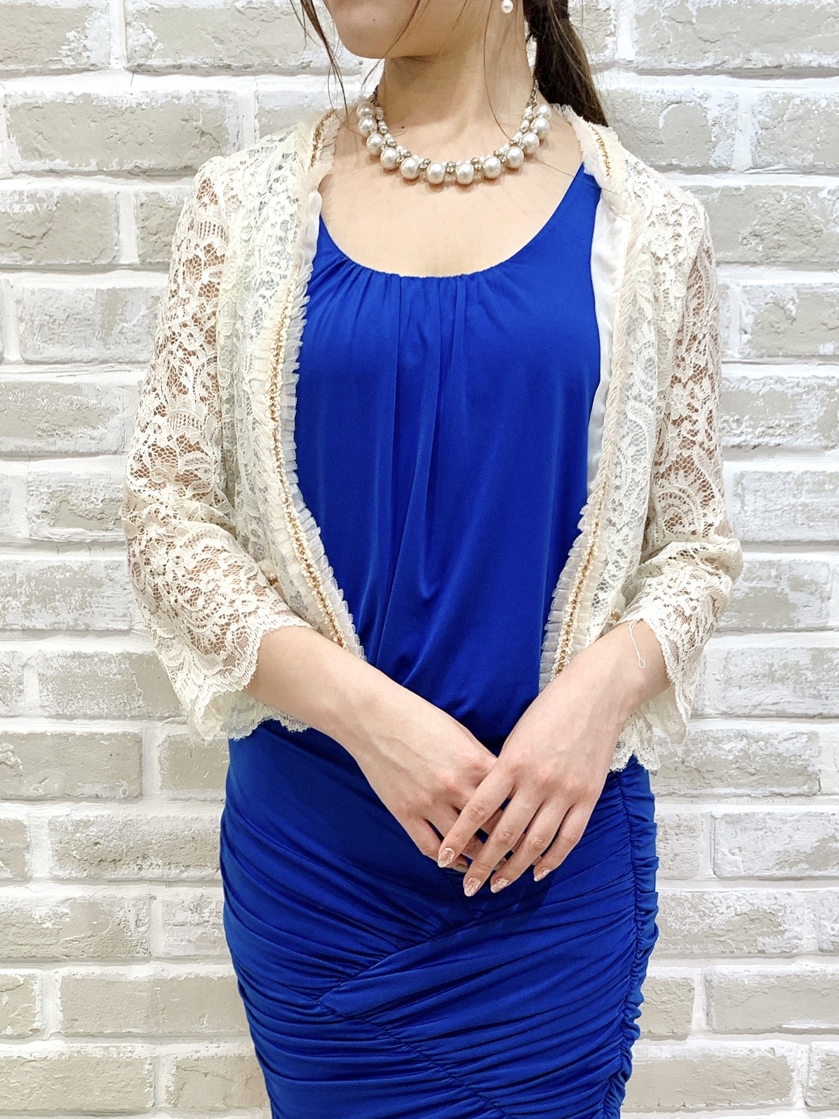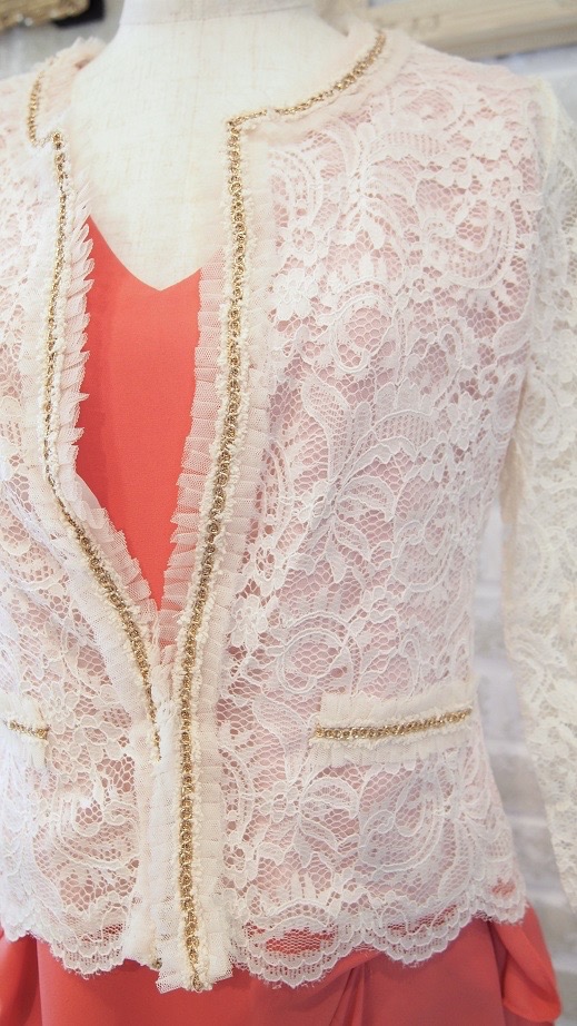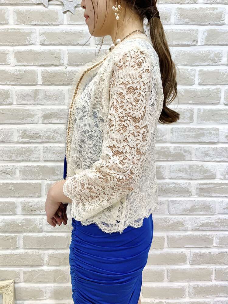 シンプルなドレスにぴったりなアイボリーのシースルーレースの七分袖ジャケット。透け感のある薄手の生地に、ゴールドのチェーン風テープが襟周りとポケット風に配されてエレガントな雰囲気に。パーティーやディナー、食事会など華やかさを残しつつドレスをカジュアルダウンさせて着こなしたいシーンにおすすめです。逆にカジュアルなワンピースや手持ちのお洋服と組み合わせて普段よりも少しドレスアップしたい場合にも。フェミニンなデザインが、コーディネートの主役となってパッと明るく華やぎを添えてくれます。