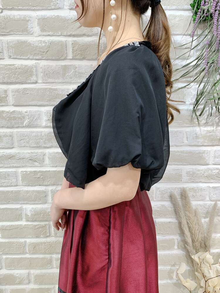 ふんわりフォルムが可愛らしいブラックカラーのバルーン袖ボレロ。二の腕をカバーする袖丈で、肩の切り替えが無いボレロは肩まわりをスッキリ見せてくれます。襟にはビジューのついたベロアテープを使用しており、顔周りに華やかさと少しの重厚感をプラスしてくれます。華やかでありつつも、落ちつきも兼ね備えているボレロは、年齢問わずお楽しみいただけますね。ベージュやパステルなど明るいカラーのドレスだけでなく、ダークカラーのドレスにも綺麗に合わせていただけます。ビジューが華やかで、シンプルなドレスにアクセサリー感覚でプラスするのがおすすめです。結婚式参列から、パーティーシーンにまで秋冬のドレスアップに幅広くお使い頂けます。