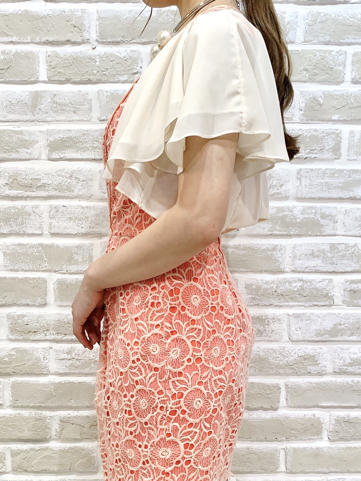 アイボリーカラーのシンプルなボレロ。落ち着いた色味とボリュームを抑えたシルエットは、コーディネートに上品で清楚な雰囲気をプラスしてくれます。ボレロに多いふんわり感と甘さを抑えたフリルスリーブは肩周りをスッキリ見せてくれます。また、柔らかなシフォン生地が軽さをプラスしてくれ、重い生地感のドレスにもバランスよく組み合わせることができます。ドレス自体の雰囲気やデザインを損なうことがなく、あらゆるタイプのドレスとコーディネートが可能です。さらに羽織った時の形が綺麗で、当店でも大人気の優秀かつ万能なアイテムです。結婚式お呼ばれなどのフォーマルなシーンや謝恩会や同窓会などの少し華やかなシーンまで、年代を選ばず幅広い用途でおすすめです。