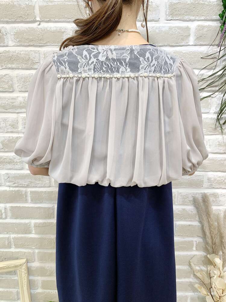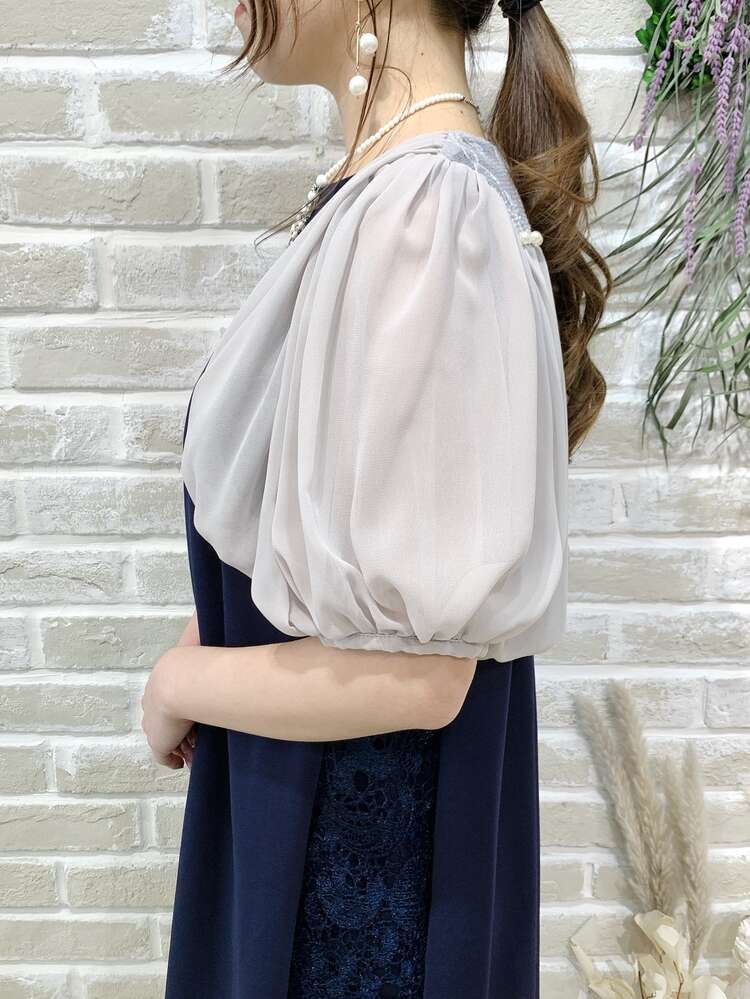 ふんわりフォルムが可愛らしいグレーのバルーン袖ボレロ。二の腕をカバーする袖丈。生地はドレス用ボレロでは一般的はシフォン素材です。背中のレース生地とパールがバックスタイルまでぬかりなく華やかにしてくれます。アイボリーやベージュのボレロだと可愛くなりすぎて苦手という方にも、柔らかさがありつつも甘くなりすぎずおすすめのカラーです。明るいカラーのドレスだけでなく、ダークカラーのドレスにも綺麗に合わせていただけますよ。結婚式参列から、パーティーシーンにまで幅広くお使い頂けます。