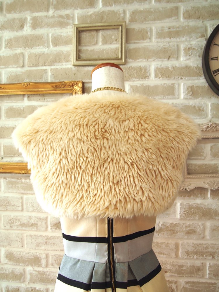 アイボリーのシンプルなフェイクファーボレロ。ファー生地のゴージャス感を程よく抑えてくれるコンパクトな作りの短めの袖丈にショート丈で、膨張せずすっきり見せてくれます。また、小柄な方にもバランスばっちりです。冬場のパーティーや謝恩会や成人式等、同じく短め丈のドレスとのコーディネートが相性◎でおすすめです。生地自体はシンプルなのでドレスの雰囲気を選ばず、可愛らしいドレスにも大人っぽいドレスにも、ボリュームのあるドレスにもタイトなドレスにも組み合わせていただけますよ。