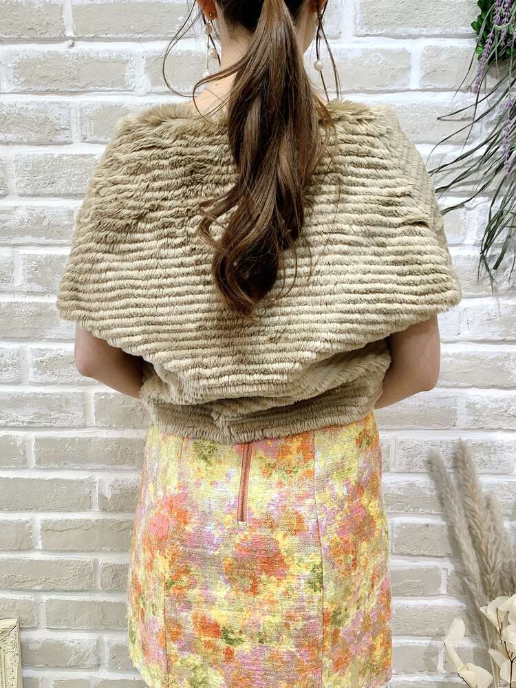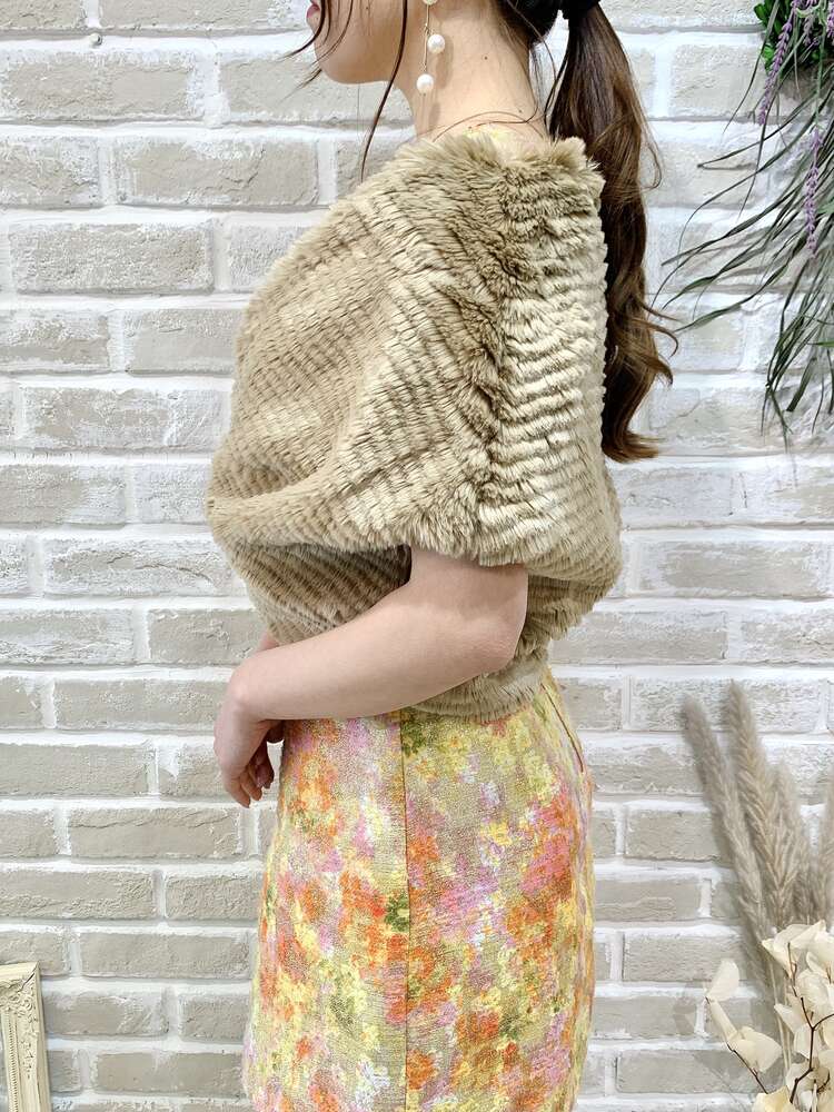 モカブラウンのフロントホックフェイクファーボレロ。肩幅が気になる方にもおすすめの肩の切り替えがなく浅く肩に掛かるようなデザインとゆとりを持たせた長め丈のシルエットが一見ショールのようにも見えます。可愛らしいボレロではなく、パーティー用に大人っぽい雰囲気のファーボレロをお探しの方におすすめ。毛足が短く、毛飛びが気になりにくいのも嬉しいポイントです。ふんわりとボリュームが出るので、スレンダーなシルエットともバランスよく組み合わせていただけます。冬のパーティーで季節感を取り入れたコーディネートをお楽しみください。