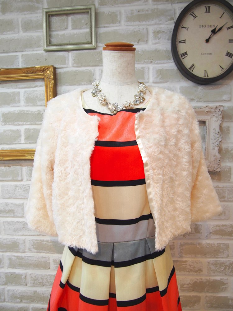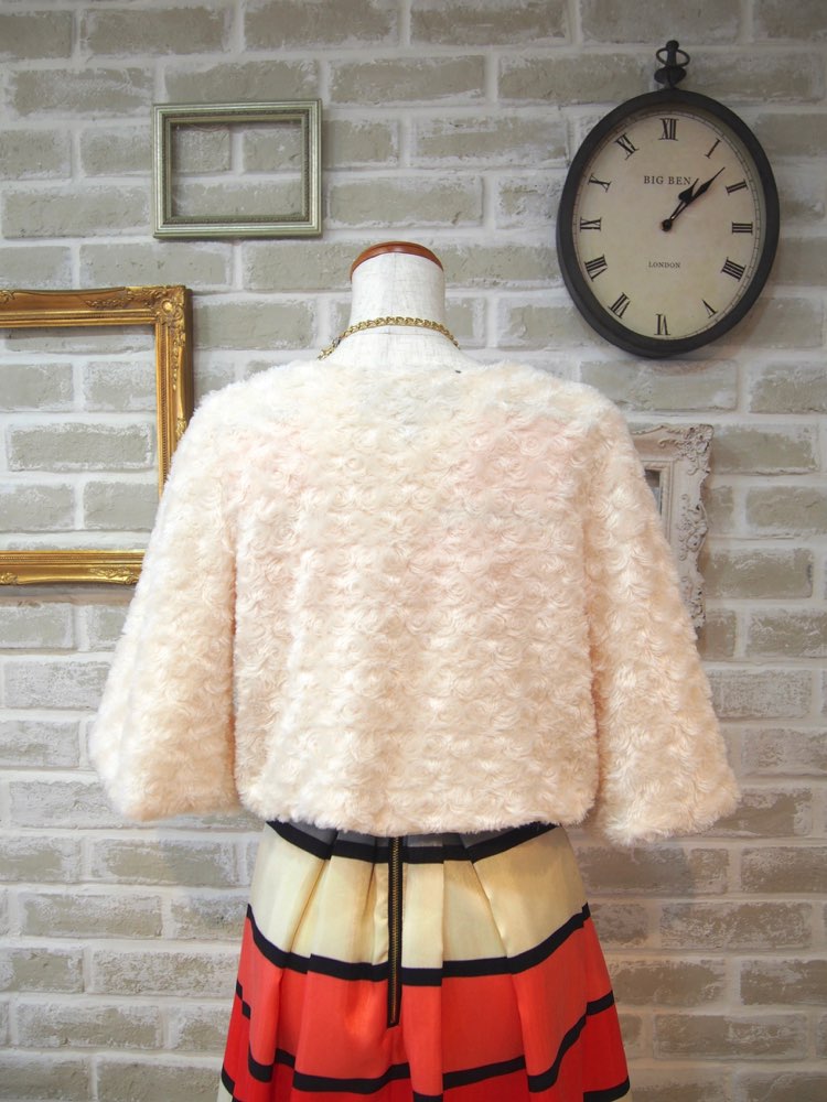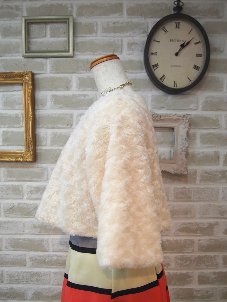 アイボリーのくるくる渦巻きフェイクファージャケット。お花を集めたような優しく可愛らしいデザインです。五分袖のしっかり二の腕カバーの袖丈に毛足の短い薄手の生地感のおかげで、ファー特有の太って見える点が解消され、ファー小物初心者さんにもトライしやすいアイテムとなっております。襟にホックがついており、留めて着るコーディネートも可愛らしくておすすめ。露出を抑え上品で取り入れやすいジャケットタイプなので、謝恩会や成人式の同窓会から、ディナーデートなど冬場のドレスアップスタイルにもぴったりです。コーディネートに迷ったら、シンプルなドレスや、フレアタイプのスカートドレスと合わせてみてくださいね。