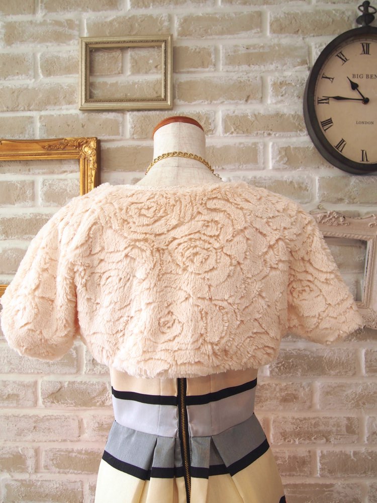 アイボリーカラーのフェイクファーボレロ。大きなバラの模様が加工されており、シンプルなドレスに合わせてもコーディネートのワンポイントとして活躍してくれます。柔らかく優しい質感と色味が可愛らしいイメージで、スッキリとシンプルなシルエットはふんわりと広がるシルエットのドレスとも相性抜群です。謝恩会や成人式の同窓会など冬のパーティーに、キュートなコーディネートのお供としていかがでしょうか。毛足が短く、10~20代のドレスアップ初心者の方もトライしやすいアイテムです。