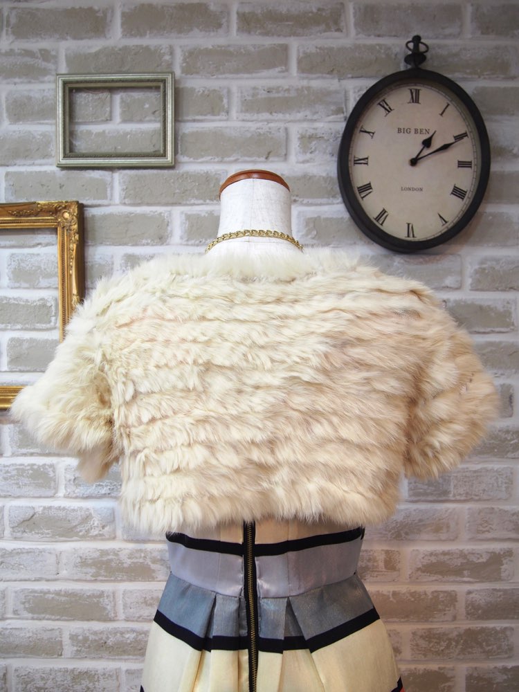 アイボリーのシンプルなラビットファーボレロ。ファー生地のゴージャス感を程よく抑えてくれるコンパクトな作りの短めの袖丈にショート丈で、膨張せずすっきり見せてくれます。また、小柄な方にもバランスばっちりです。冬場のパーティーや謝恩会や成人式等、同じく短め丈のドレスとのコーディネートが相性◎でおすすめです。生地自体はシンプルなのでドレスの雰囲気を選ばず、可愛らしいドレスにも大人っぽいドレスにも、ボリュームのあるドレスにもタイトなドレスにも組み合わせていただけますよ。