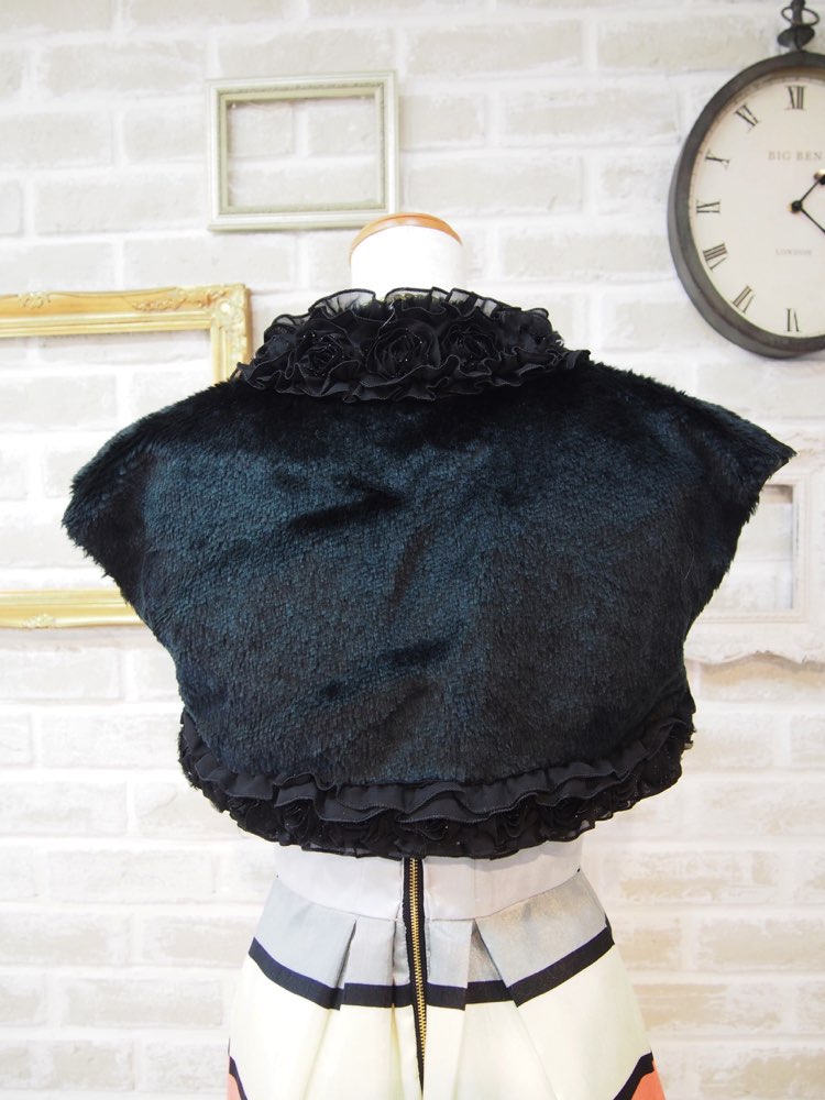 ブラックのフェイクファーボレロ。毛足が短いフェイクファーは毛飛びの心配が少なく、幅広いシーンで使いやすいアイテムです。襟からサイドと後ろの裾にかけて、バラとフリルがボリューミーに施されており、さりげなくラメをちりばめ可愛らしさと華やかさをぎゅっと詰め込んだ贅沢なデザイン。ファー生地のゴージャス感を程よく抑えてくれるコンパクトな作りの短めの袖丈にショート丈で、膨張せずすっきり見せてくれます。また、小柄な方にもバランスばっちりです。冬場のパーティーや謝恩会や成人式等、同じく短め丈のドレスとのコーディネートが相性◎でおすすめです。シックで落ち着きのあるカラーなので可愛らしいドレスにはもちろん、大人っぽいドレスにも組み合わせていただけますよ。