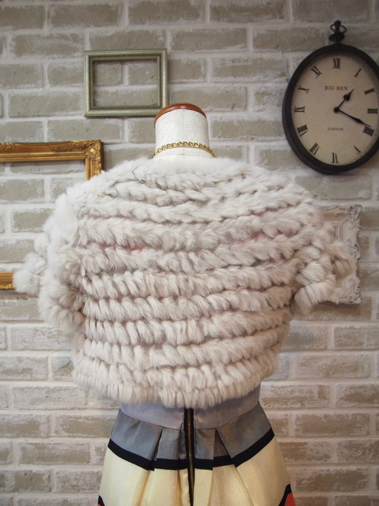 ライトグレーのシンプルなラビットファーボレロ。落ち着きのあるカラーは、明るい色味のドレスにも深い色味のドレスにも季節感とシックで大人っぽい印象をプラスしてくれ、冬場のコーディネートを華やかに盛り上げてくれます。デザイン自体はシンプルなのでどんなスタイルにも取り入れやすく、可愛らしいドレスや大人っぽいドレス、ボリュームのあるドレスにもタイトなドレスにも組み合わせていただけますよ。パーティーや謝恩会や成人式等、華やかなドレスアップスタイルのお供にいかがですか?