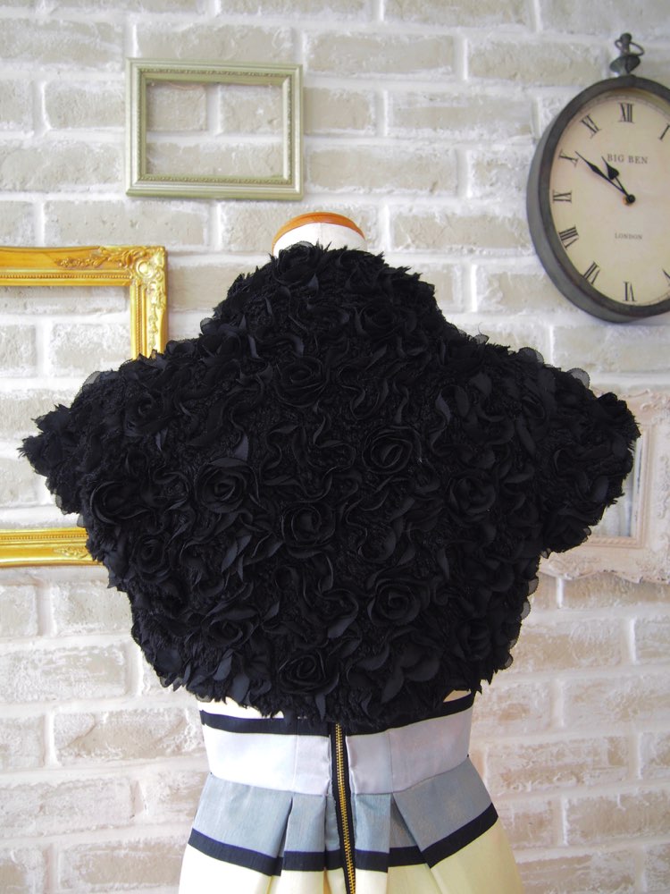 ブラックのボア生地にフラワーフリルを施したボレロ。襟付きで首元が寂しく見えず、短め袖のコンパクトなシルエット。ボア生地なのでファーと違って毛飛びの心配が少なく、幅広いシーンで使いやすいアイテムです。バラモチーフのフリルがびっしりで可愛らしさと華やかさをぎゅっと詰め込んだ贅沢なデザイン。ゴージャス感を程よく抑えてくれるコンパクトな作りの短めの袖丈にショート丈で、膨張せずすっきり見せてくれます。また、小柄な方にもバランスばっちりです。冬場のパーティーや謝恩会や成人式等、同じく短め丈のドレスとのコーディネートが相性◎でおすすめです。シックで落ち着きのあるカラーなので可愛らしいドレスにはもちろん、大人っぽいドレスにも組み合わせていただけますよ。